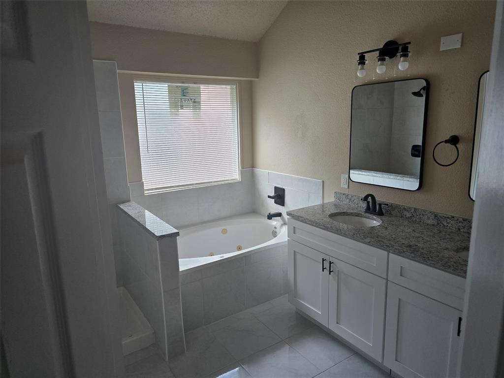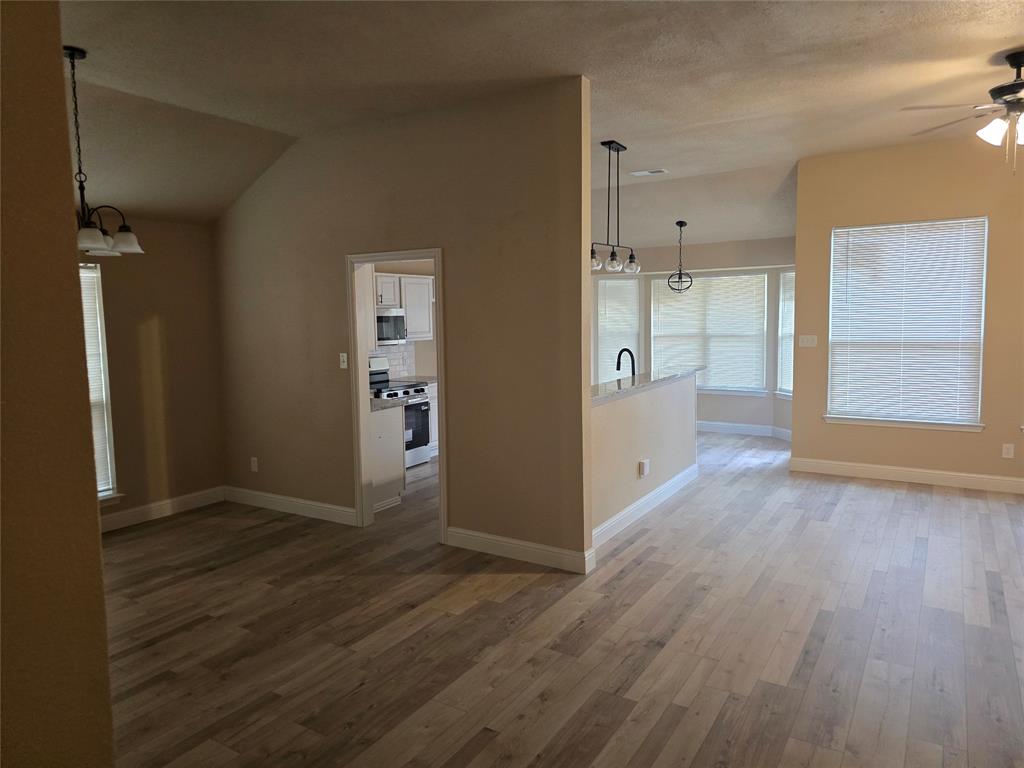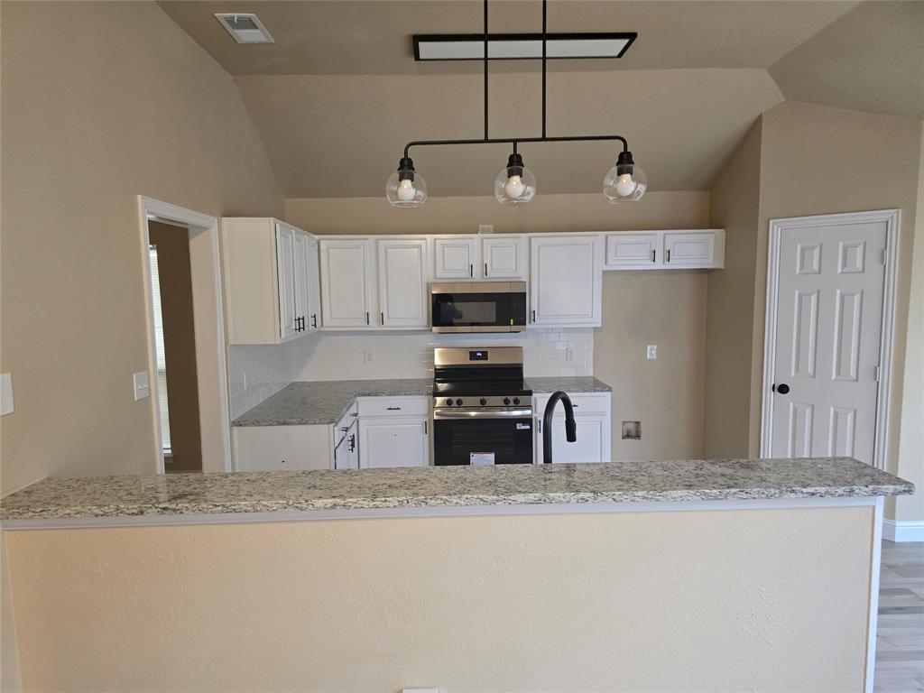 Inside, you’re greeted with brand-new flooring throughout, offering a fresh, clean feel in every room. The open-concept living and dining areas are enhanced by modern lighting fixtures that add warmth and elegance. The kitchen is a showstopper, featuring gorgeous granite countertops, stylish cabinetry, and plenty of prep space for the home chef.