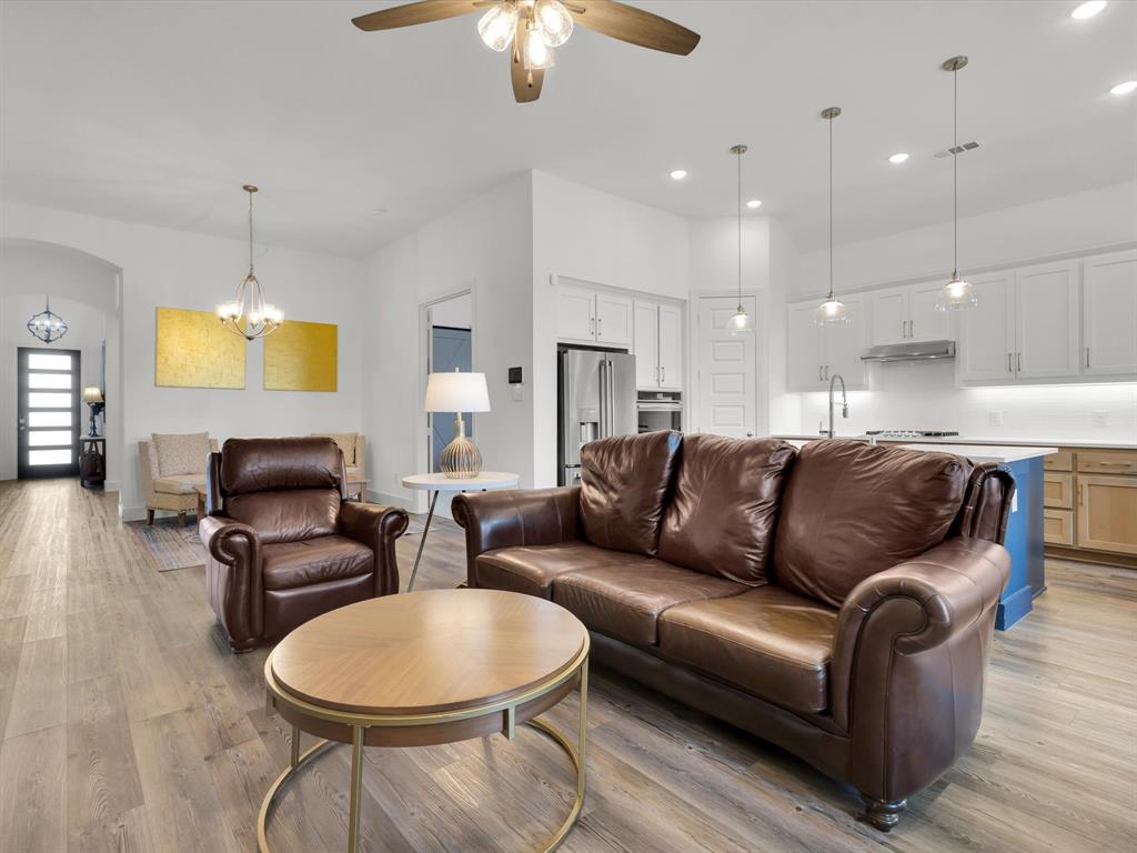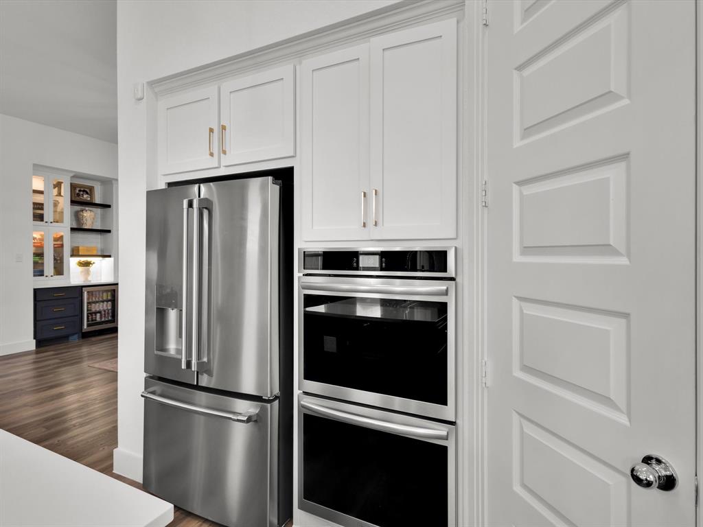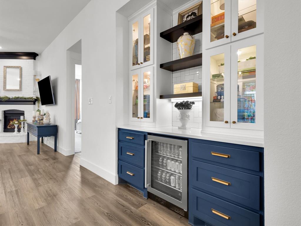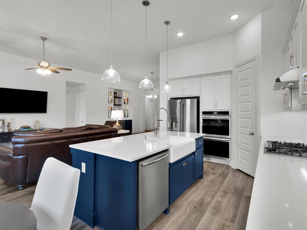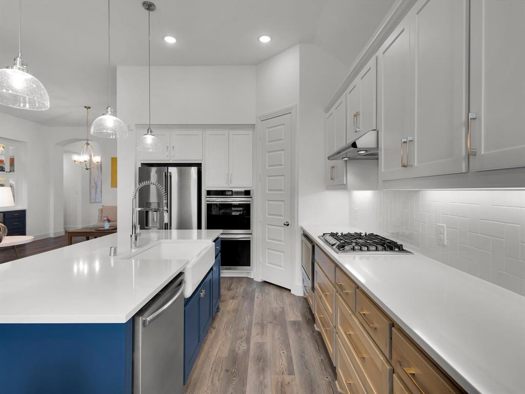 The gourmet kitchen is a showstopper with its built in mini bar, coffee bar, custom cabinets, large center island, quartz countertops, stainless steel appliances, gas cooktop, and walk-in pantry, perfect for both casual family meals and entertaining guests. Custom finishes including epoxy garage floors and design details are found throughout, adding a level of sophistication rarely seen in standard builds here in Morningstar.