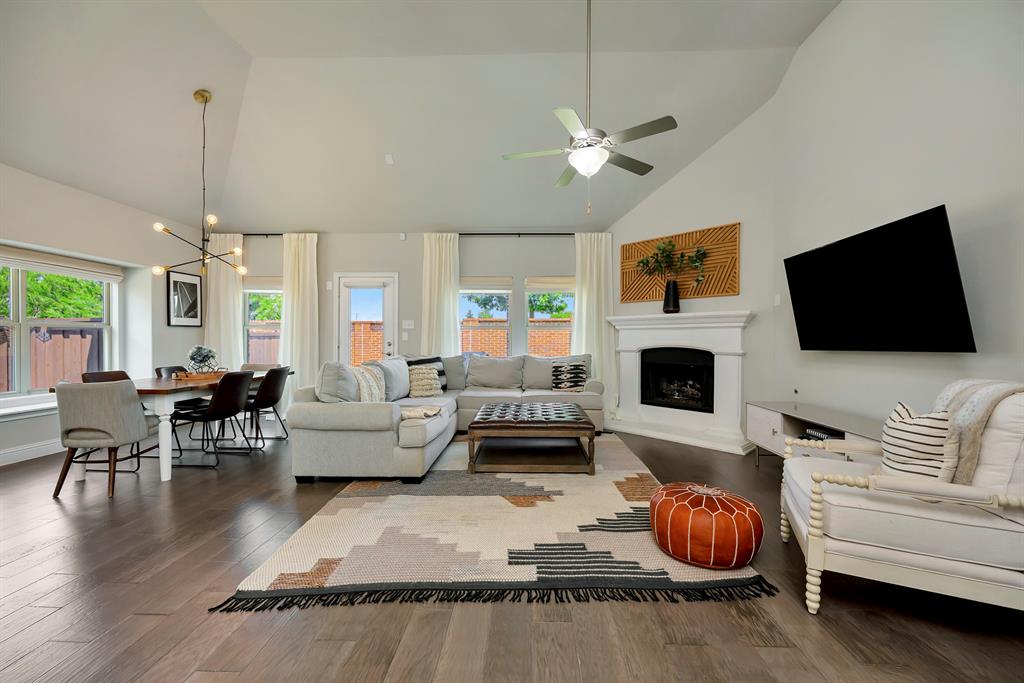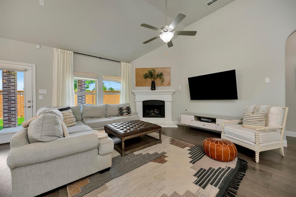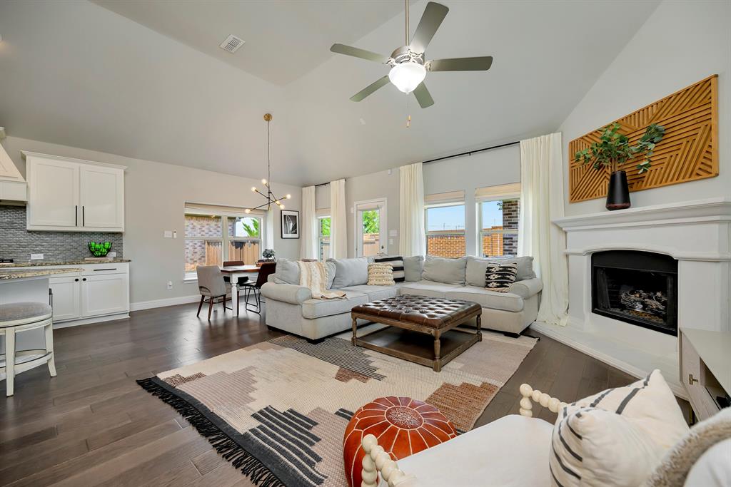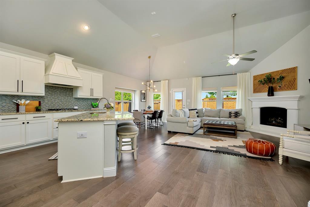 Step inside this beautifully designed home where style meets comfort. The open floor plan is anchored by a bright living room with soaring ceilings, hardwood floors, and a striking white fireplace that flows seamlessly into the kitchen. The chef’s kitchen features granite countertops, a custom vent hood, stainless steel appliances, and a sleek glass tile backsplash, making it as functional as it is inviting. Just off the entry, a dedicated office provides the perfect space for remote work or creative projects. The spacious primary suite boasts a bay window sitting area and a spa-like bath with dual vanities, a soaking tub, and a separate shower. A generous walk-in closet completes the retreat. Secondary bedrooms offer comfort and privacy, while ceramic tile, wood, and plush carpet flooring create the right balance of elegance and coziness throughout the home. Out back, relax under the covered patio while enjoying a private fenced yard with plenty of room to entertain. Practical updates like a NEW roof give added peace of mind.