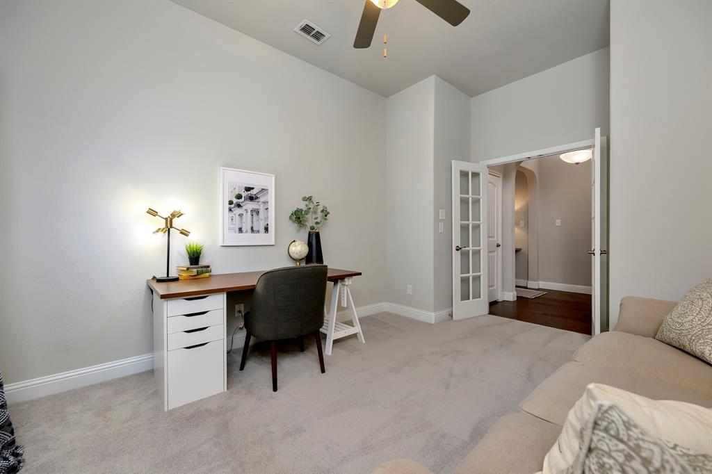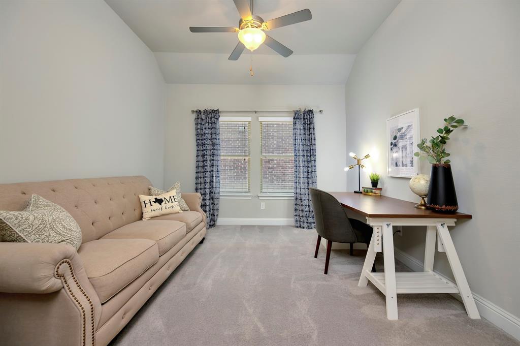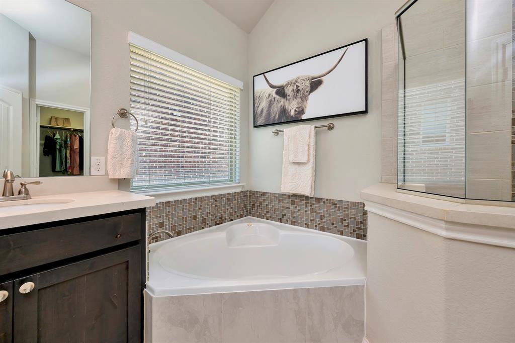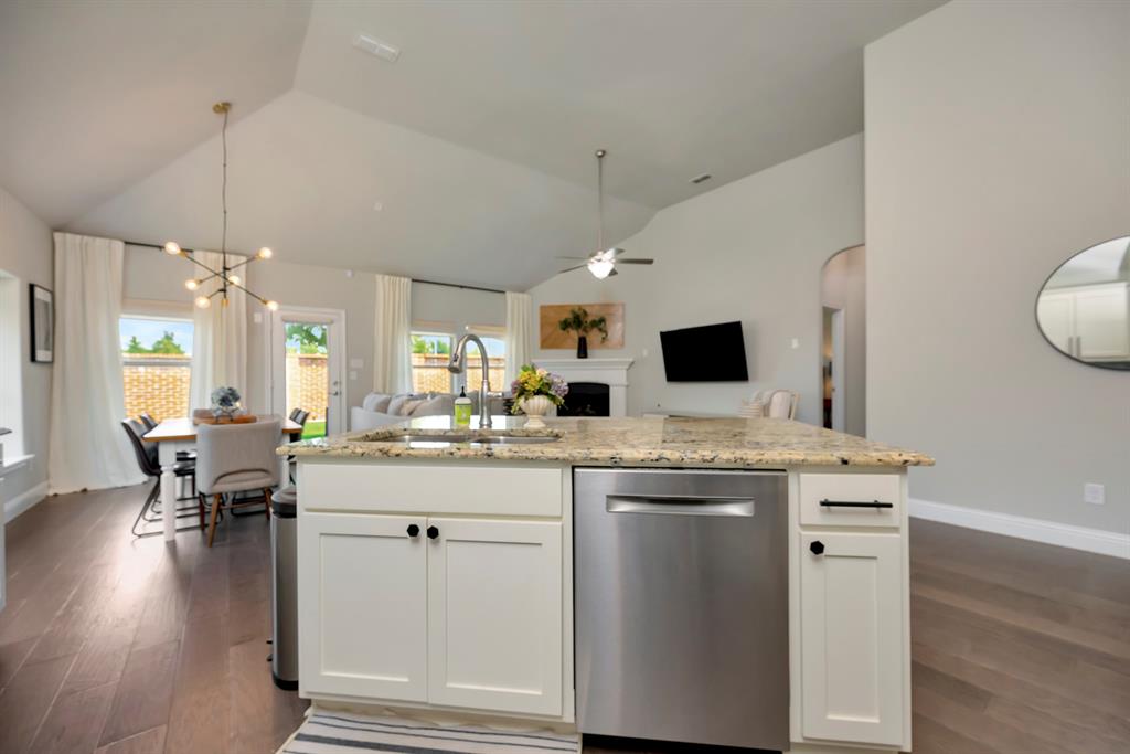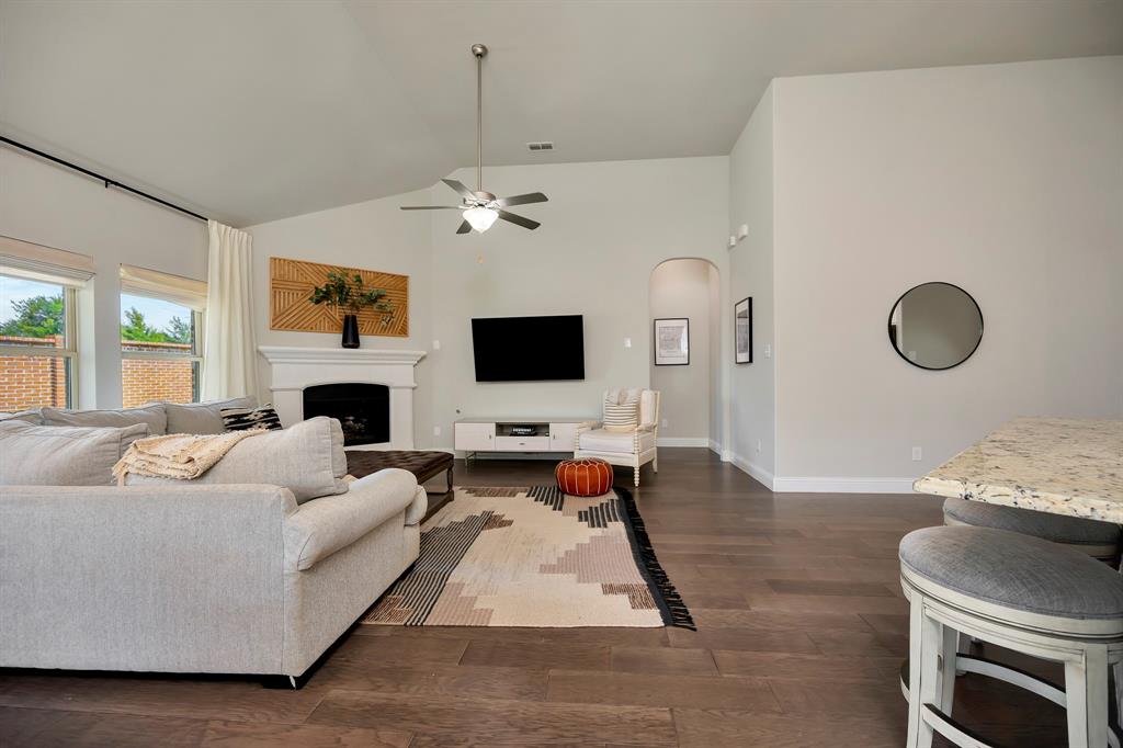 Step inside this beautifully designed home where style meets comfort. The open floor plan is anchored by a bright living room with soaring ceilings, hardwood floors, and a striking white fireplace that flows seamlessly into the kitchen. The chef’s kitchen features granite countertops, a custom vent hood, stainless steel appliances, and a sleek glass tile backsplash, making it as functional as it is inviting. Just off the entry, a dedicated office provides the perfect space for remote work or creative projects. The spacious primary suite boasts a bay window sitting area and a spa-like bath with dual vanities, a soaking tub, and a separate shower. A generous walk-in closet completes the retreat. Secondary bedrooms offer comfort and privacy, while ceramic tile, wood, and plush carpet flooring create the right balance of elegance and coziness throughout the home. Out back, relax under the covered patio while enjoying a private fenced yard with plenty of room to entertain. Practical updates like a NEW roof give added peace of mind.