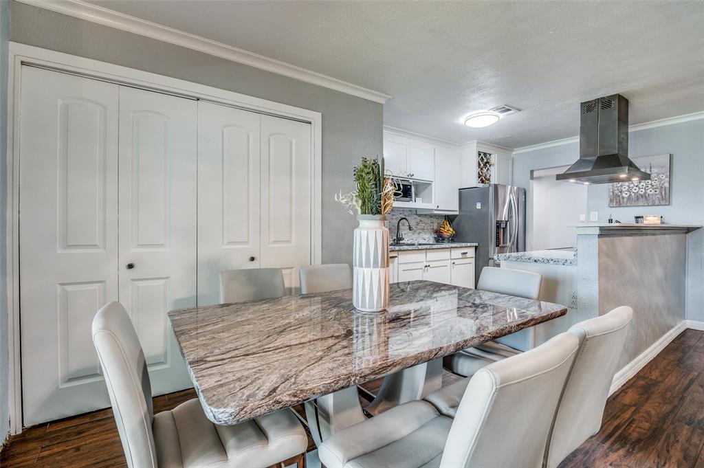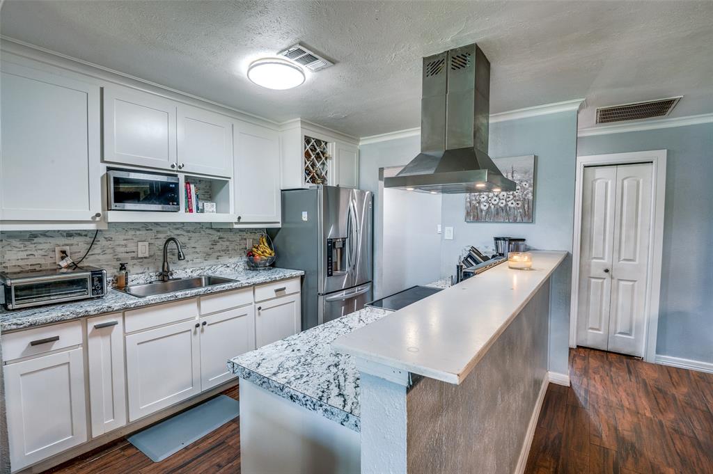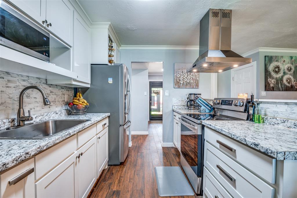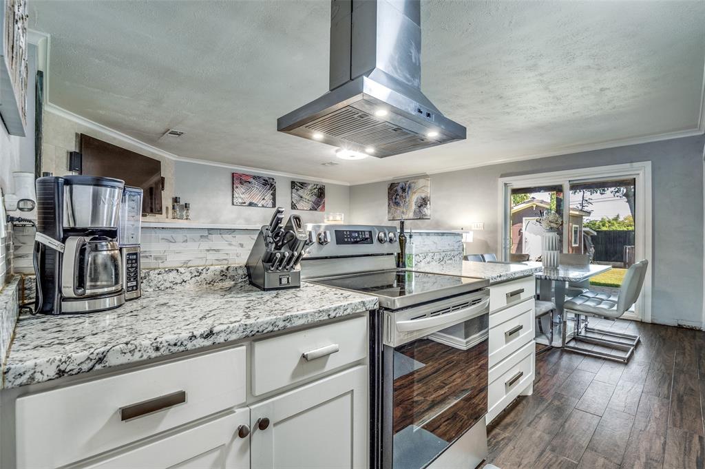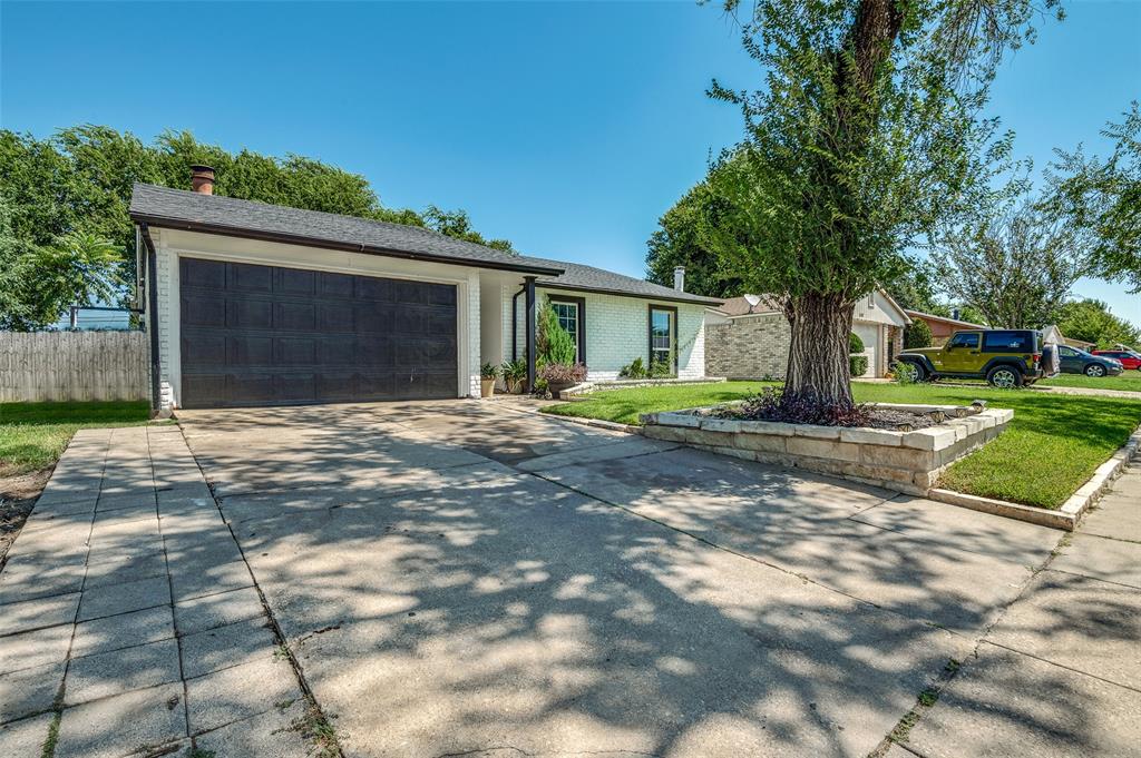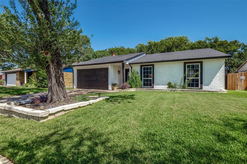 Grand Prairie starter home located near entertainment, shopping, dining, and with easy access to I-20, Hwy 360, and Joe Pool Lake. Recent updates include windows (2019), kitchen cabinets (2020), vent hood and range (2020), water heater (2021), and manual sprinklers. Bathrooms have been updated in recent years. The living room opens to the kitchen, and the fireplace has been refaced with travertine. Covered patio offers sunset views and natural light into the living and kitchen areas, perfect for enjoying your patio furniture with coffee in the morning. Landscaped garden is maintained, and a metal front door provides the entry.