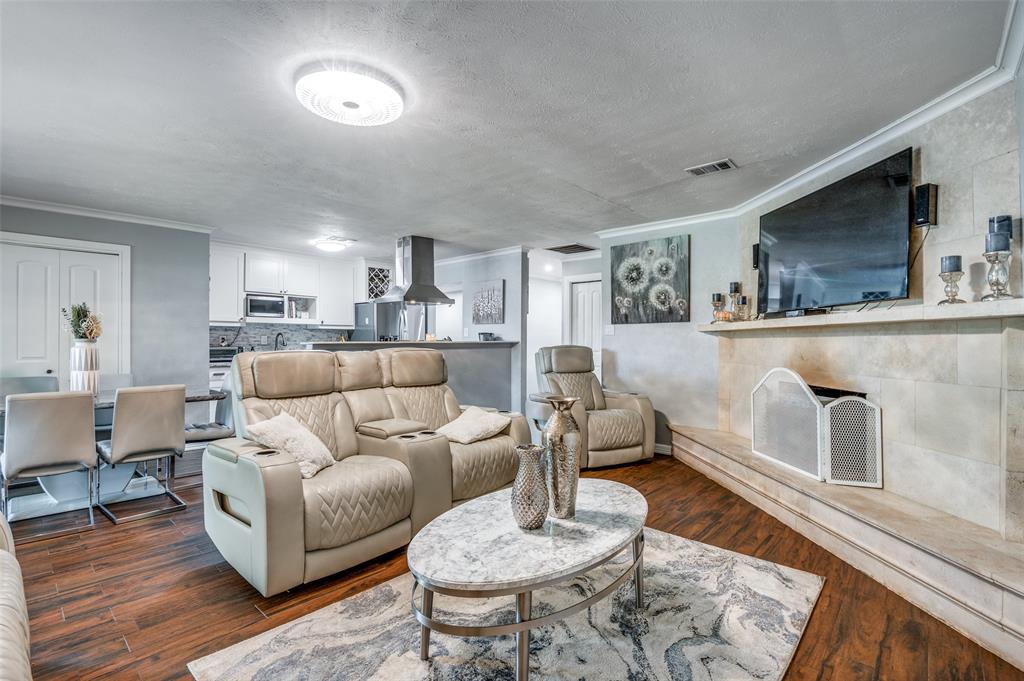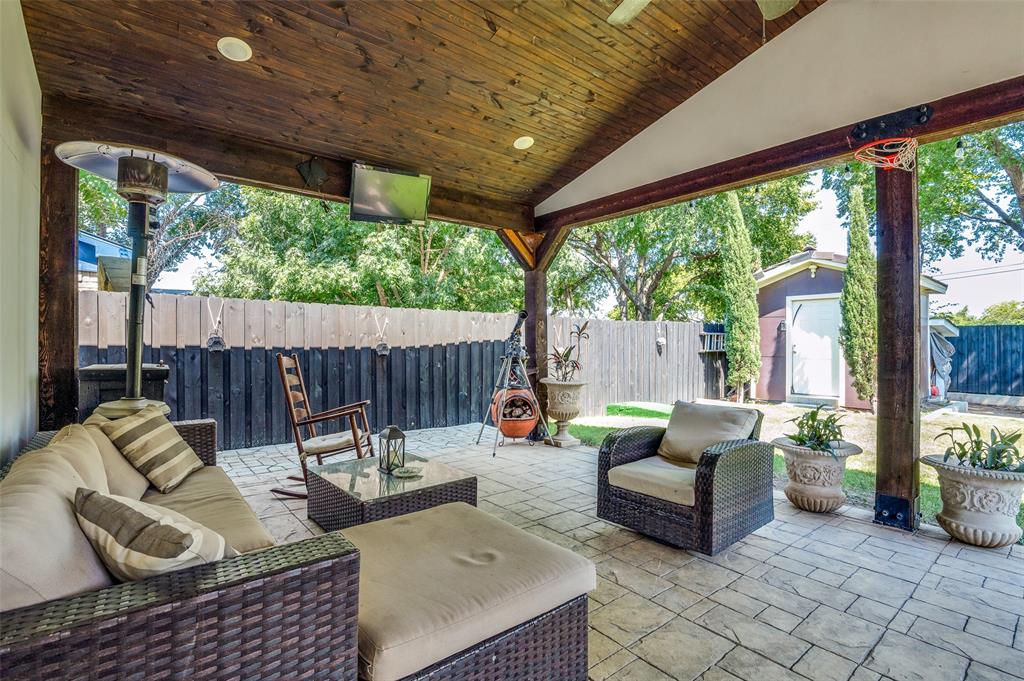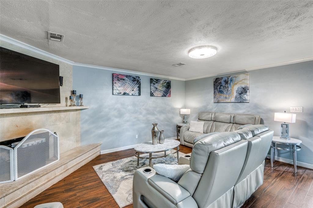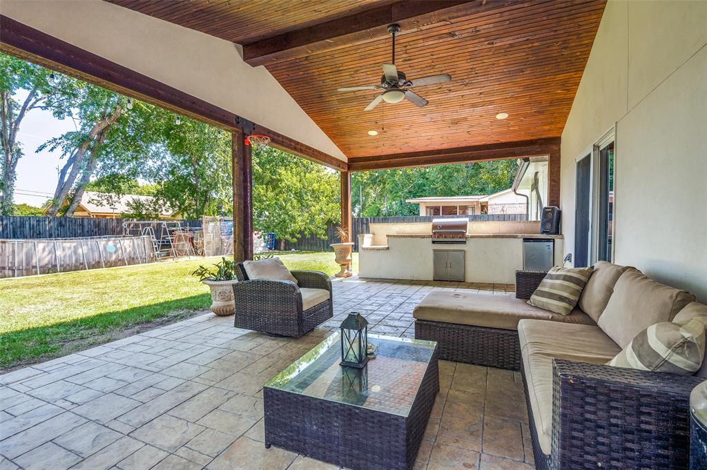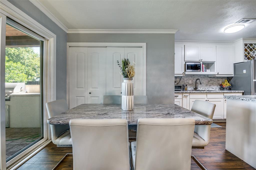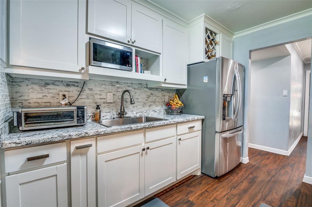 Grand Prairie starter home located near entertainment, shopping, dining, and with easy access to I-20, Hwy 360, and Joe Pool Lake. Recent updates include windows (2019), kitchen cabinets (2020), vent hood and range (2020), water heater (2021), and manual sprinklers. Bathrooms have been updated in recent years. The living room opens to the kitchen, and the fireplace has been refaced with travertine. Covered patio offers sunset views and natural light into the living and kitchen areas, perfect for enjoying your patio furniture with coffee in the morning. Landscaped garden is maintained, and a metal front door provides the entry.