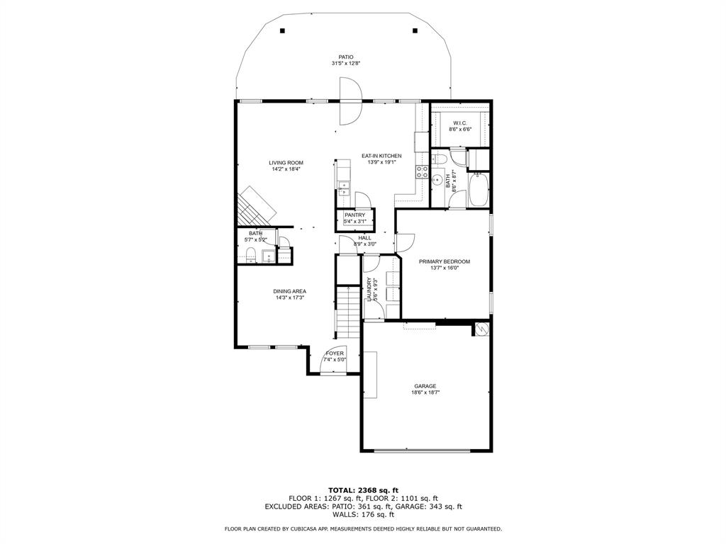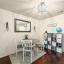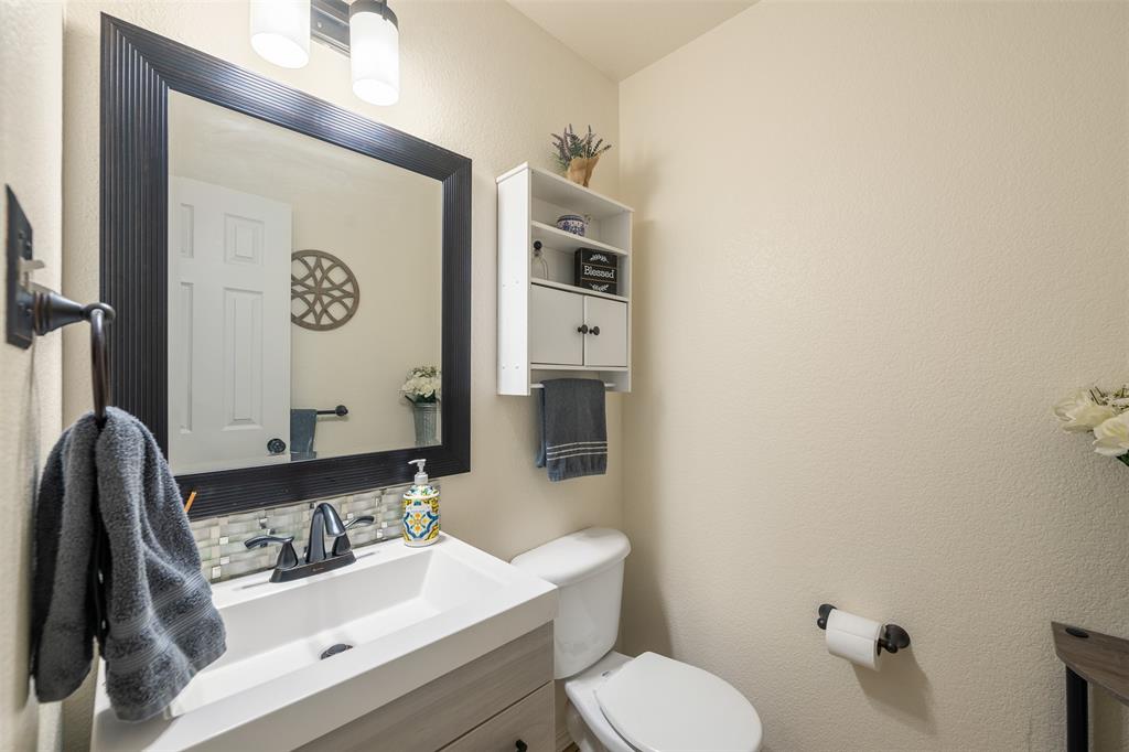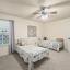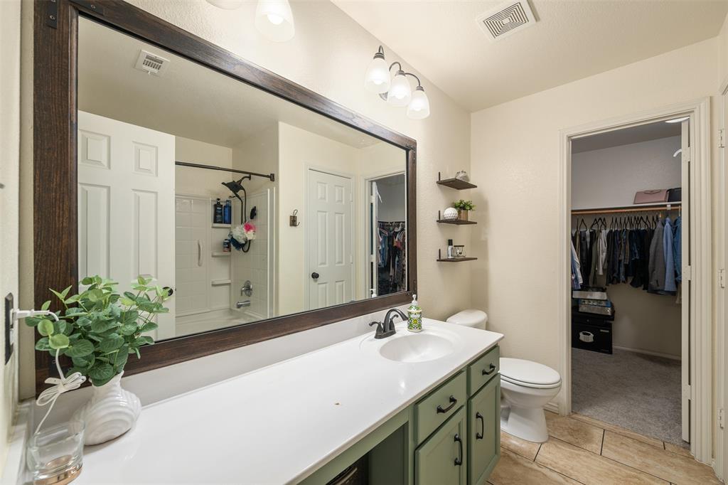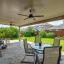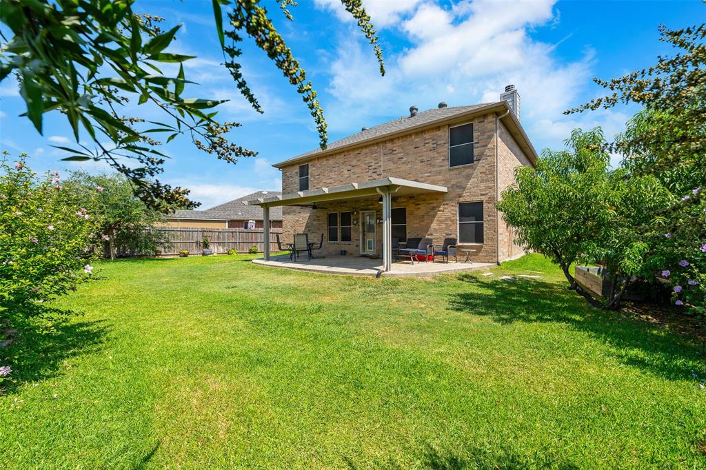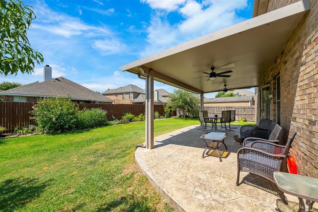 The private primary suite offers a true retreat with a large bath and walk-in closet, while the extended covered patio overlooks a backyard with mature trees, ideal for relaxing outside.