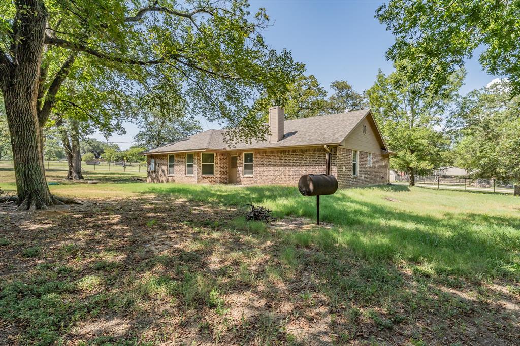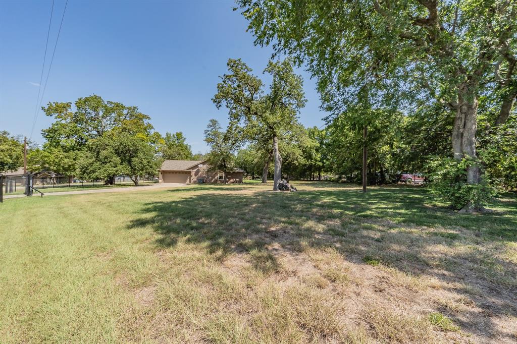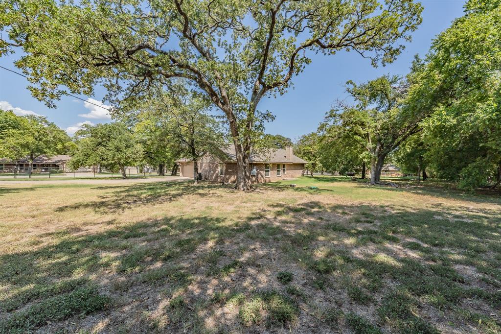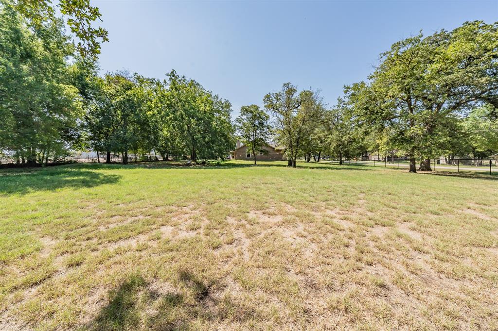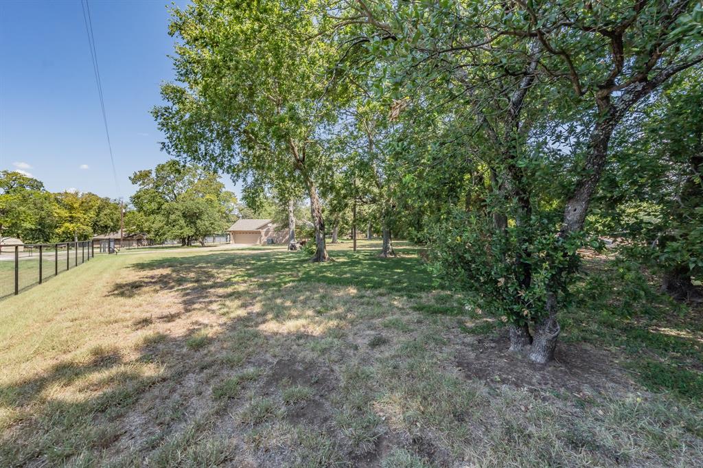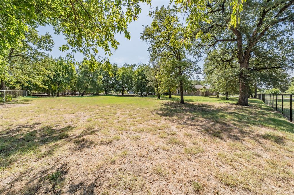 Expansive yard filled with mature trees, providing shade and a serene atmosphere.