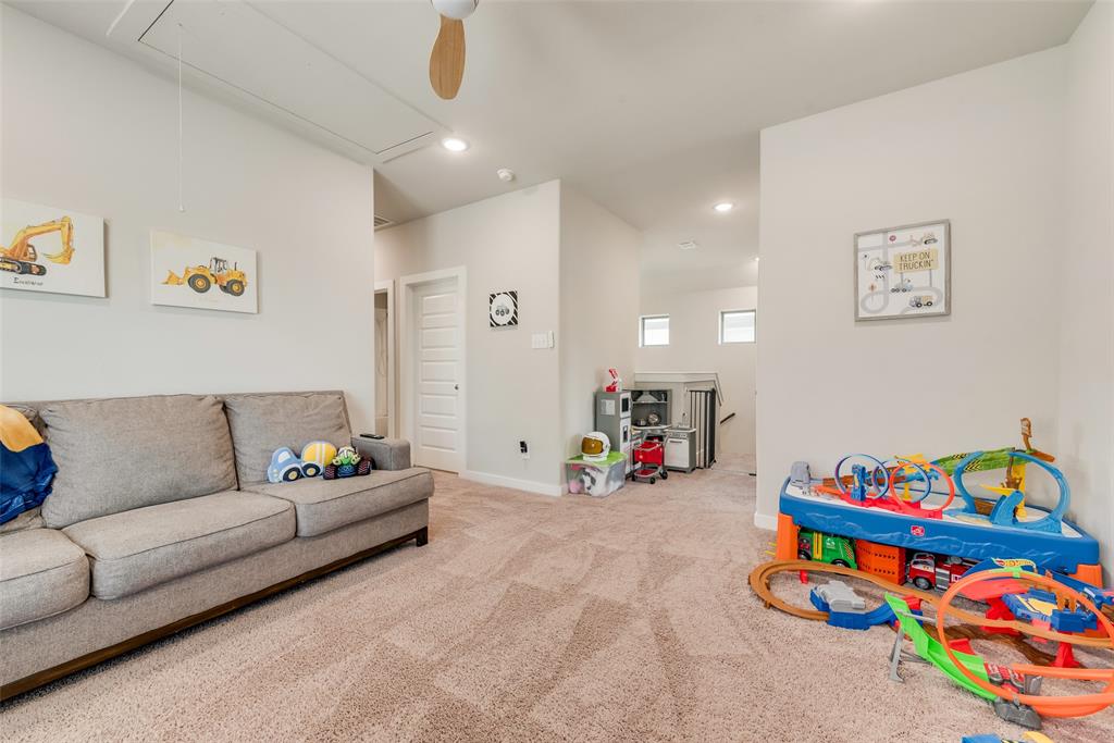 The heart of the home is the open-concept kitchen, featuring crisp white cabinetry, stainless steel appliances, and light-toned flooring that creates an inviting and airy feel. Whether preparing weeknight dinners or hosting guests, this space flows seamlessly into the dining and living areas, making entertaining effortless. The multiple living spaces provide flexibility—ideal for a game room, home office, or second lounge.