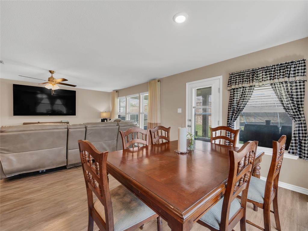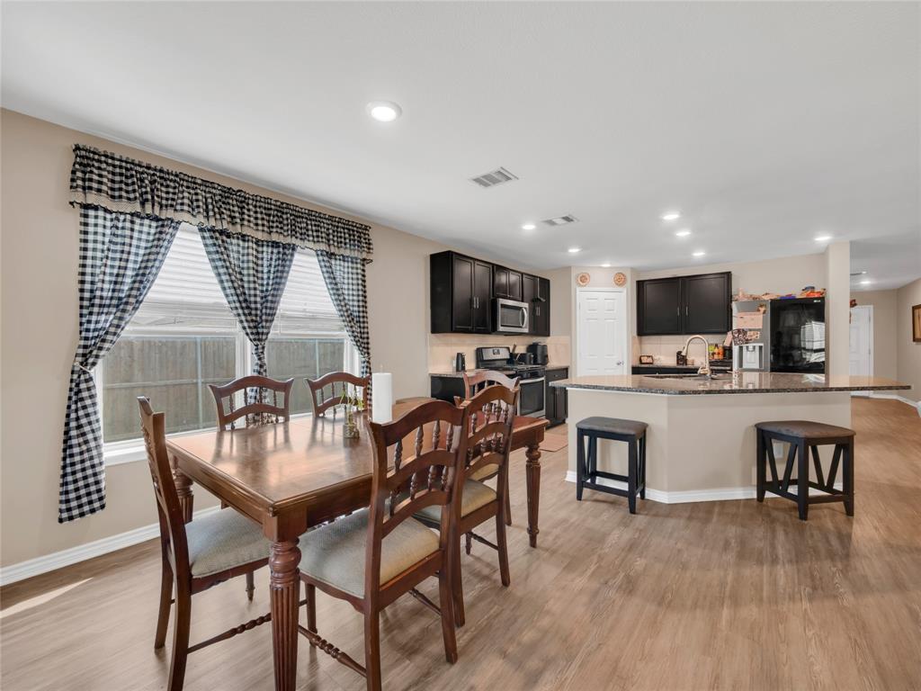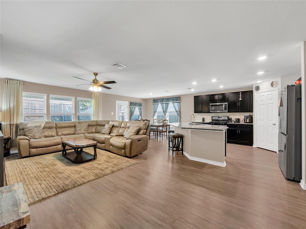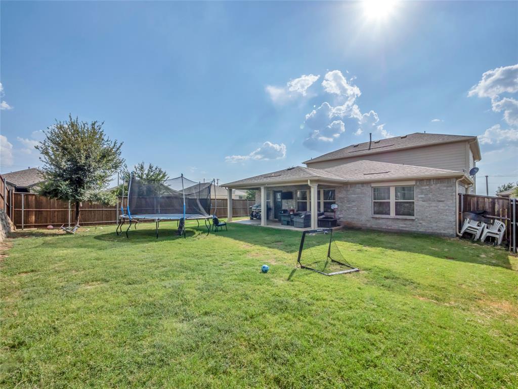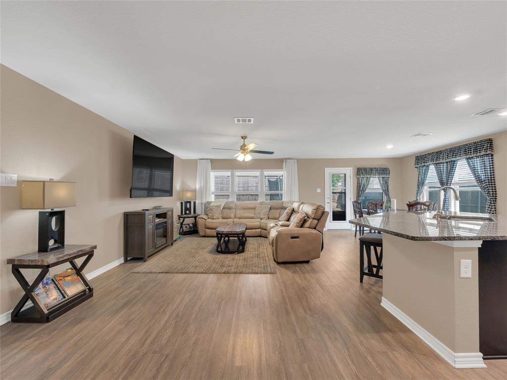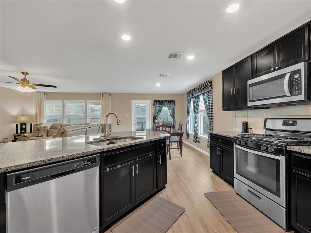 Move-in ready 5 bedroom, 3 bath home in the beautiful Winn Ridge community in Aubrey. Spacious open floor plan living, dining, kitchen space that maximizes your square footage and provides lots of flexibility. Easy to maintain vinyl plank floors throughout the main living areas. The kitchen features tons of cabinet & counter space, granite counter tops, stainless steel appliances, motion activated under cabinets lights and a huge eat at island with breakfast bar. The primary suite includes a large walk in closet and en suite bath with dual sinks, standing shower and garden tub. Large game room or additional living room on the second floor with three spacious bedrooms and a full bath. All bedrooms feature plush carpeting, ceiling fans, window covering and walk-in closets. 5th bedroom guest suite on the 1st floor with full bath would also make a great office space. Enjoy time with family and friends on the shady covered patio in your large, fully grassed backyard with wood privacy fence with solar accent lighting. Corner lot provides an additional side yard or dog run area. Lovely Winn Ridge offers a wide range of family-friendly amenities. Enjoy summers under the cabana at the resort-style pool and afternoons at the park or a quick match at the tennis courts. Take advantage of being within close proximity to shopping, dining and entertainment as Highway 380, I-35 and Dallas North Tollway are all a short drive away. Zoned for highly-rated Denton ISD schools including the brand new Ray Braswell High School.