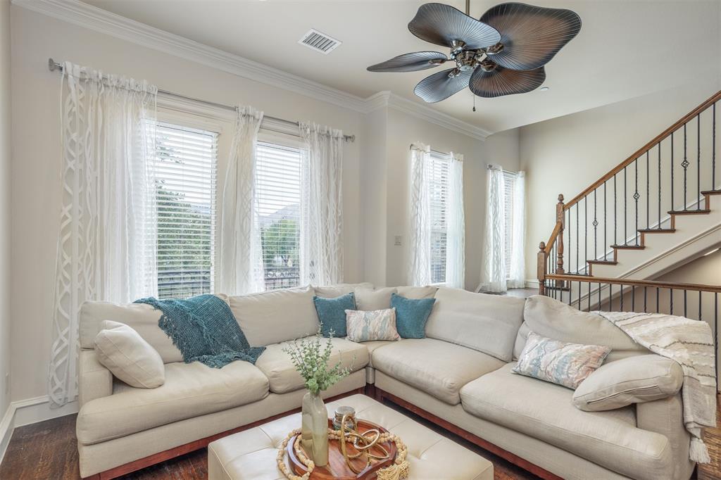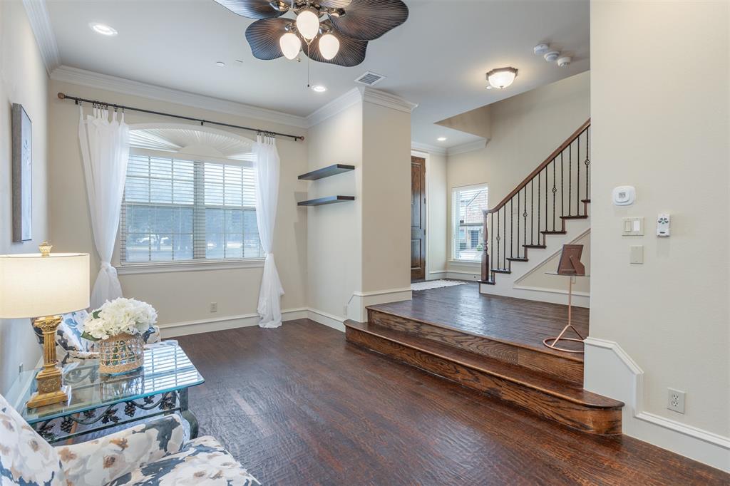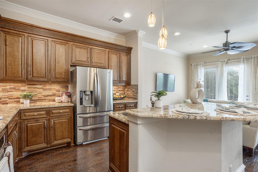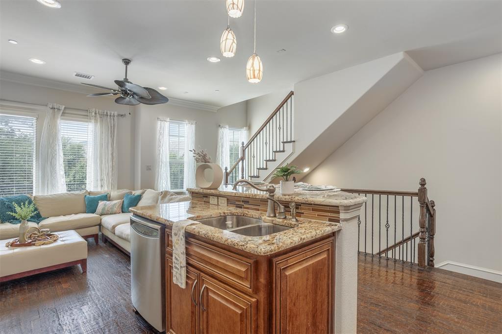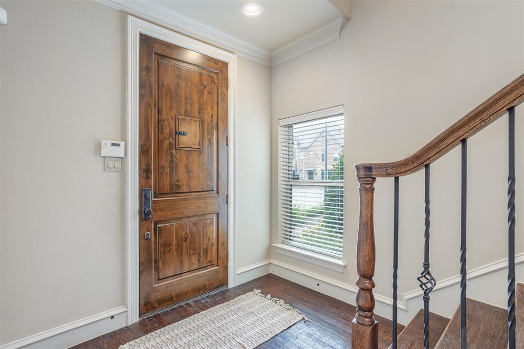 This stylish, low-maintenance townhome in one of Plano’s most desirable communities stands out with timeless marble and hand-scraped hardwood floors—no carpet anywhere. The kitchen is both sleek and functional, featuring granite countertops, stainless steel appliances, and pull-out wire shelving in the rich maple cabinets. Oversized windows and its rare corner-unit position fill the home with natural light, while iron spindles, crown molding, and custom finishes add character throughout. The master retreat offers dual walk-in closets and a spa-like bath with a jetted tub and separate shower. The layout flows with intention: a private living area with powder bath on the main floor, an airy second-level gathering space anchored by the kitchen and dining, and a top floor with two bedrooms, a full bath, and an additional living area—perfect for guests or flexible use. Just minutes from Legacy West, The Shops at Legacy, and major highways, this home provides quick access to premier dining, shopping, and entertainment, along with a true lock-and-leave lifestyle. Located in award-winning Frisco ISD, 5709 Knox Dr is move-in ready and priced to sell—don’t miss your chance to call this one home!