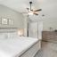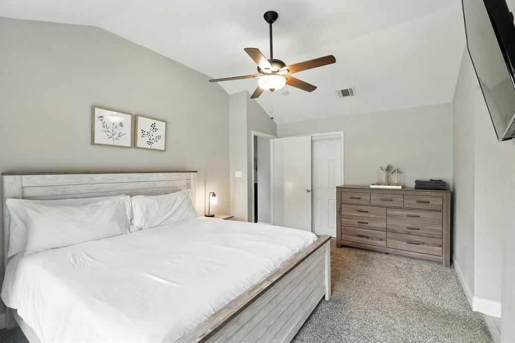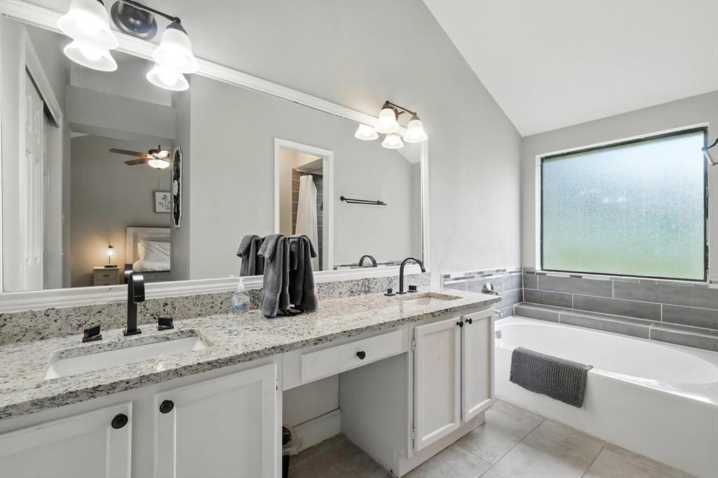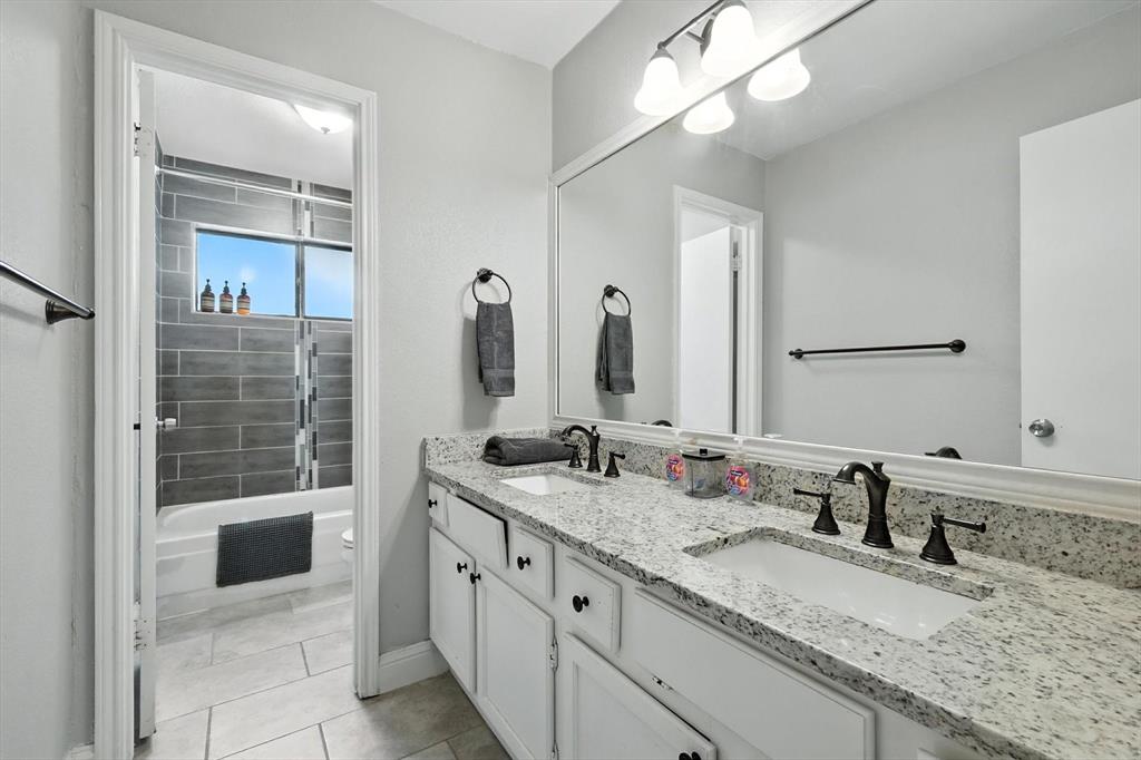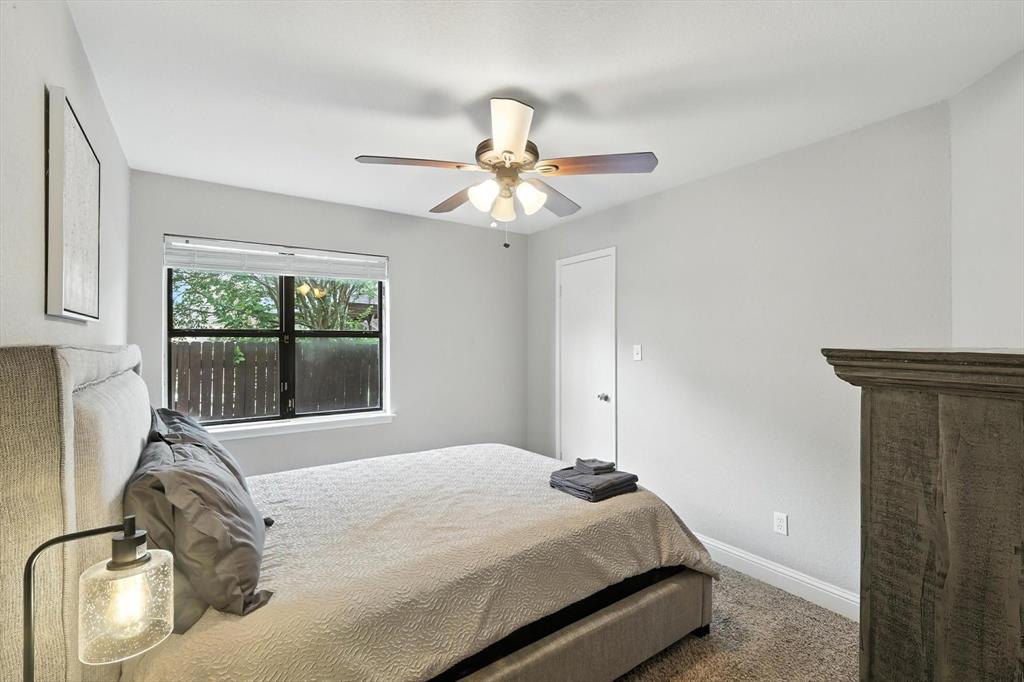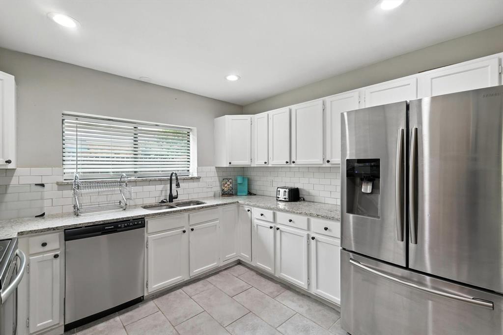 The spacious kitchen boasts granite countertops, subway tile black plash, stainless appliances, a breakfast bar, and an abundance of cabinetry—perfect for any home chef. The primary suite is privately situated at the front of the home and features an updated en-suite bath with an oversized shower featuring stunning tile work, stylish finishes, and dual closets. The split-bedroom layout offers three secondary bedrooms, each generously sized with large walk-in closets. Both bathrooms have been tastefully renovated with contemporary touches to elevate daily routines.