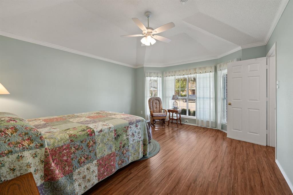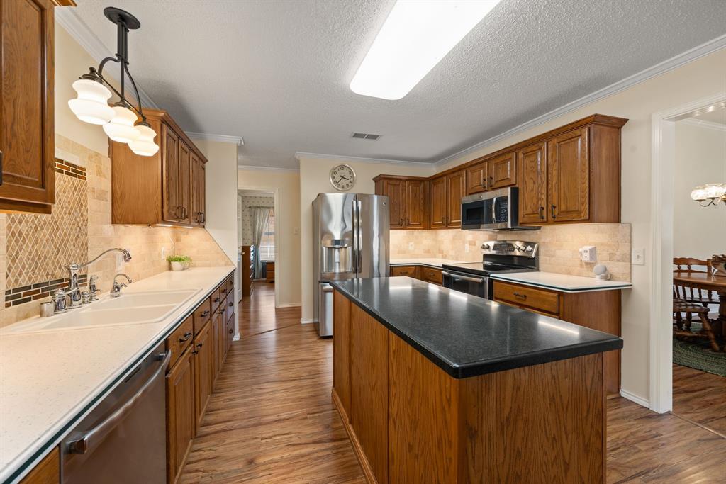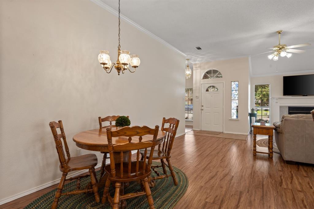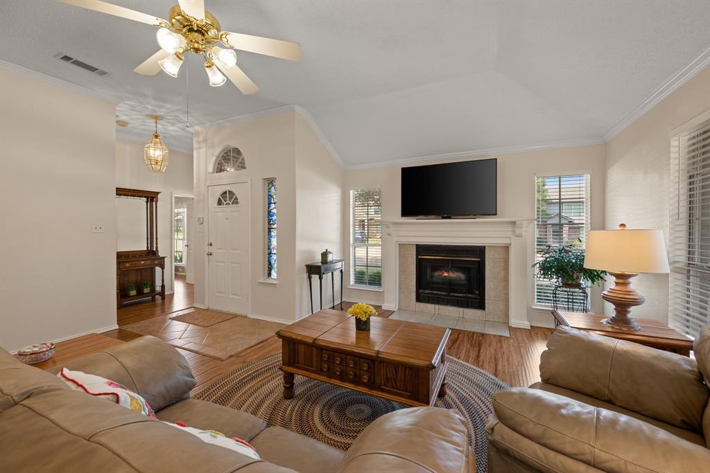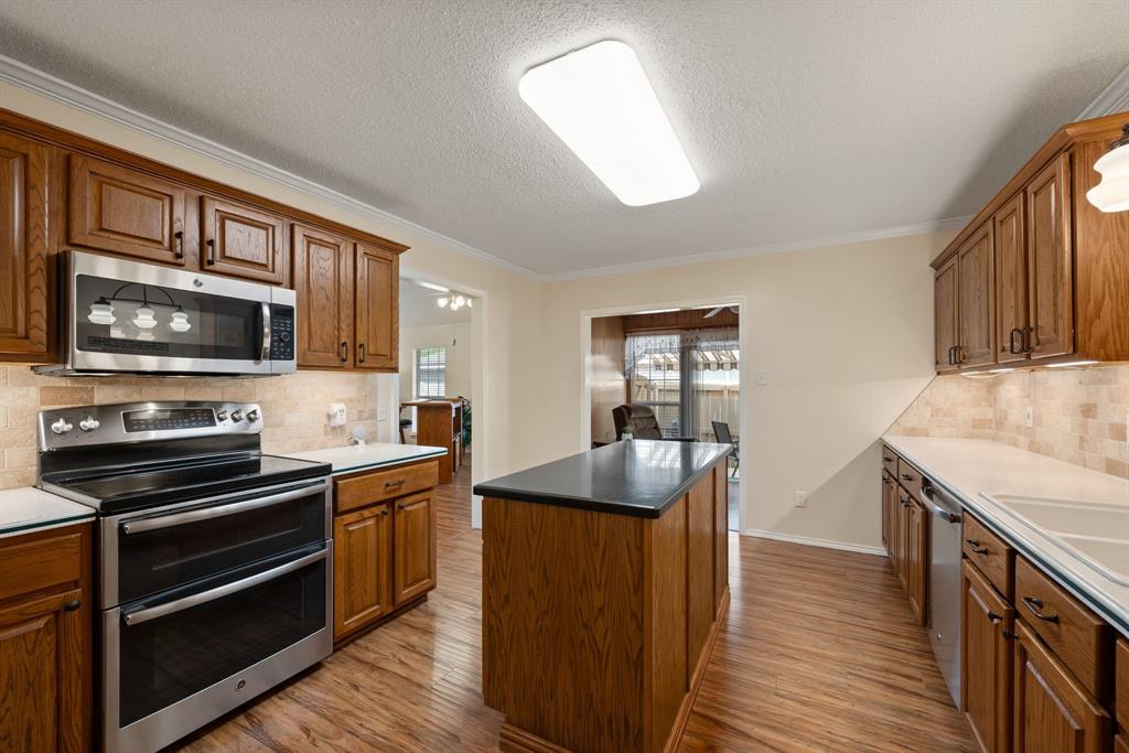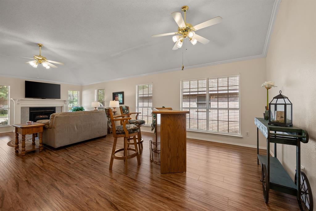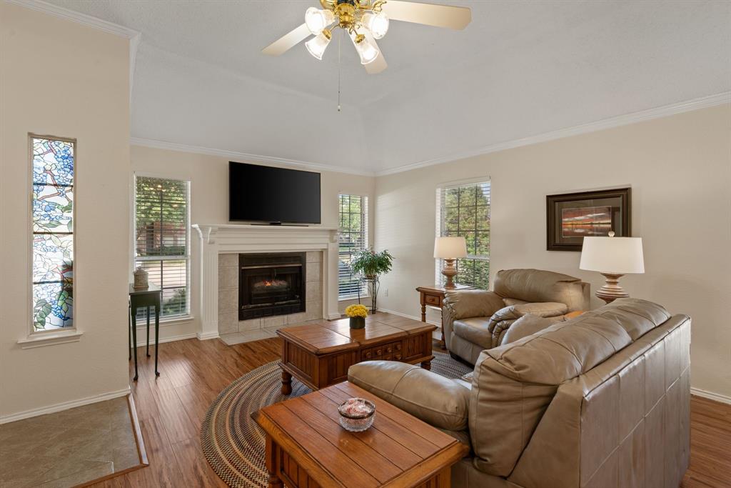 Welcome to your dream home in the sought-after Bell Ranch Terrace community! This beautifully cared-for single-story gem offers 3 spacious bedrooms, each with its own walk-in closet, 2 bathrooms, a 2-car garage with built-in cabinets, and a fabulous flex room that would make a great office, sunroom or even a breakfast area. From the moment you step inside, you’ll fall in love with the light-filled, open layout featuring vaulted ceilings, walls of windows, and warm laminate flooring and crown molding throughout. The chef’s kitchen is perfect for cooking and entertaining, boasting abundant Red Oak cabinetry with under lighting, updated solid surface countertops, stunning stone tile backsplash and sleek stainless steel appliances including a refridgerator and a convection microwave and oven. Your private primary retreat is a true sanctuary, with a bay window for natural light, 2 walk-in closets, and a spa-like ensuite complete with seperate vanities, garden tub and walk-in shower. Start your mornings in the sunny enclosed porch or out on the covered deck. Ideally located near top-rated schools, shopping, dining, and just minutes from DFW Airport, this home truly has it all.