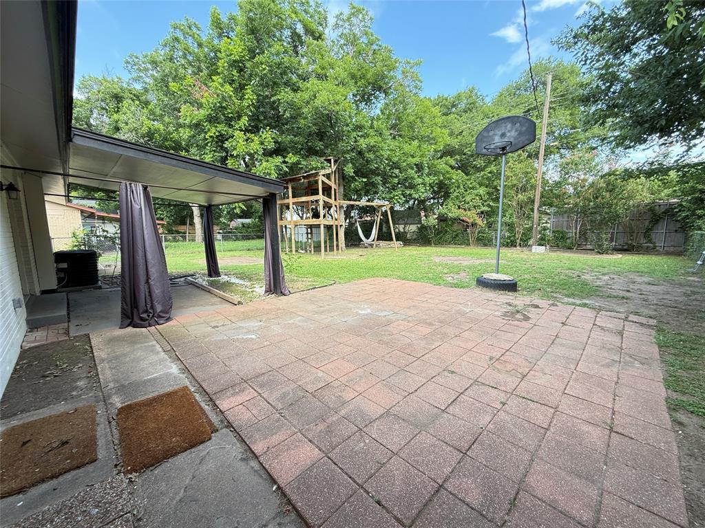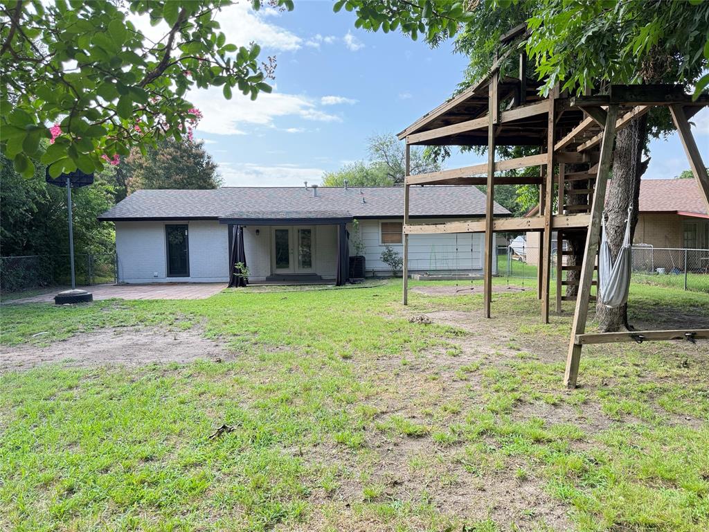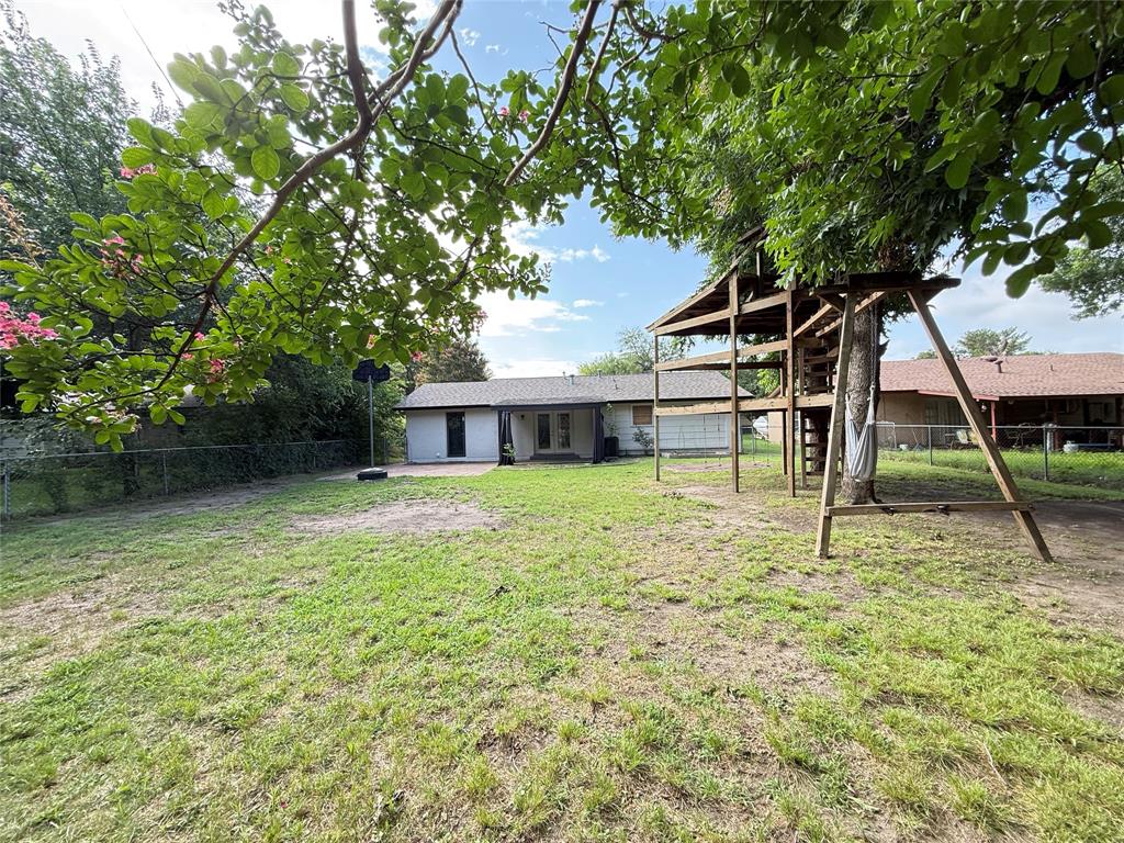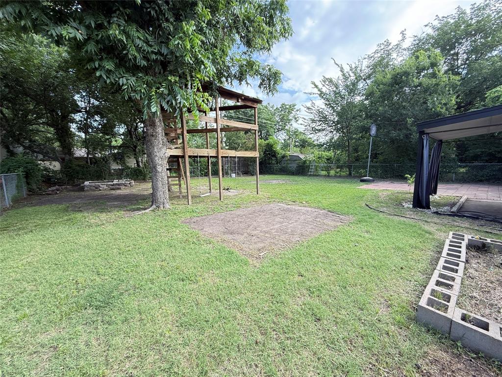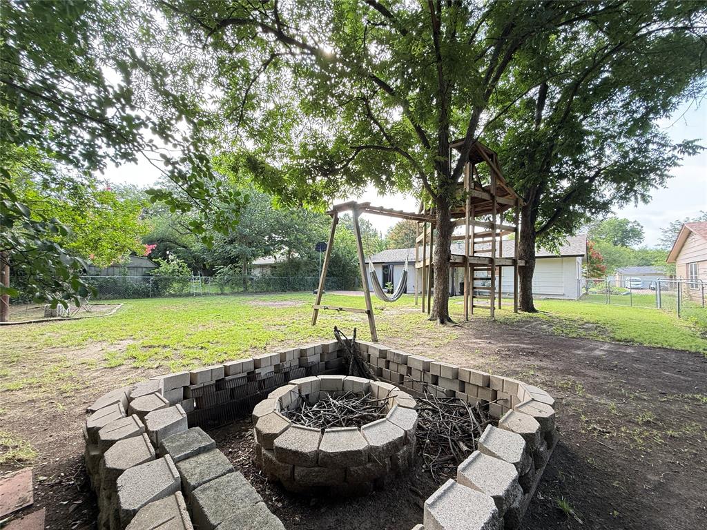 The backyard is a true retreat with mature trees, a built in fire pit, and a treehouse that adds a unique touch. A covered patio extends your living space outdoors, perfect for relaxing or entertaining.