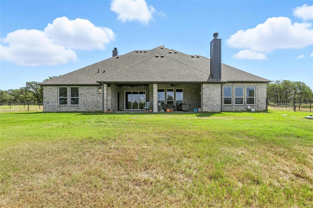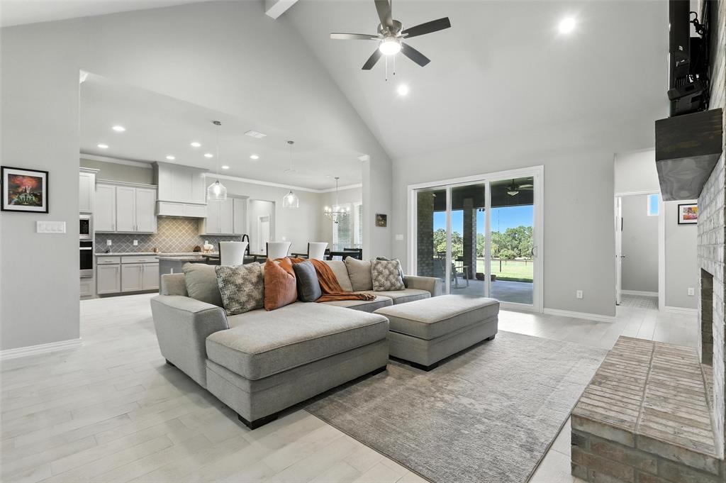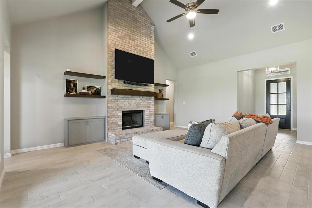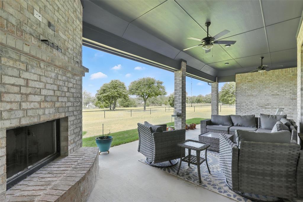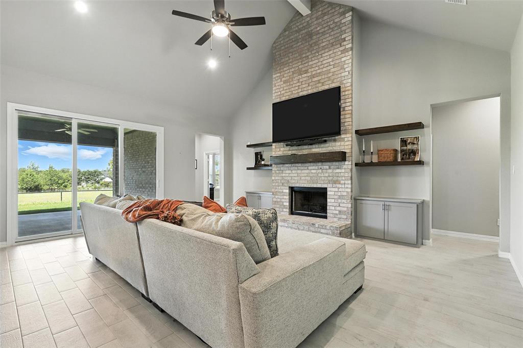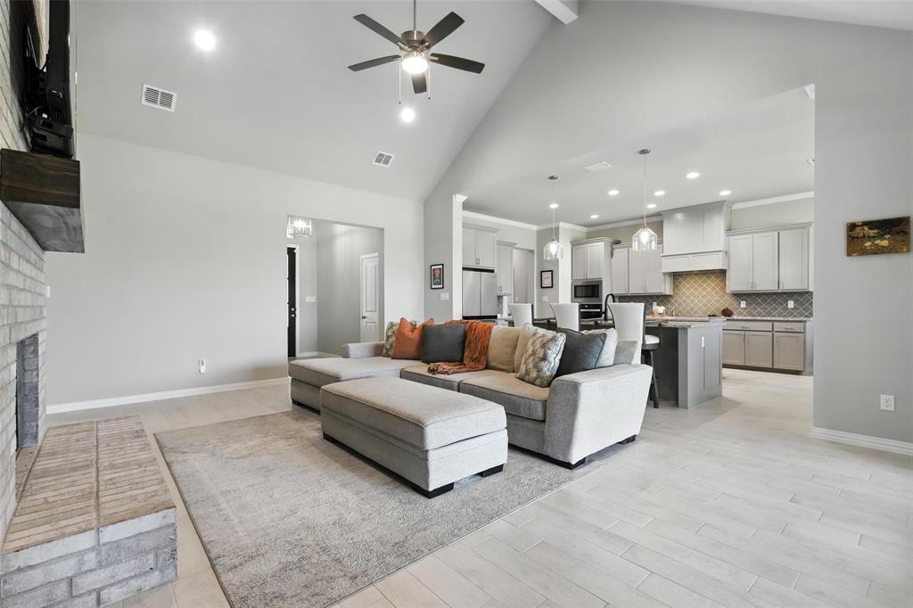 This thoughtfully designed home offers many amenities that make it a unique find. Two private primary ensuites offer options for multigenerational households, guests, or a dedicated mother-in-law suite. Bedrooms three and four are connected by a Jack-and-Jill bathroom, each with its own vanity. The kitchen stands out with two spacious islands, granite countertops, a built-in microwave, soft-close trash drawer, pot and pan storage, stylish tile accents, and a generous walk-in pantry, making it both functional and fashionable. The main living area features soaring vaulted ceilings, wood-burning fireplace, and wood-look tile flooring that flows throughout the shared spaces. A bonus room offers options to be used as a home office, playroom, game room, or creative studio. The primary suite features a standalone soaking tub, a full walk-through tile shower, and an oversized walk-in closet. All three full bathrooms in the home have been updated with high-end finishes, new tile work, and quartz countertops. Step outside and you’ll find an entertainer’s dream with an extended covered back patio, complete with a fireplace, built-in lighting, and two ceiling fans—perfect for year-round gatherings. Set on 2.22 acres, the property is fully fenced and cross-fenced with a 4-foot pipe fence—ideal for pets, livestock, or recreation. A three-car attached garage adds practicality and storage, while additional features such as wood shutters, a brick exterior, and a 30-year composition roof enhance the home’s durability and curb appeal. Some furnishings are negotiable or may convey with an acceptable offer. Schedule your private showing today!