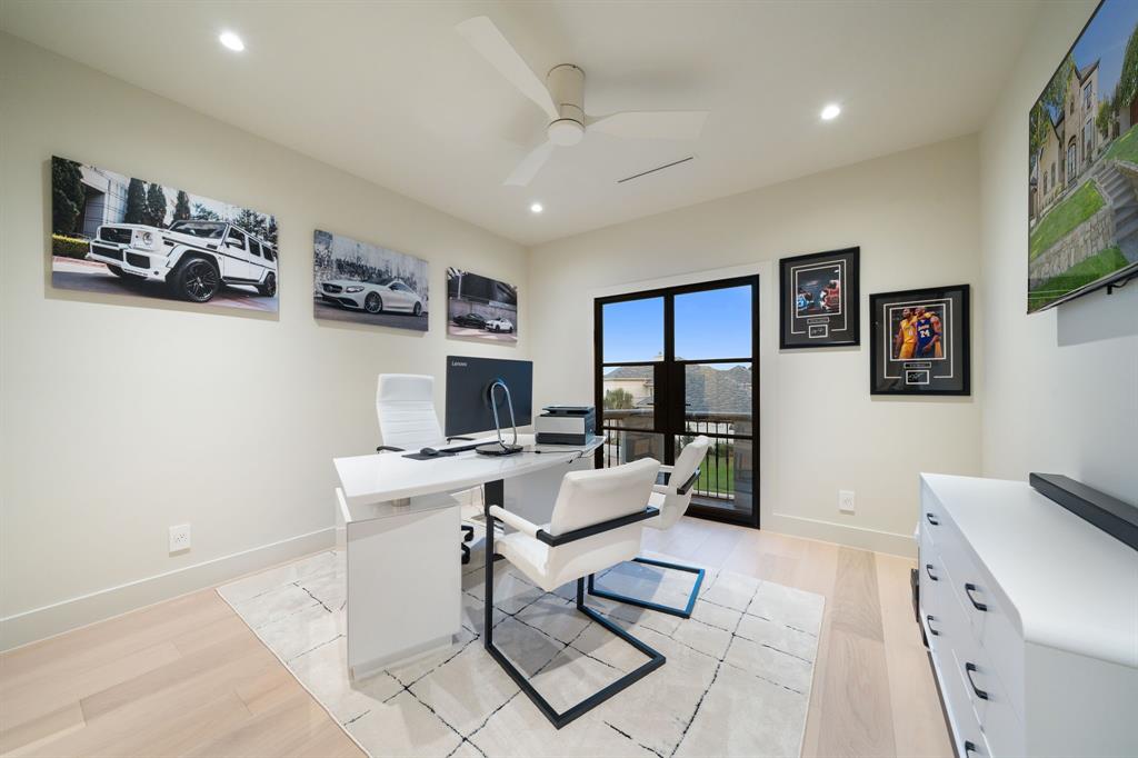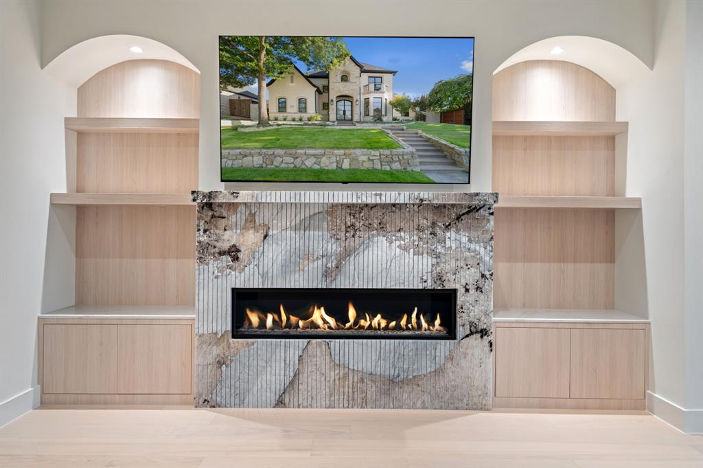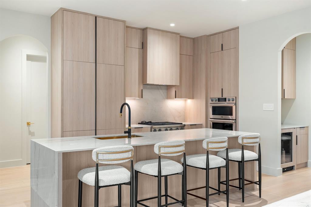 Welcoming you into a sanctuary where no detail has been overlooked, this open-concept home is adorned with luxurious hardwood floors, designer light fixtures from Arteriors as well as a masterfully crafted fireplace, infusing the living space with warmth and ambiance. Floor-to-ceiling sliding patio doors flood the interior with natural light and seamless integrate indoor-outdoor living. At the heart of the home lies a gourmet kitchen, boasting state-of-the-art Dacor appliances and luxurious quartzite countertops, while custom European cabinets offer bespoke storage solutions.
