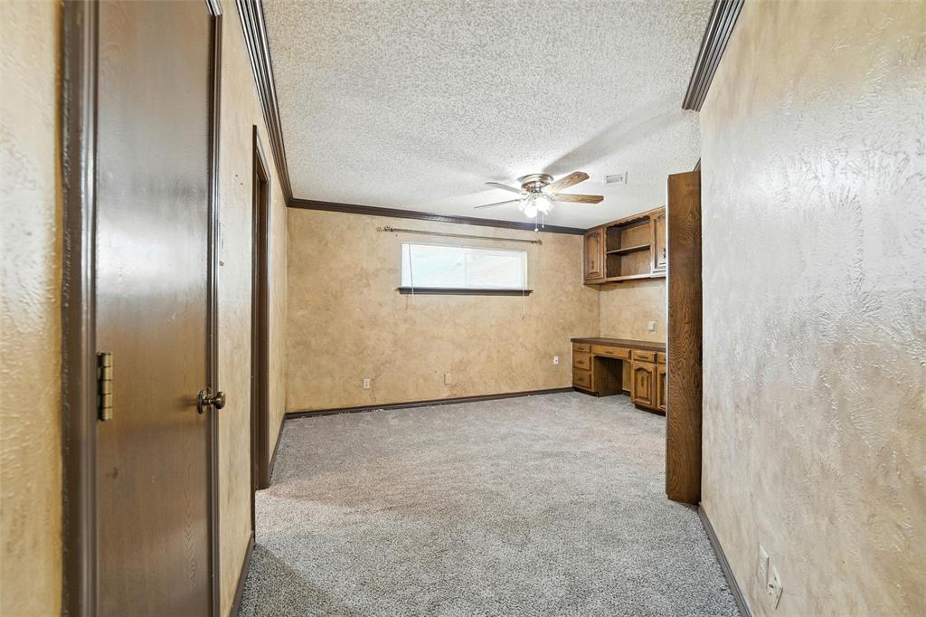 Nestled just off of University Hills in the Las Colinas area, this well kept 4-bedroom, 3-bath brick ranch-style home spans approximately 2,729 sq ft on a generous 0.31-acre lot. Built in 1974, this single-story residence blends timeless charm and personality. Upon entering, you are greeted with decorative ceilings, an office space to the left with built in shelves and a dining space to the right. The living room has beautiful tiger scraped hardwood floors and a stone fireplace that anchors the main living area. The kitchen is beautifully functional with a breakfast area and dining room right off the sides of it. The primary bedroom has an en suite bath and a separate space for a makeup counter or additional functionality, not to mention the three other bedrooms, one with a built in desk, walk in closet and its own en suite.