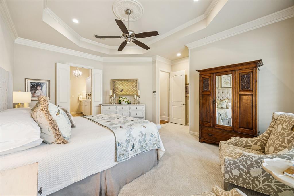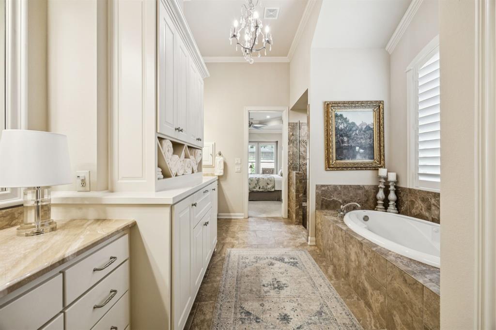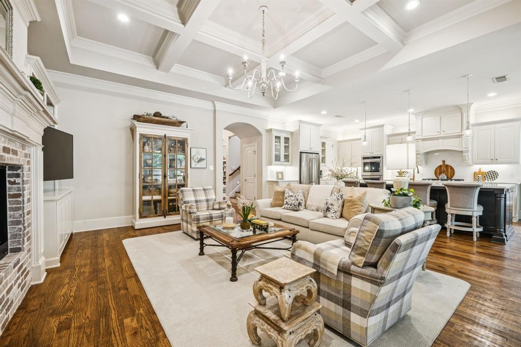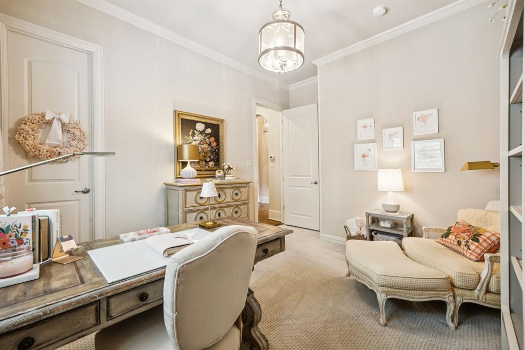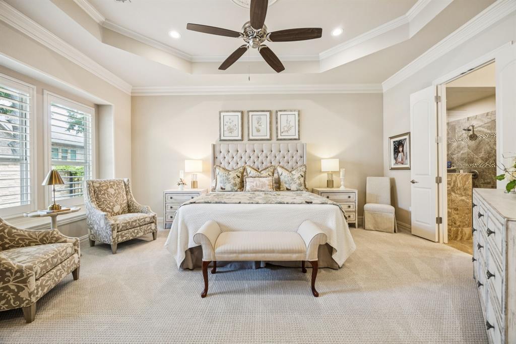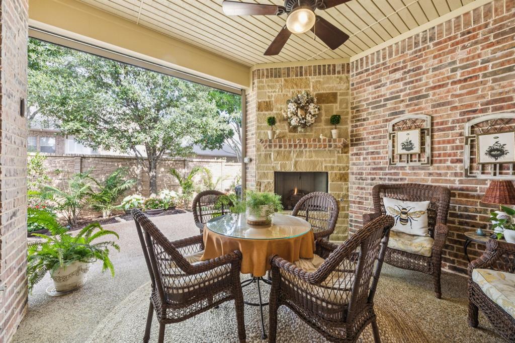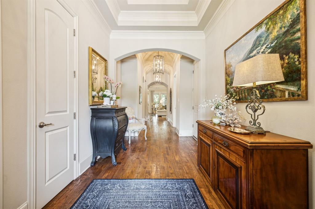 Tucked away on a quiet cul-de-sac, this exquisitely maintained, turnkey ready, custom home offers refined living in every detail. From rich, hand-scraped hardwood floors to elegant coffered ceilings, each space radiates timeless sophistication and everyday comfort. A dedicated home office offers the perfect space for working remotely or managing day-to-day tasks in style. A spacious guest suite with a full private bath is located on the main level—ideal for a mother-in-law suite, visiting guests, or multi-generational living. The heart of the home is a gourmet chef’s kitchen, thoughtfully designed with stainless steel appliances, gas cooktop, double ovens, a generous center island, breakfast bar seating, additional dining area and an walk-in pantry—perfect for hosting and holiday prep alike. The kitchen flows seamlessly into a warm and inviting living area, complete with a built-in bar, cozy fireplace with plantation shutters throughout add a layer of classic charm. The luxurious primary suite is a true retreat extends into the spa-inspired primary bathroom. Enjoy a jetted soaking tub, separate shower, and a thoughtfully designed walk-in closet with direct access to the laundry room for ultimate convenience.Step outside to your private backyard oasis, where a covered patio with retractable screen, gas fireplace, and built-in gas line for grilling make year-round outdoor entertaining effortless. Whether it's a quiet evening or a lively gathering, this space offers unmatched comfort and versatility. Upstairs, you’ll find a third bedroom with a full bath and a versatile flex space—ideal as a game room, media room, playroom, or additional lounge area. With a smart layout, abundant storage, and high-end finishes throughout, this home is a rare blend of comfort, beauty, and function. Located in a sought-after neighborhood, this one is not to be missed.