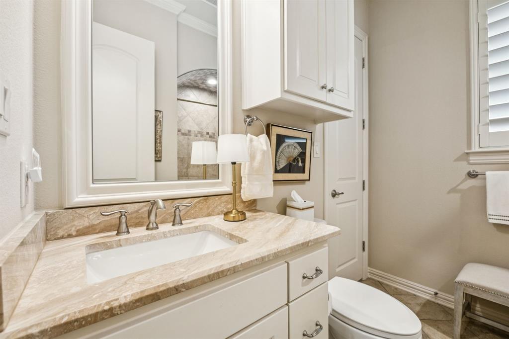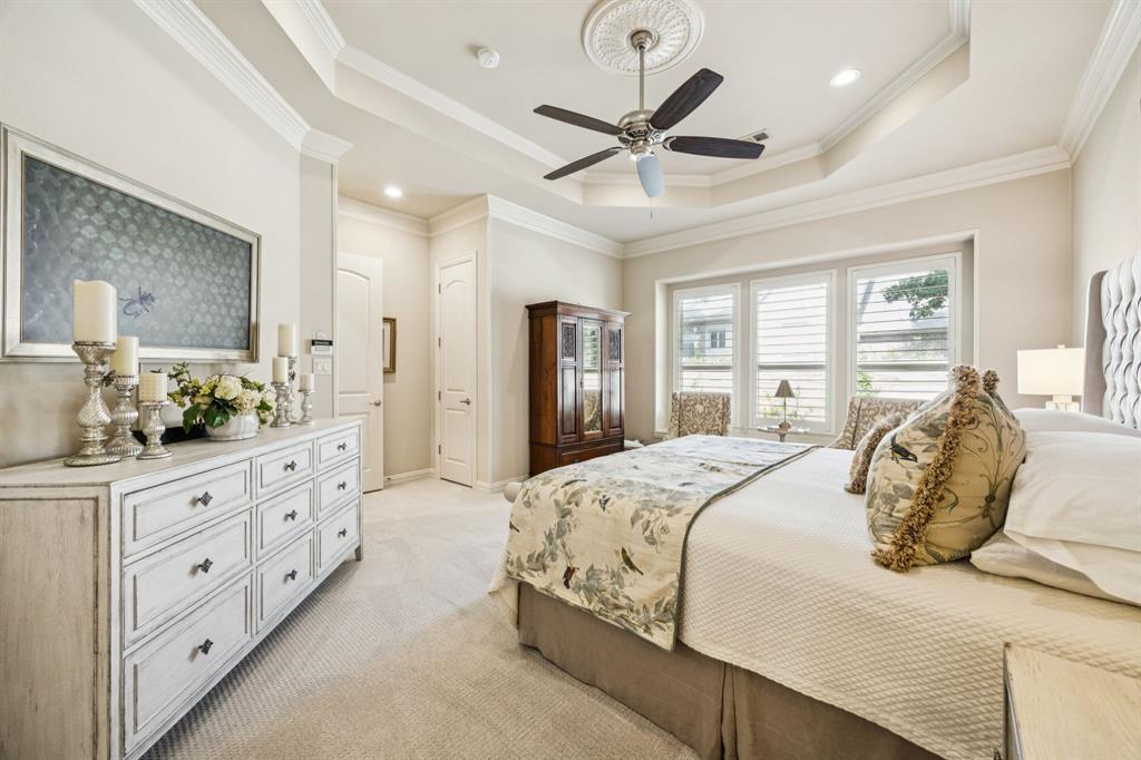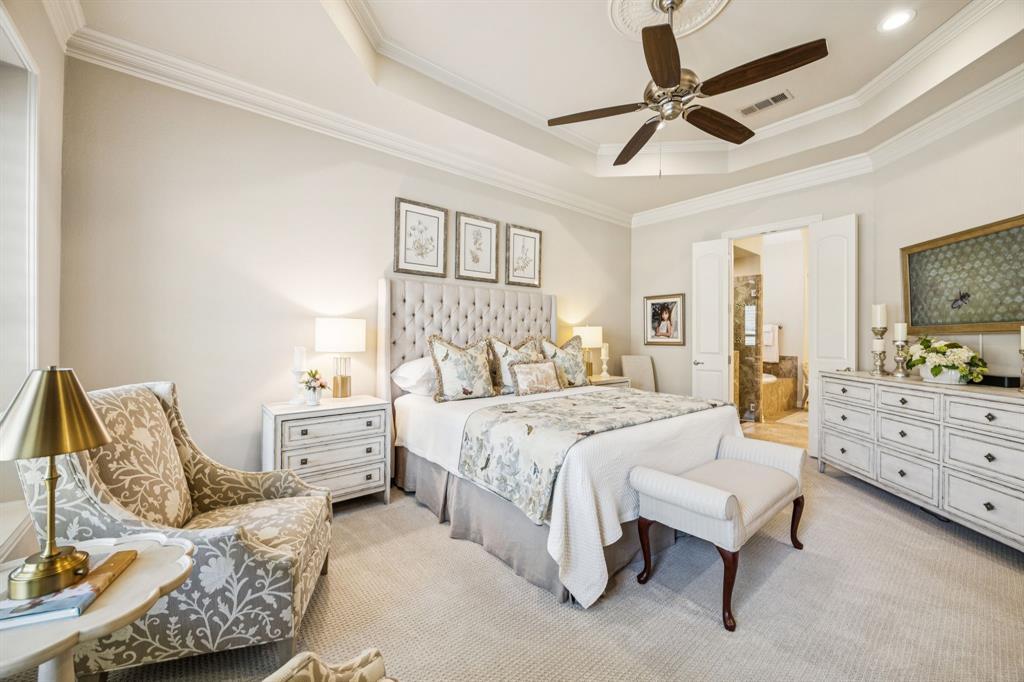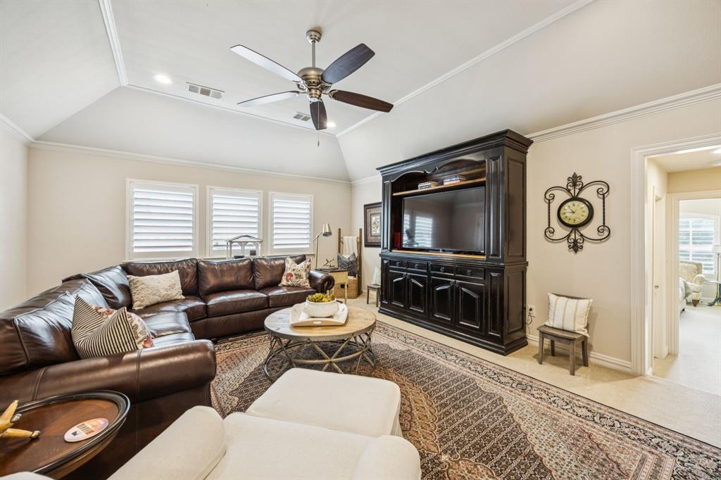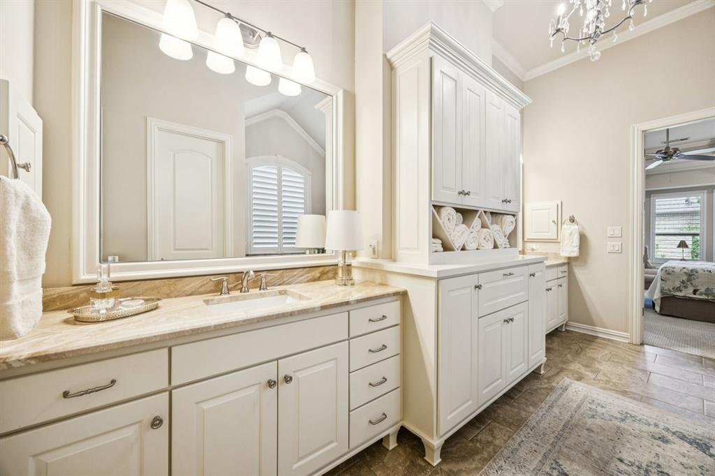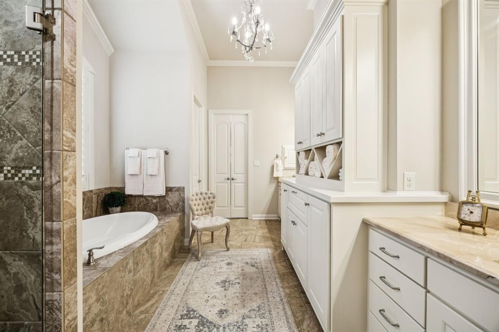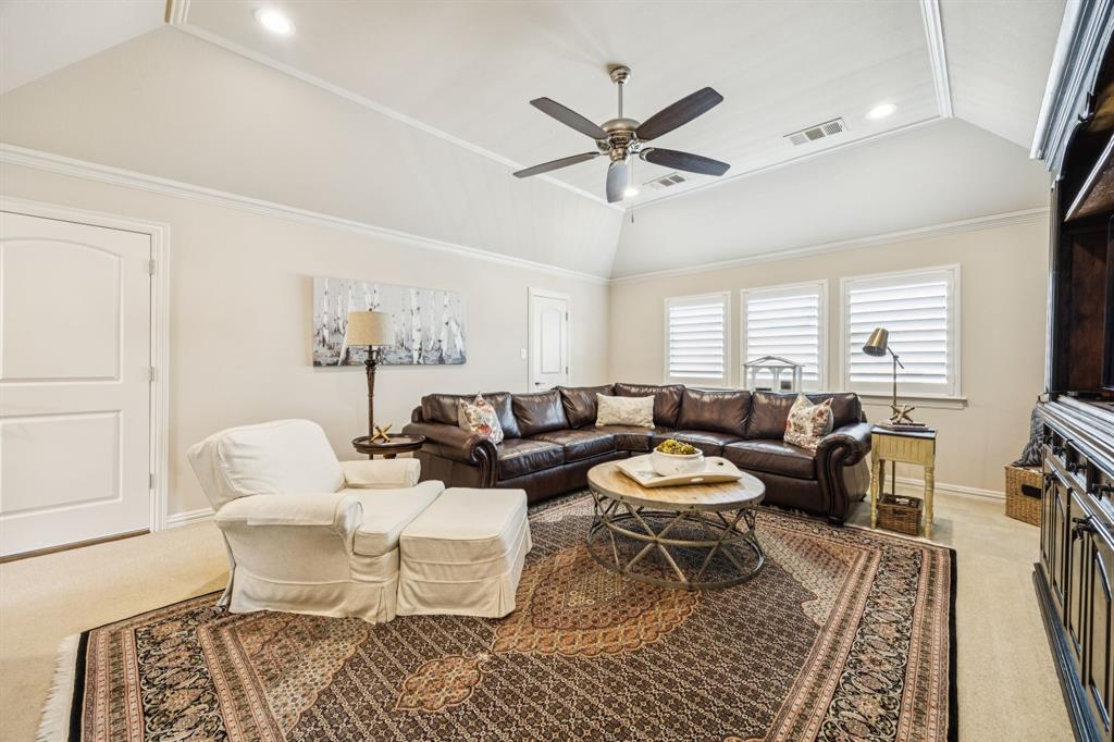 Tucked away on a quiet cul-de-sac, this exquisitely maintained, turnkey ready, custom home offers refined living in every detail. From rich, hand-scraped hardwood floors to elegant coffered ceilings, each space radiates timeless sophistication and everyday comfort. A dedicated home office offers the perfect space for working remotely or managing day-to-day tasks in style. A spacious guest suite with a full private bath is located on the main level—ideal for a mother-in-law suite, visiting guests, or multi-generational living. The heart of the home is a gourmet chef’s kitchen, thoughtfully designed with stainless steel appliances, gas cooktop, double ovens, a generous center island, breakfast bar seating, additional dining area and an walk-in pantry—perfect for hosting and holiday prep alike. The kitchen flows seamlessly into a warm and inviting living area, complete with a built-in bar, cozy fireplace with plantation shutters throughout add a layer of classic charm. The luxurious primary suite is a true retreat extends into the spa-inspired primary bathroom. Enjoy a jetted soaking tub, separate shower, and a thoughtfully designed walk-in closet with direct access to the laundry room for ultimate convenience.Step outside to your private backyard oasis, where a covered patio with retractable screen, gas fireplace, and built-in gas line for grilling make year-round outdoor entertaining effortless. Whether it's a quiet evening or a lively gathering, this space offers unmatched comfort and versatility. Upstairs, you’ll find a third bedroom with a full bath and a versatile flex space—ideal as a game room, media room, playroom, or additional lounge area. With a smart layout, abundant storage, and high-end finishes throughout, this home is a rare blend of comfort, beauty, and function. Located in a sought-after neighborhood, this one is not to be missed.