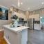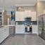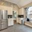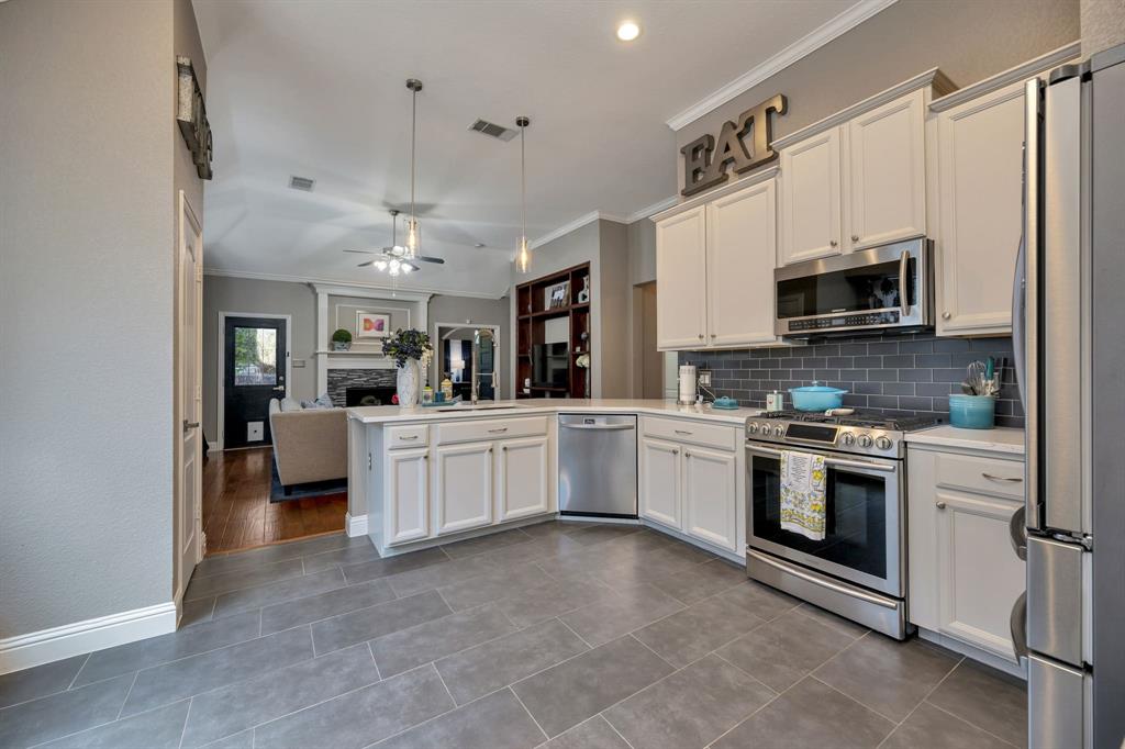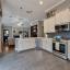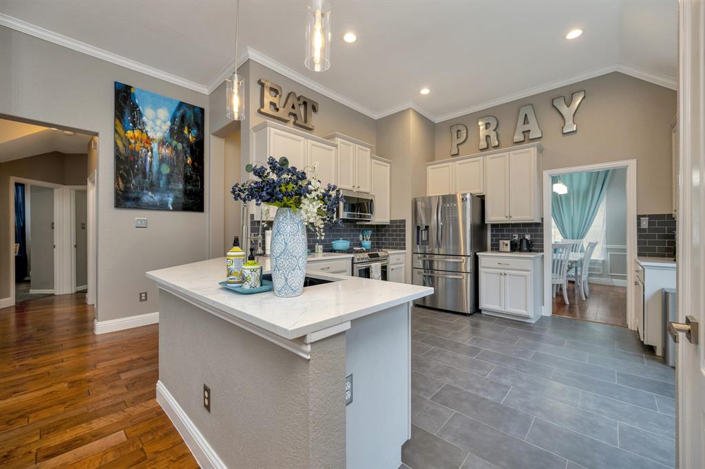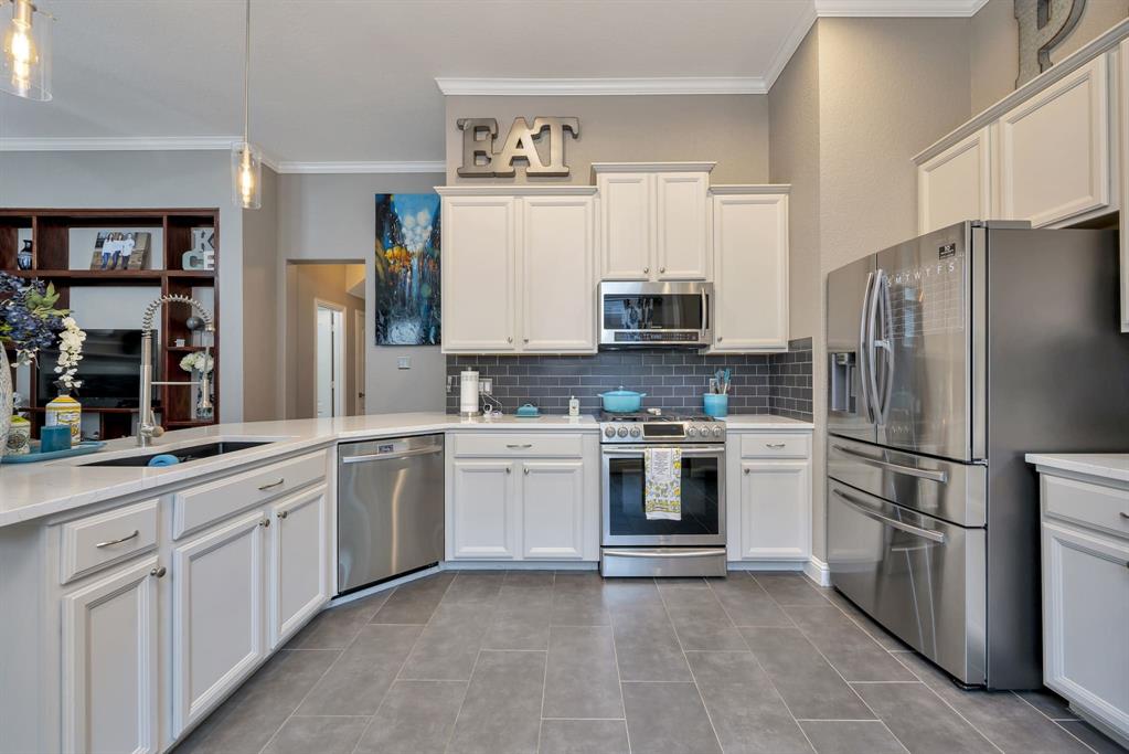The kitchen is a showstopper with sleek quartz countertops, stainless steel appliances, crisp white cabinetry, and a striking subway tile backsplash. A spacious island with pendant lighting provides the perfect spot for casual dining and entertaining.