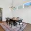 Continuing on, the home opens up to a spacious living area with high ceilings and large windows that flood the space with natural light. The room is anchored by a charming white brick fireplace and flows seamlessly into the dining room and a stunning, modern kitchen. The kitchen is a true centerpiece, featuring a large island with bar stool seating, ceiling-high cabinetry, elegant quartz countertops, and a classic white tile backsplash.