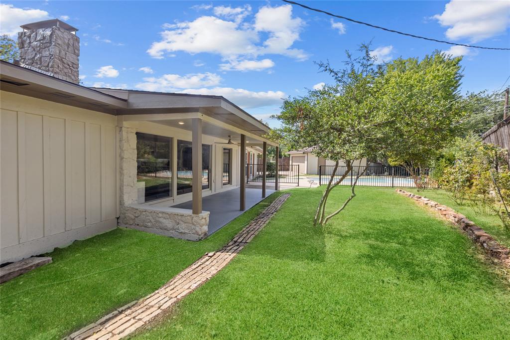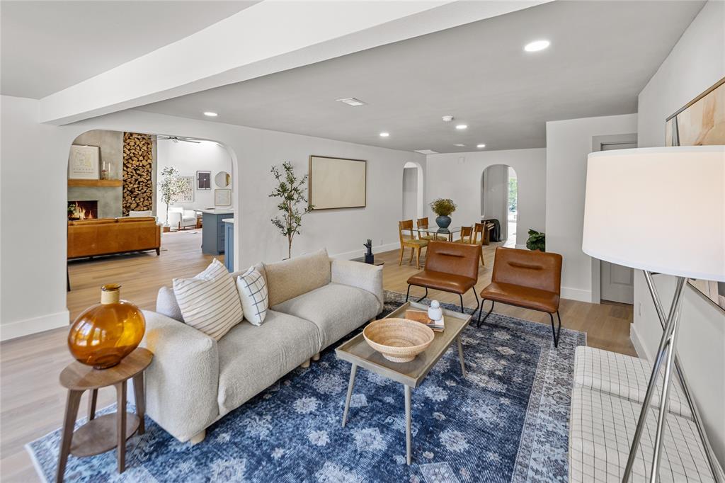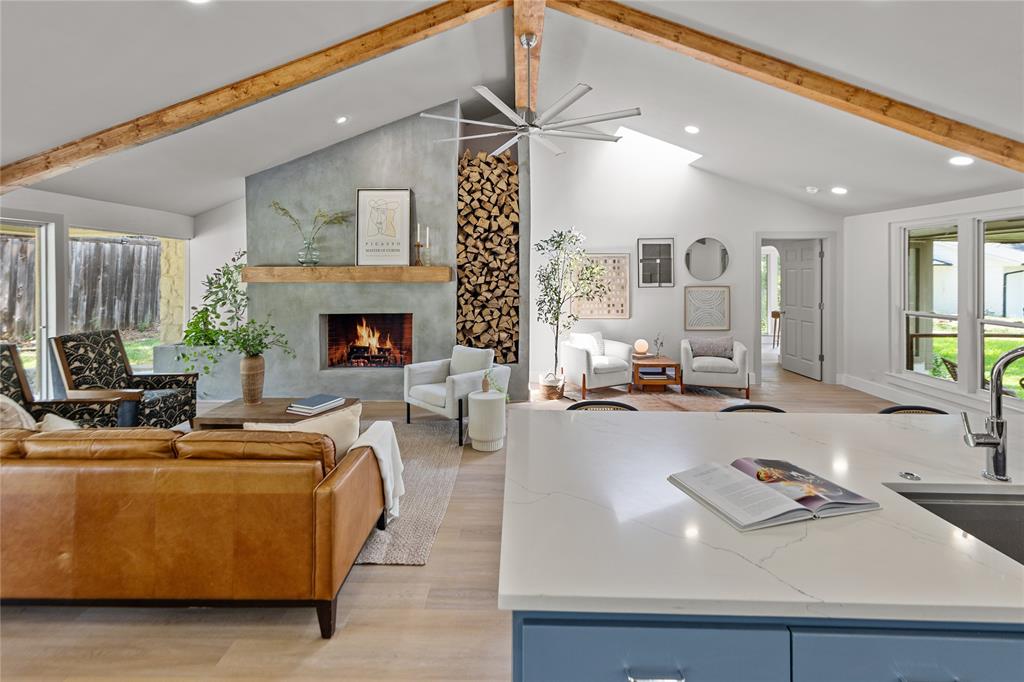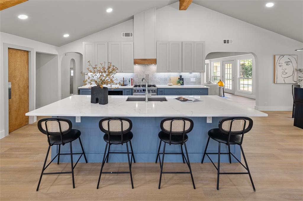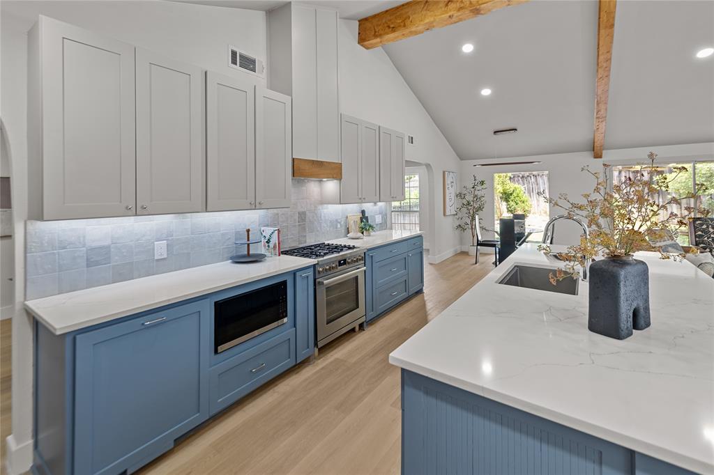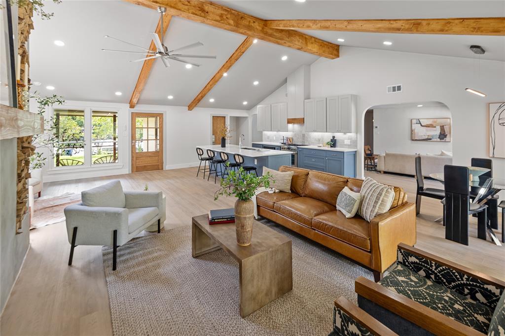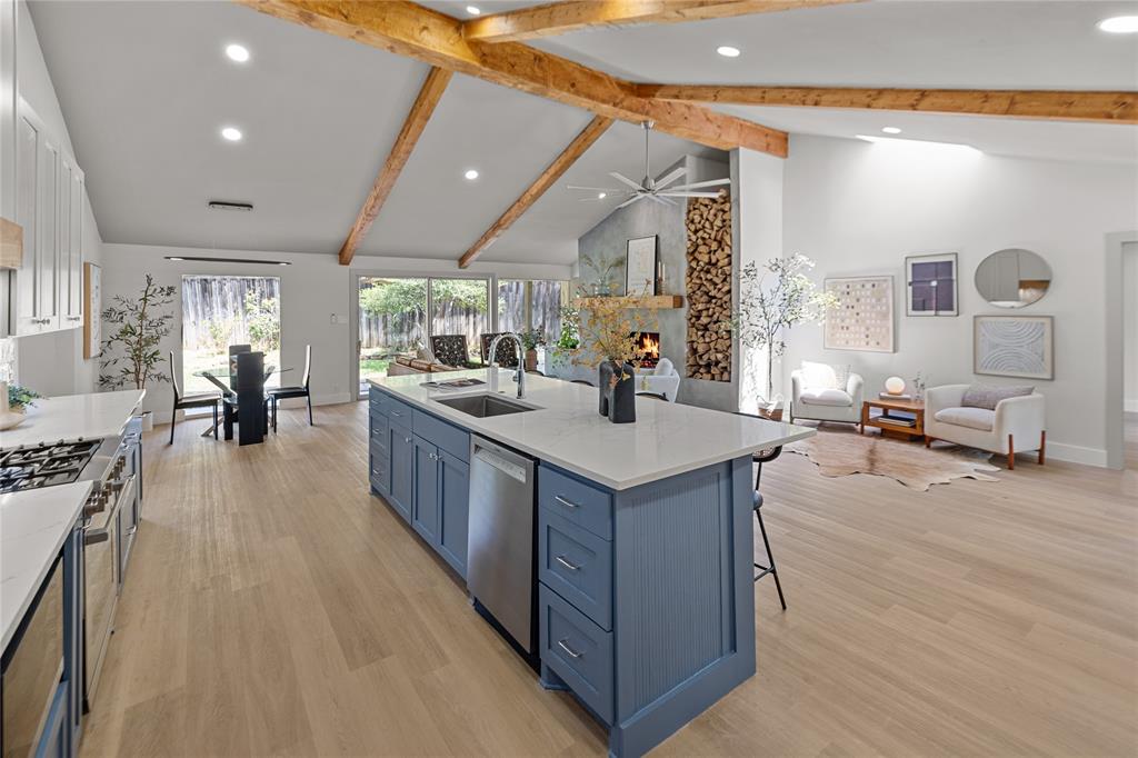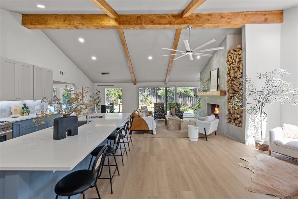 The heart of the home is the expansive open-concept living area, where soaring vaulted ceilings and exposed wood beams create a dramatic sense of space. Anchoring the room is a striking fireplace feature wall, complete with a stacked wood niche that blends style with function. Wide-plank flooring flows throughout, enhancing the home’s light and airy feel. The gourmet kitchen is a true centerpiece, featuring an oversized quartz island with a bold blue finish, stainless steel appliances, custom cabinetry, and a gas range fit for a chef. The seamless connection between the kitchen, dining, and living spaces allows for effortless entertaining and family gatherings. The primary suite is a private retreat, offering a spa-inspired bath with dual vanities, a walk-in shower, a soaking tub, and generous closet space. An additional primary plus 3 bedrooms provide flexibility for guests, children, or dedicated office space, while 3.5 well-appointed bathrooms showcase modern fixtures and finishes. Step outside to your personal oasis, where a sparkling pool is framed by lush greenery and mature landscaping. The spacious backyard is perfect for summer barbecues, outdoor dining, or quiet evenings under the stars. Additional highlights include a dedicated laundry room, multiple living areas, and a detached garage with ample storage. Located in one of Dallas’ most desirable areas, this home offers convenient access to premier schools, shopping at Galleria and the city’s finest dining and entertainment. Blending timeless style with contemporary updates, this North Dallas gem is more than a house—it’s a lifestyle.
