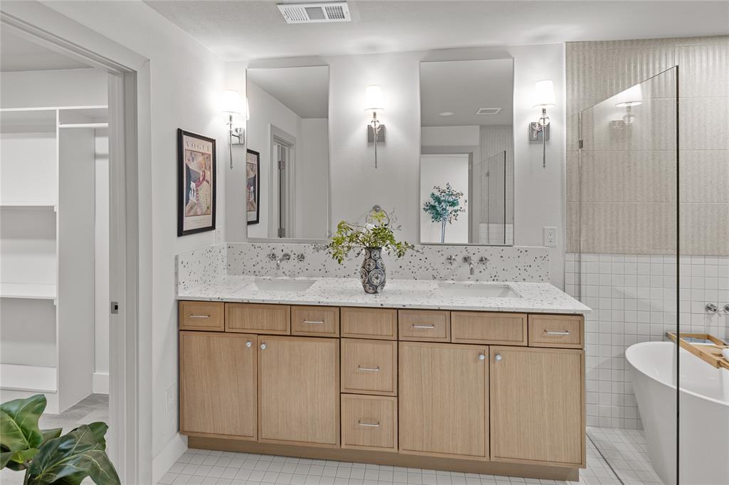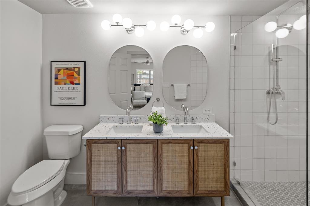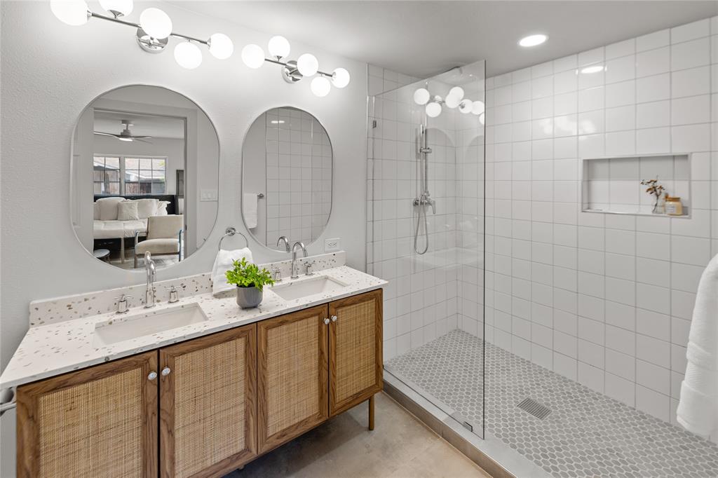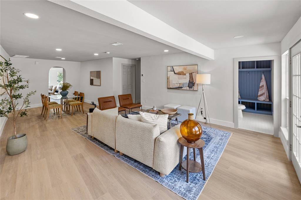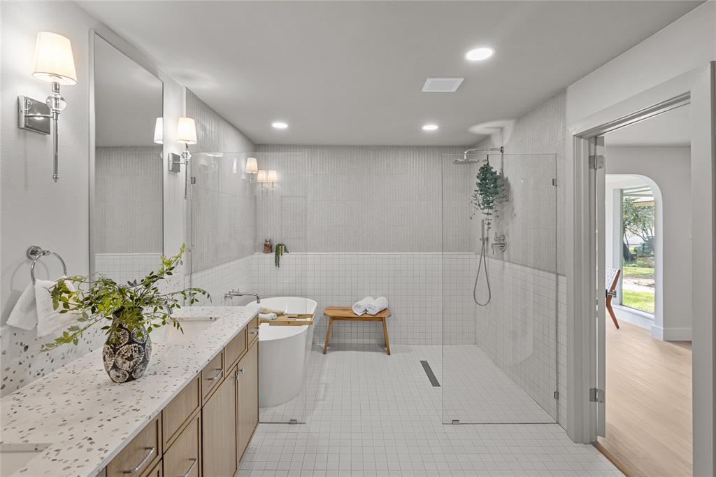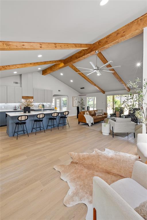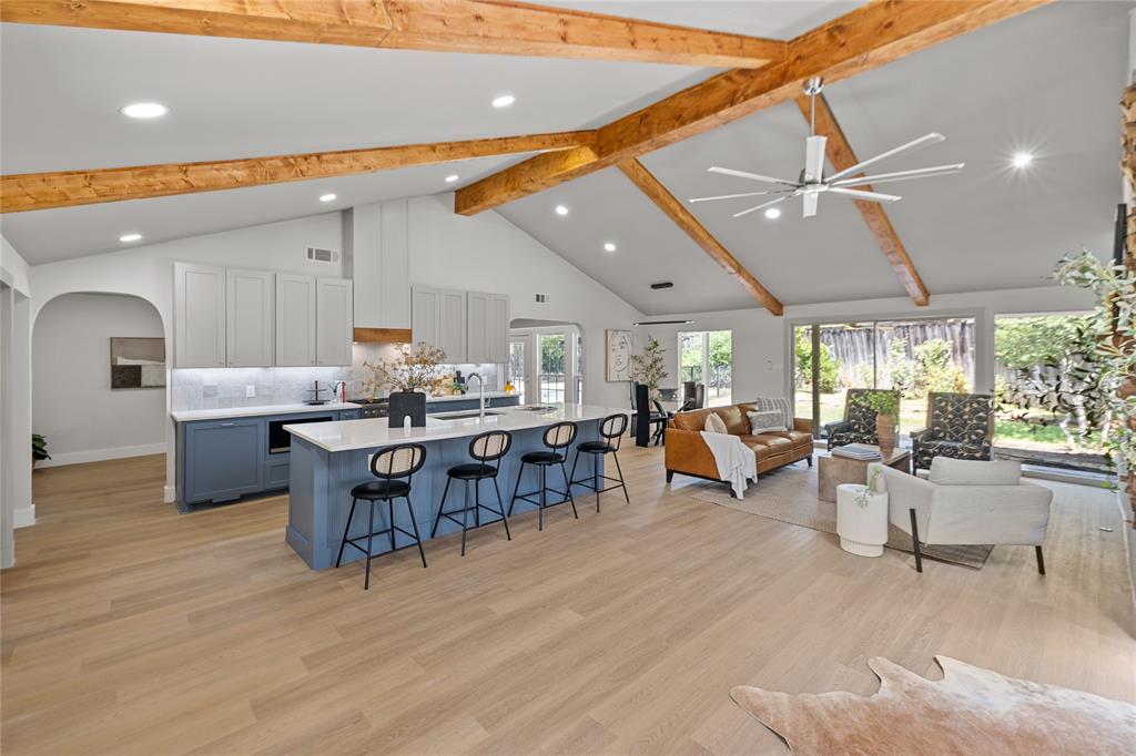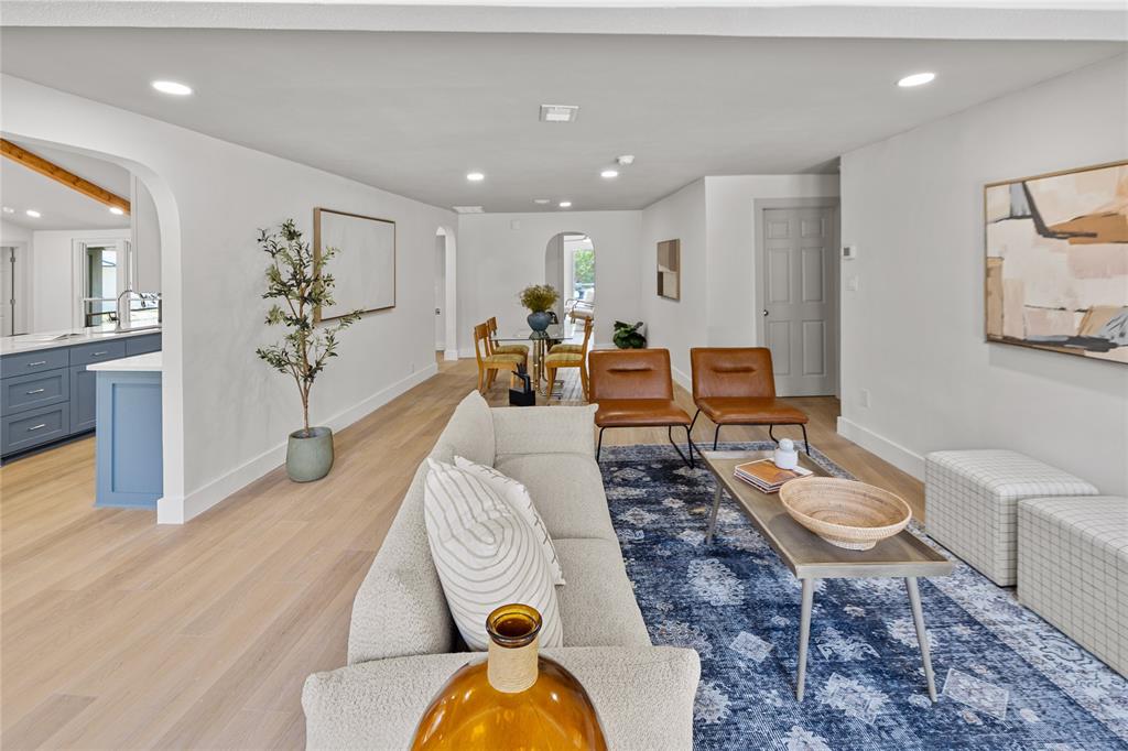 The heart of the home is the expansive open-concept living area, where soaring vaulted ceilings and exposed wood beams create a dramatic sense of space. Anchoring the room is a striking fireplace feature wall, complete with a stacked wood niche that blends style with function. Wide-plank flooring flows throughout, enhancing the home’s light and airy feel. The gourmet kitchen is a true centerpiece, featuring an oversized quartz island with a bold blue finish, stainless steel appliances, custom cabinetry, and a gas range fit for a chef. The seamless connection between the kitchen, dining, and living spaces allows for effortless entertaining and family gatherings. The primary suite is a private retreat, offering a spa-inspired bath with dual vanities, a walk-in shower, a soaking tub, and generous closet space. An additional primary plus 3 bedrooms provide flexibility for guests, children, or dedicated office space, while 3.5 well-appointed bathrooms showcase modern fixtures and finishes. Step outside to your personal oasis, where a sparkling pool is framed by lush greenery and mature landscaping. The spacious backyard is perfect for summer barbecues, outdoor dining, or quiet evenings under the stars. Additional highlights include a dedicated laundry room, multiple living areas, and a detached garage with ample storage. Located in one of Dallas’ most desirable areas, this home offers convenient access to premier schools, shopping at Galleria and the city’s finest dining and entertainment. Blending timeless style with contemporary updates, this North Dallas gem is more than a house—it’s a lifestyle.