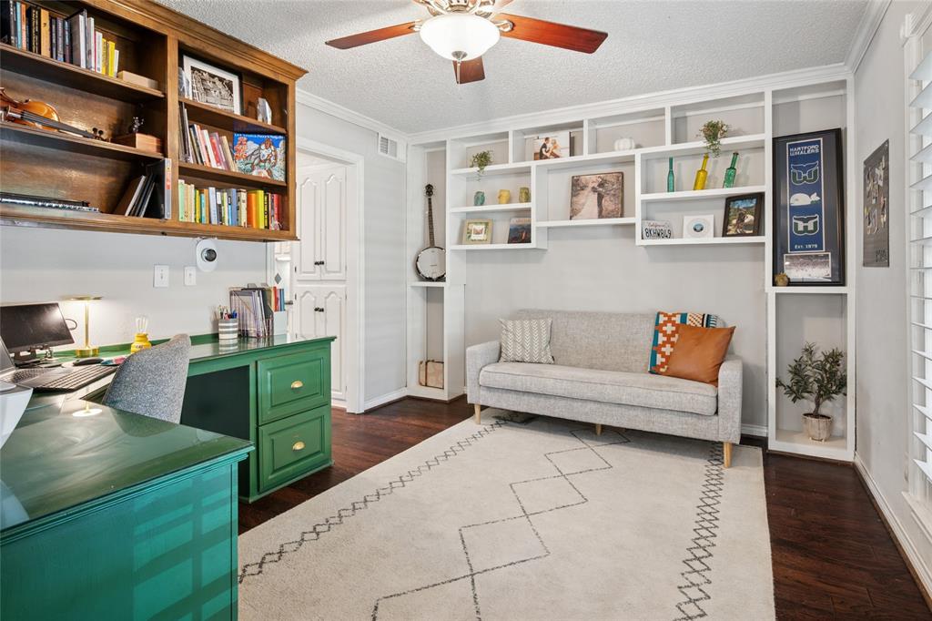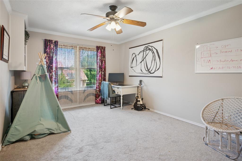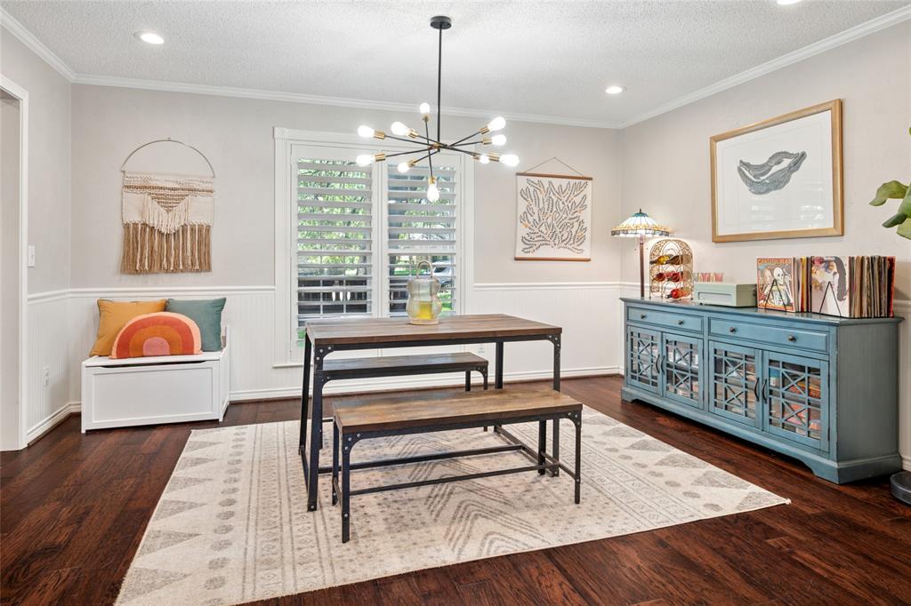 Prime location at the end of a cul-de-sac and loaded with charm! With a balcony across the entire front of the home and a welcoming front porch, you'll feel right at home. A beautiful stained door with sidelights opens to the foyer with gleaming hardwoods and an open concept floor plan. A home office is to the right as you enter with plantation shutters opening to the front yard. One of the home's two fireplaces is the focal point of the living room. An island with granite anchors the kitchen with stainless appliances. The breakfast room has a bay window with a window seat overlooking the backyard. The game room downstairs has the other fireplace flanked by built-ins. A full bath and a big laundry room are nearby. The primary bedroom suite has French doors opening to the balcony and an ensuite bath. Three secondary and quite spacious bedrooms are also upstairs The private backyard offers a sparkling pool with an elevated spa, a pergola extending the covered patio area, and artificial turf for easy maintenance. Windows have been replaced. Cast iron pipes replaced in 2022. This West Plano home will embrace you from the moment you arrive!