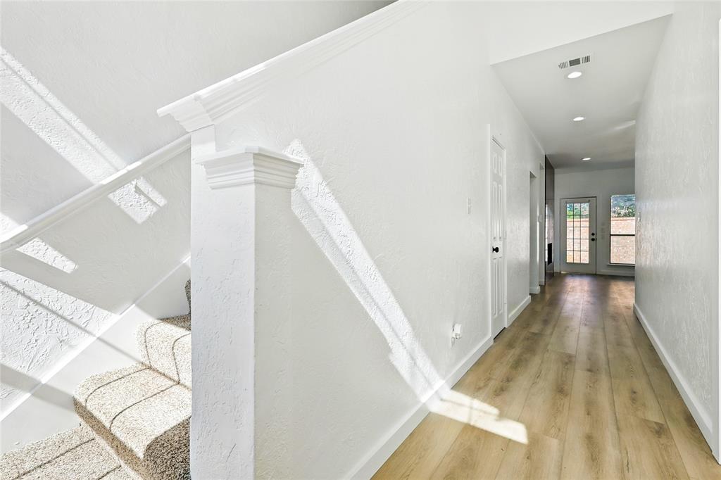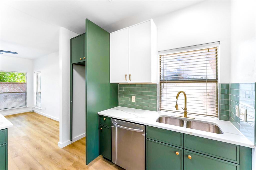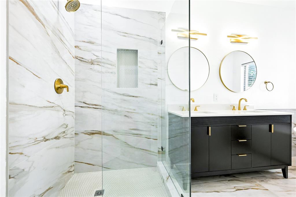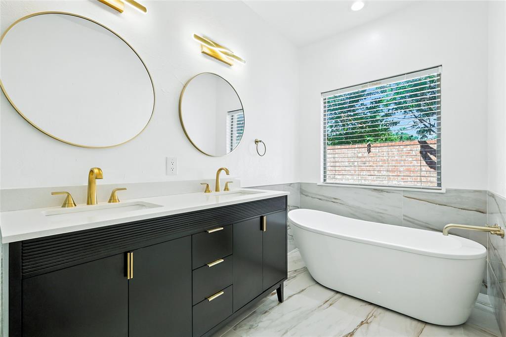 Welcome to 1800 Hyde Park Ct, a beautifully remodeled 3-bedroom, 2.5-bath, 2-story home hidden away in a private cul-de-sac with no HOA, offering peace, privacy, and freedom in Flower Mound. The heart of the home is a stunning designer kitchen featuring two-tone cabinetry, brushed gold hardware, quartz countertops with elegant gray veining, and a bold green subway tile backsplash that adds the perfect pop of color. Stainless steel appliances, stylish pendant lighting, and open flow into the living area make this space ideal for entertaining. Anchored by a dramatic black marble fireplace, the living room is filled with natural light from oversized windows. The spacious primary suite provides a serene retreat with tall ceilings and wide-plank flooring. Its spa-inspired en-suite bath showcases a sleek dual vanity with gold accents, a walk-in glass shower wrapped in marble tiling, and a freestanding soaking tub beneath a sunlit window. Two additional bedrooms are generously sized and paired with updated jack & jill baths featuring modern finishes. Throughout the home, attention to detail shines — from designer fixtures and lighting to seamless flooring that unites every space. Outside, the low-maintenance yard offers a private brick-walled patio shaded by mature trees — perfect for entertaining or relaxing without the upkeep. This property sits in the highly sought-after Flower Mound ISD and is just minutes from Grapevine Lake, Parker Square, DFW Airport, and local dining and shopping, giving you the ideal blend of tranquility and convenience. Don’t miss your chance to own this one-of-a-kind home where thoughtful design, location, and lifestyle converge. Be sure to check out the virtual tour and come see it for yourself!