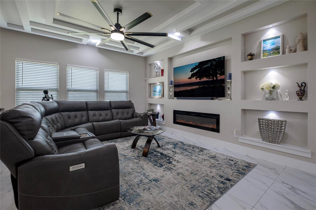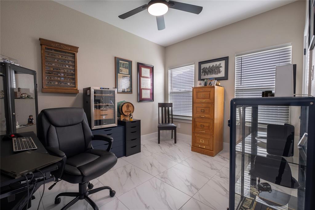 Upgrades include a new irrigation system in the front and back yard, window screens, and gutters that were added by the current owners. Inside, you’ll find luxury porcelain tile throughout the entire home—including the garage—paired with soaring 9-foot ceilings. The open-concept kitchen boasts quartz countertops, an island overlooking the living area, abundant cabinetry, and a gorgeous backsplash that continues into the bathrooms.