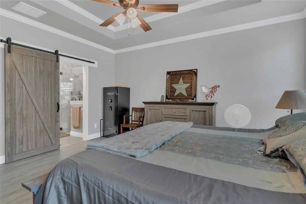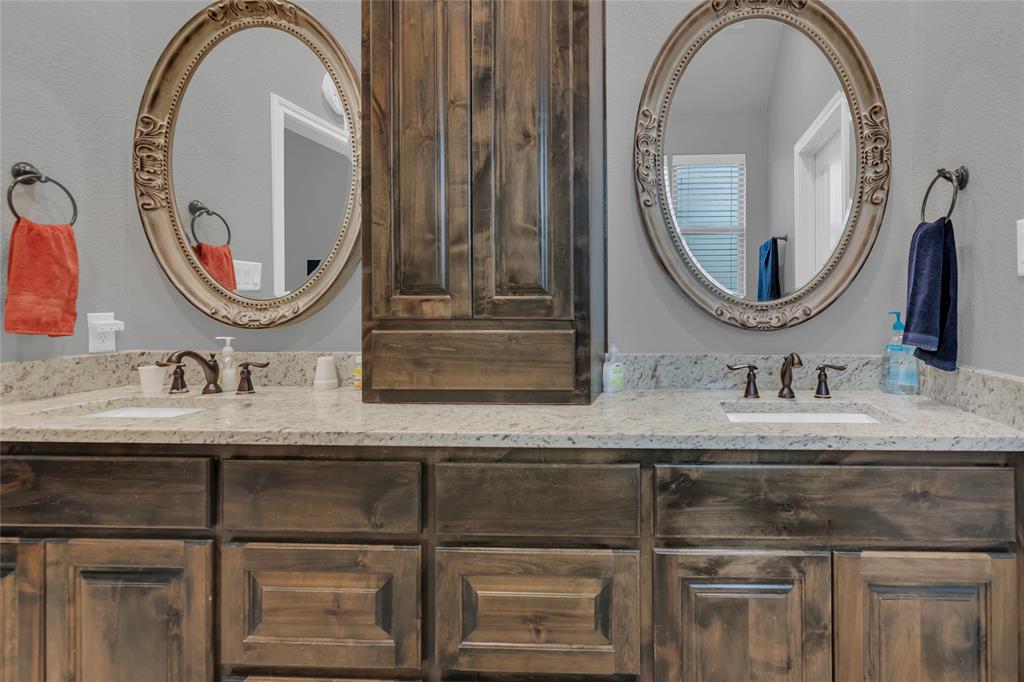 The heart of the home is the gourmet kitchen, featuring custom cabinetry, sleek granite countertops, and stainless steel appliances—ideal for both everyday cooking and entertaining. The split floor plan provides added privacy, with a spacious primary suite complete with a luxurious walk-in shower adorned with stone tile accents and double sinks. The secondary bathroom also includes dual vanities for added convenience.
