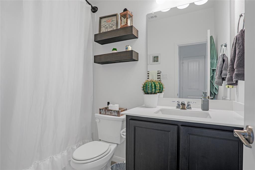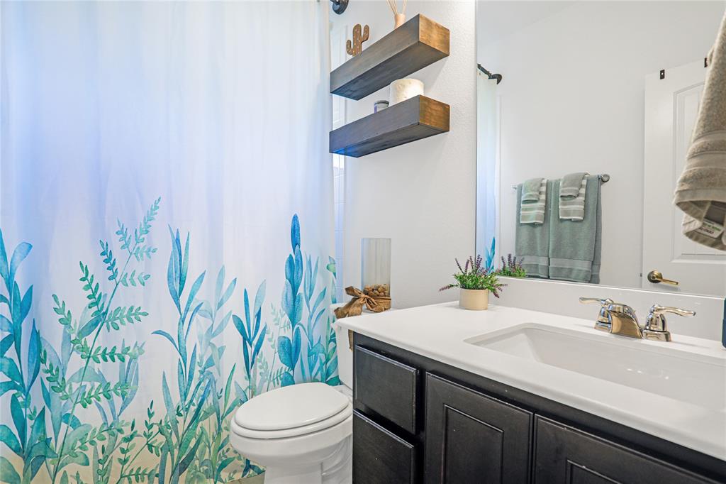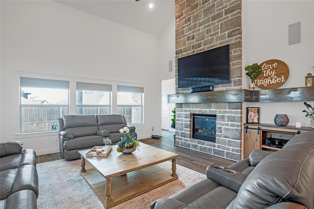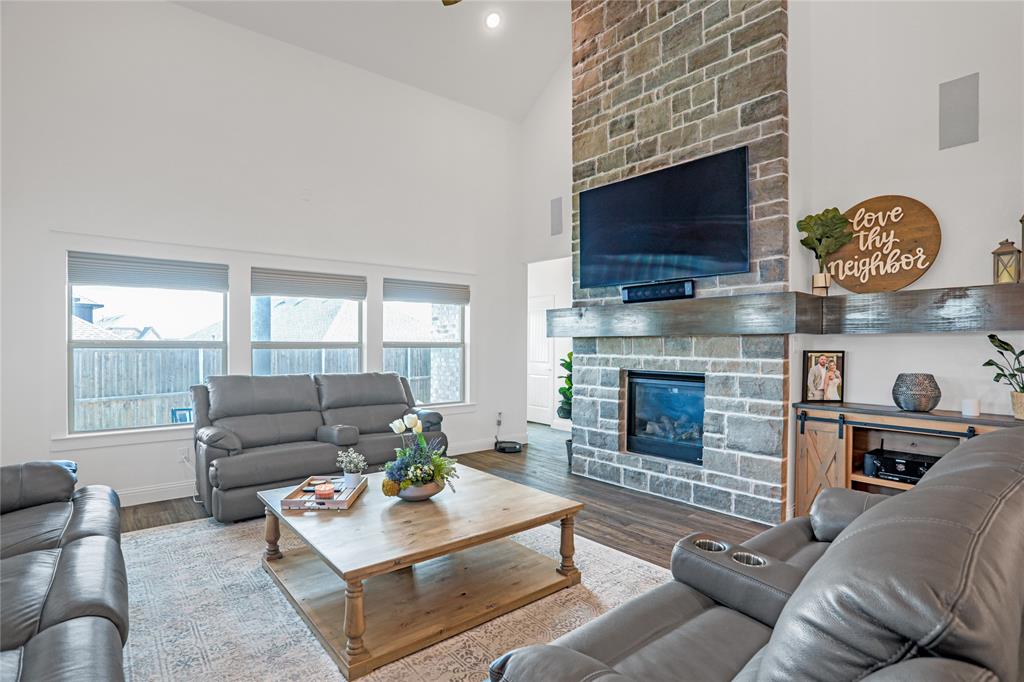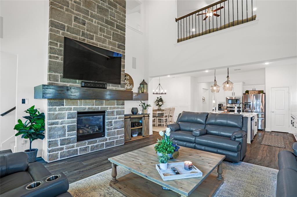 Step inside to soaring vaulted ceilings in the living room complete with Klipsch Surround Sound, highlighted by a dramatic floor-to-ceiling fireplace with oversized mantel and rustic wood beam accents. The windows in the living room feature remote controlled shades. The kitchen showcases granite countertops, subway tile backsplash, stainless steel appliances (FRIDGE STAYS), and plenty of cabinetry, while the dining room is enhanced with custom wainscoting. The primary suite features a beautiful shiplap accent wall, and all three bathrooms include custom wood floating shelves for style and function.