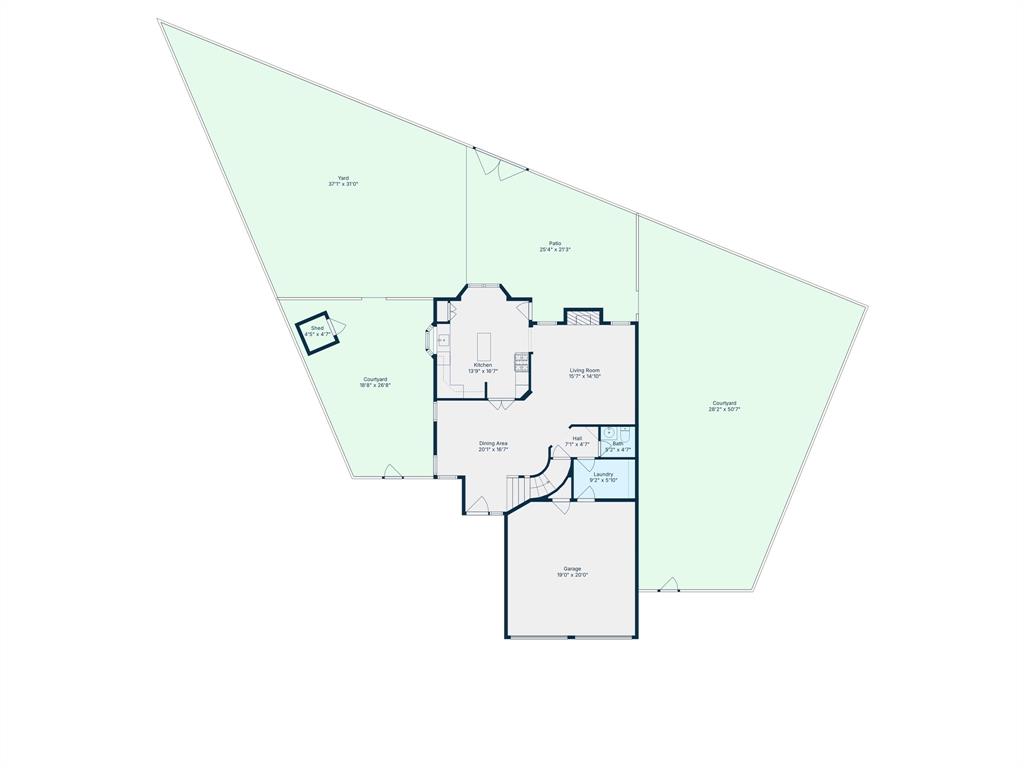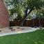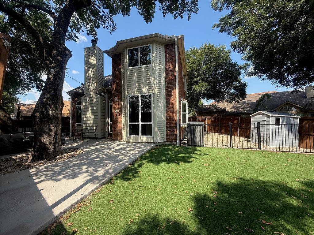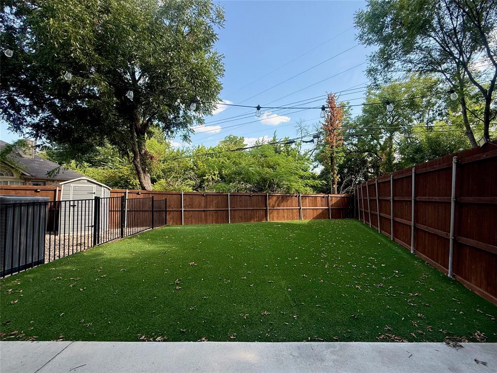 Designed for easy living and entertaining, the backyard oasis boasts a low-maintenance turf lawn and walkway to connect three unique outdoor spaces: a welcoming main patio, a cozy courtyard with a smokeless fire pit, and a second courtyard with a storage shed—all enclosed by a warm wood fence for privacy.
