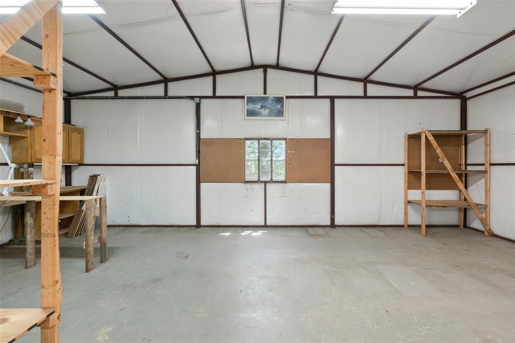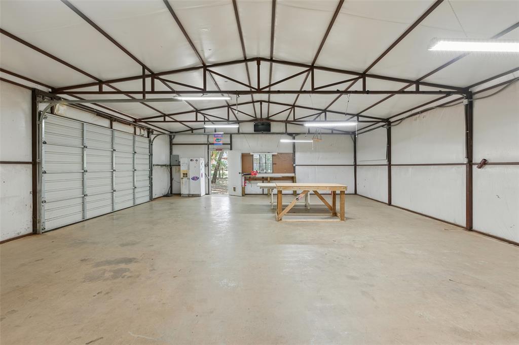 A large 50 x 30 workshop, equipped with electricity, a 50 amp RV hookup, and a 250-volt plug, offers abundant space for hobbies, projects, and storage—ideal for lawn equipment or even a boat.