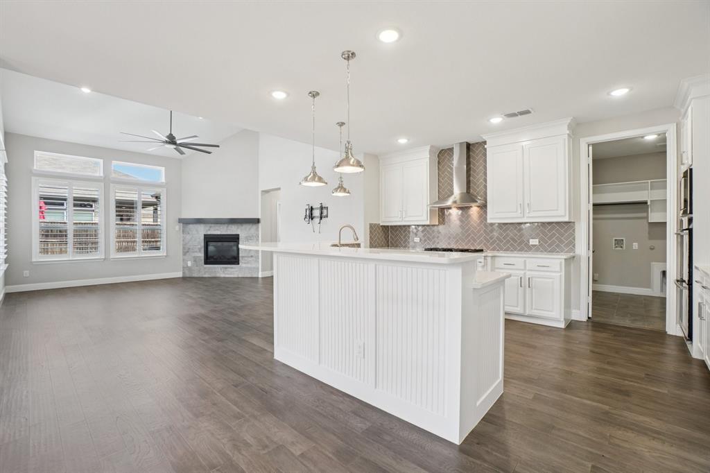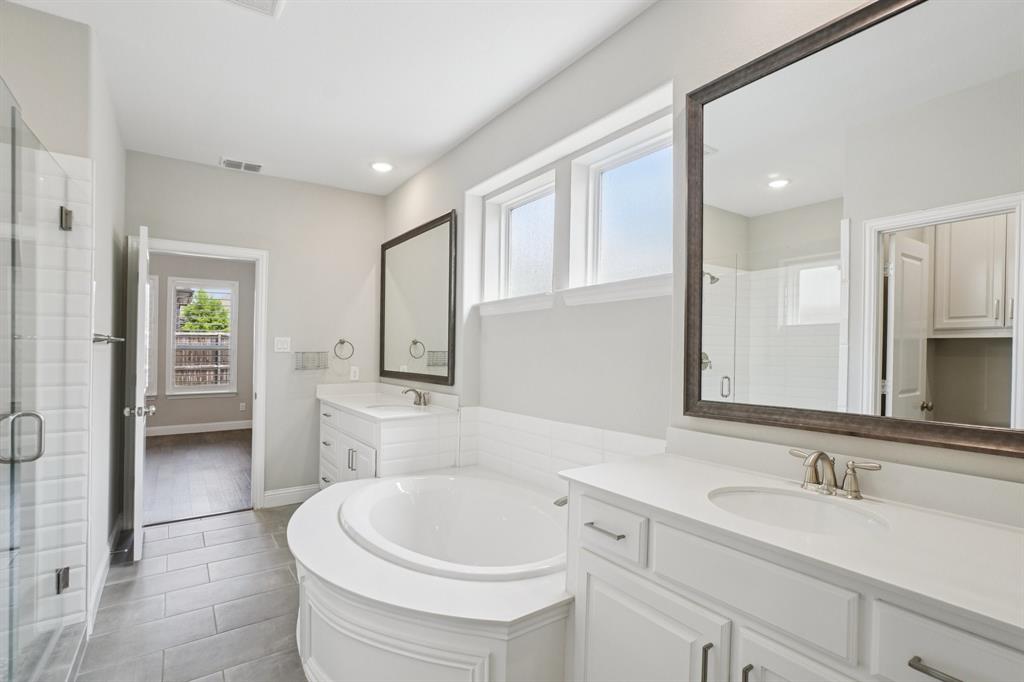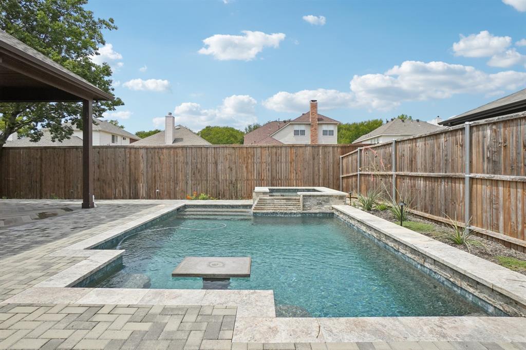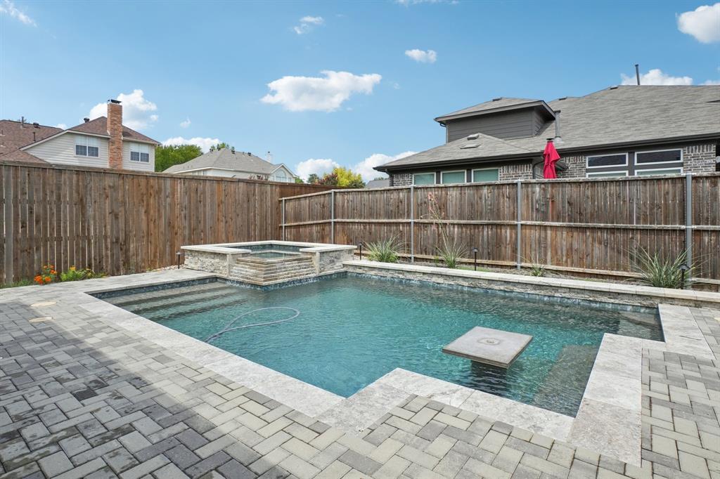 Beautiful luxurious home with swimming pool in a great location! Stunning curb appeal with stone elevation and nice landscaping. Wood floors adorn the majority of the home including bedrooms. Soaring Ceilings in entry & family room. Gourmet kitchen with quartz counters, 6 burner cooktop with steel vent hood, dbl ovens, farm sink, & stainless appliances. Primary Bedroom is perfect for king size furniture. Primary bath with dual sinks, oversized shower, & garden soaking tub. Backyard with covered patio is perfect for outdoor living & entertaining. Enjoy the swimming pool featuring travertine, pebble tech finish, hot tub with waterfall, and bench with umbrella table. Additional upgrades include upgraded lighting, plantation shutters, media room in wall speakers, and so much more. This home is a MUST SEE!