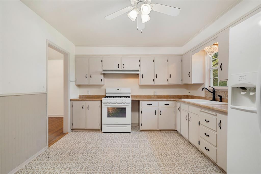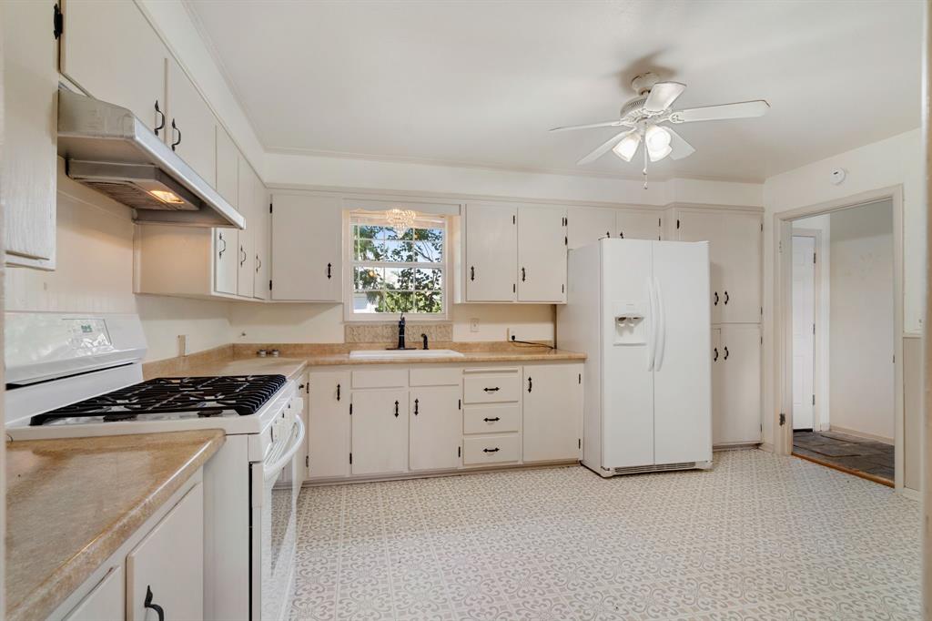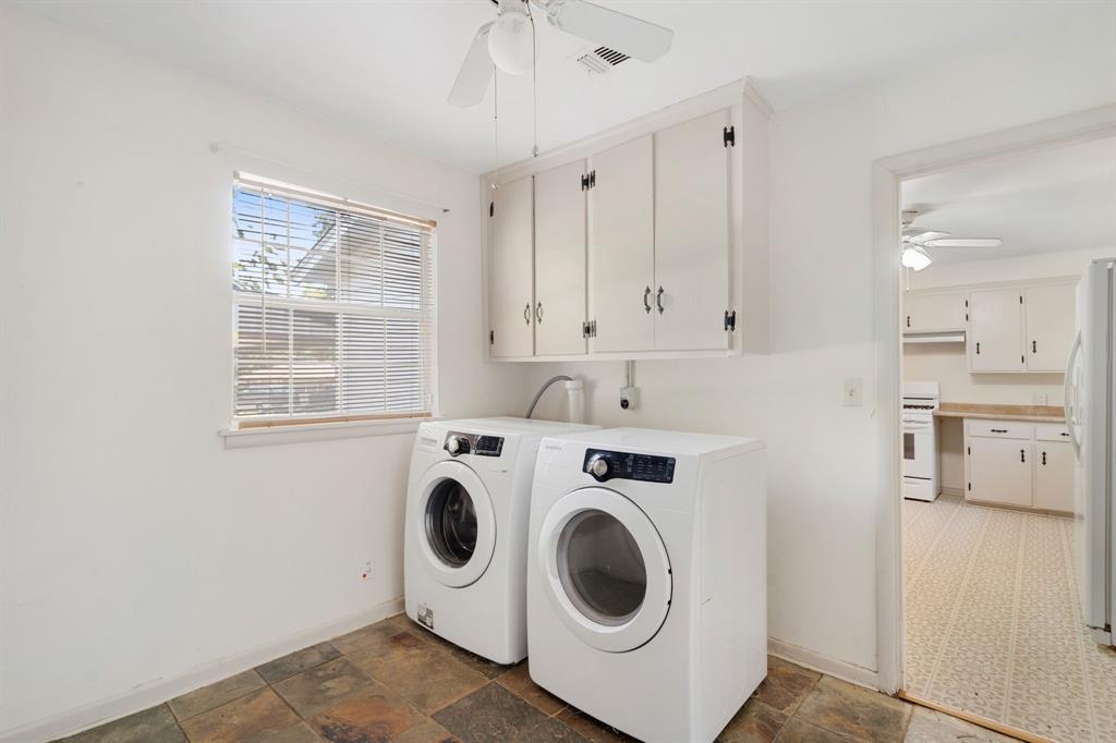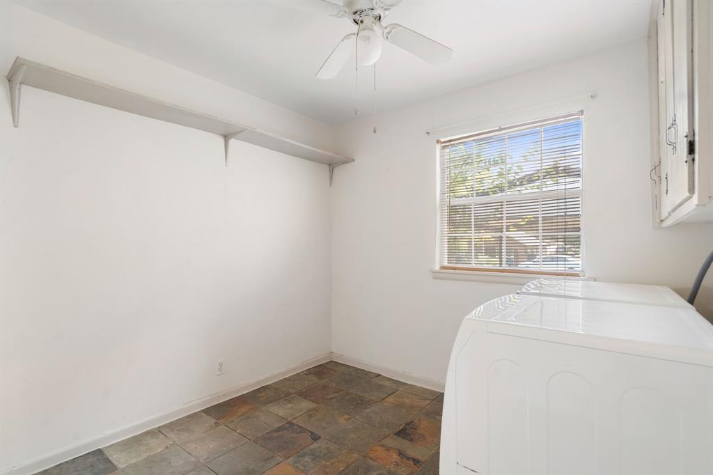 The spacious and bright living room features large windows that fill the space with natural light. The well-appointed kitchen boasts white cabinetry and a double sink, with a refrigerator that will stay with the home. A washer and dryer are also included, making this home move-in ready.