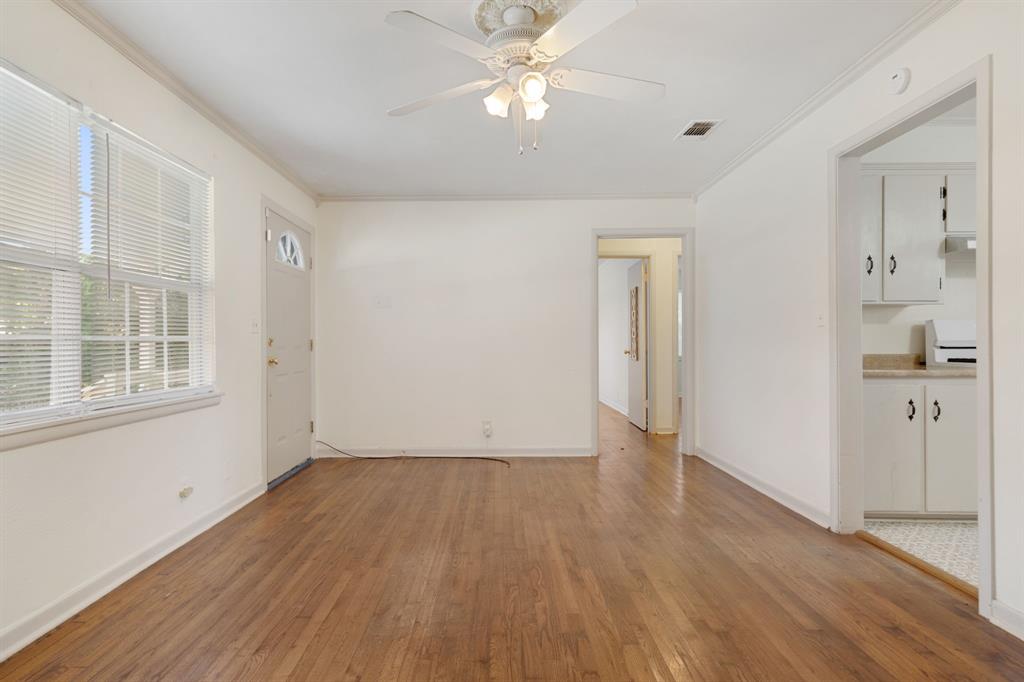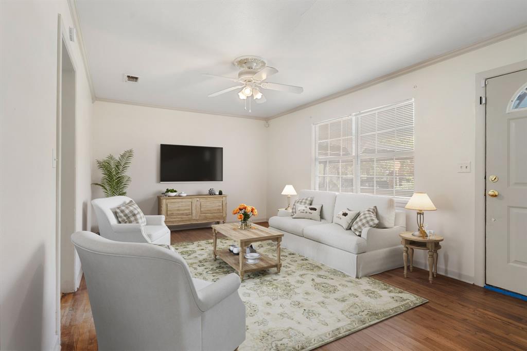 Welcome to this charming 2-bedroom, 1-bathroom home, a true Springtown gem! The inviting front porch, with its light blue ceiling and classic white railing, is the perfect spot to enjoy your morning coffee. As you step inside, you'll be greeted by beautiful original hardwood floors that flow throughout the main living areas, adding warmth and character.
