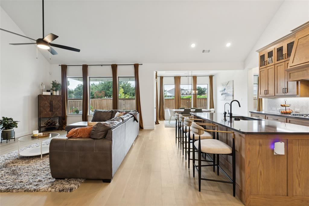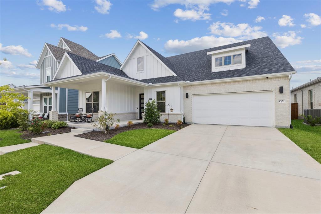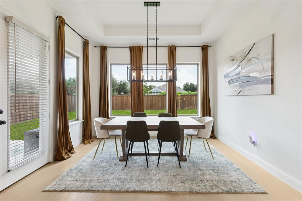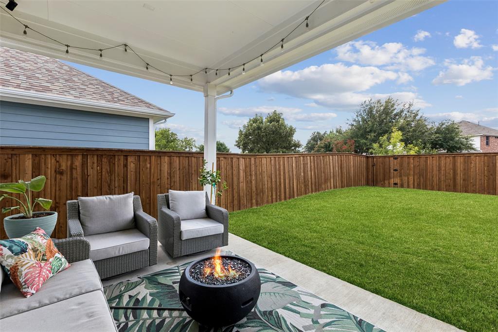 Welcome to this beautifully designed 4-bedroom, 2-bath home offering the perfect blend of style and function. A dedicated office provides the ideal space for work or study, while the open floor plan and large windows fill the home with abundant natural light. The custom fireplace serves as a focal point in the spacious living room, enhanced by soaring 33-foot vaulted ceilings with a striking custom beam. The kitchen is well-appointed with a double oven and abundant workspace, and it opens effortlessly to the dining and living areas. The primary suite is a private retreat featuring a custom shower, dual sinks, and a large walk-in closet. Upstairs, a versatile game room adds additional living space. This home is also prewired for built-in speakers in the primary bath, game room, and backyard patio, making it perfect for both relaxation and entertaining. Additional highlights include engineered wood flooring, covered patios in both front and back, a gas line on the back patio, and a tandem garage offering added flexibility. The oversized backyard provides direct access to the neighborhood playground, while the landscaped grounds enhance the curb appeal. Conveniently located near George Bush Turnpike for commuters, with ample shopping, dining, and Lake Ray Hubbard just minutes away. Schedule your home tour today!