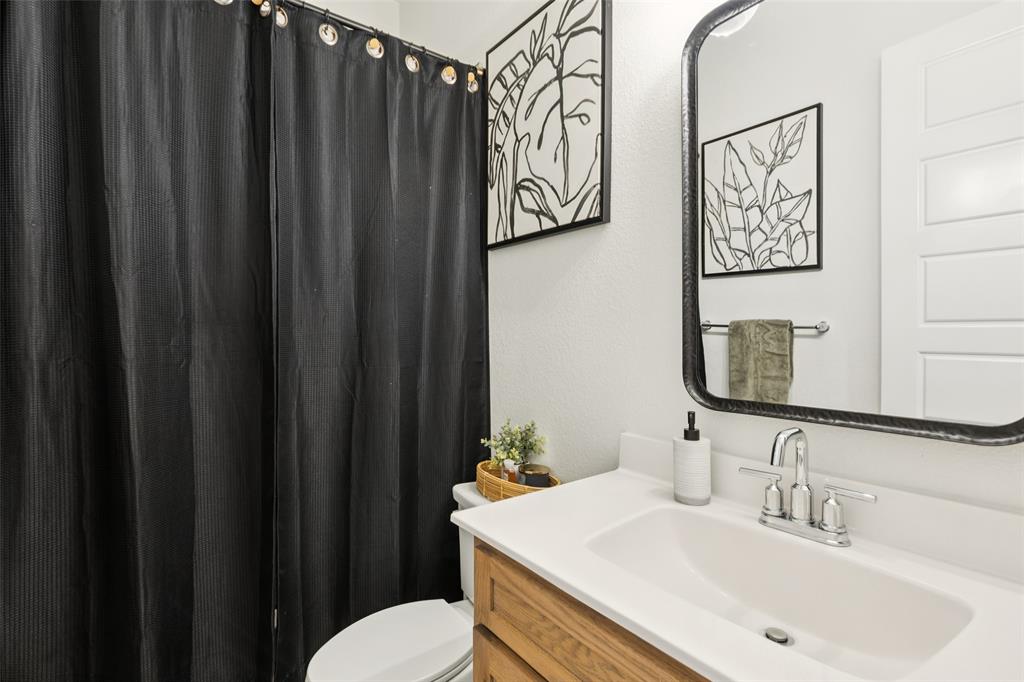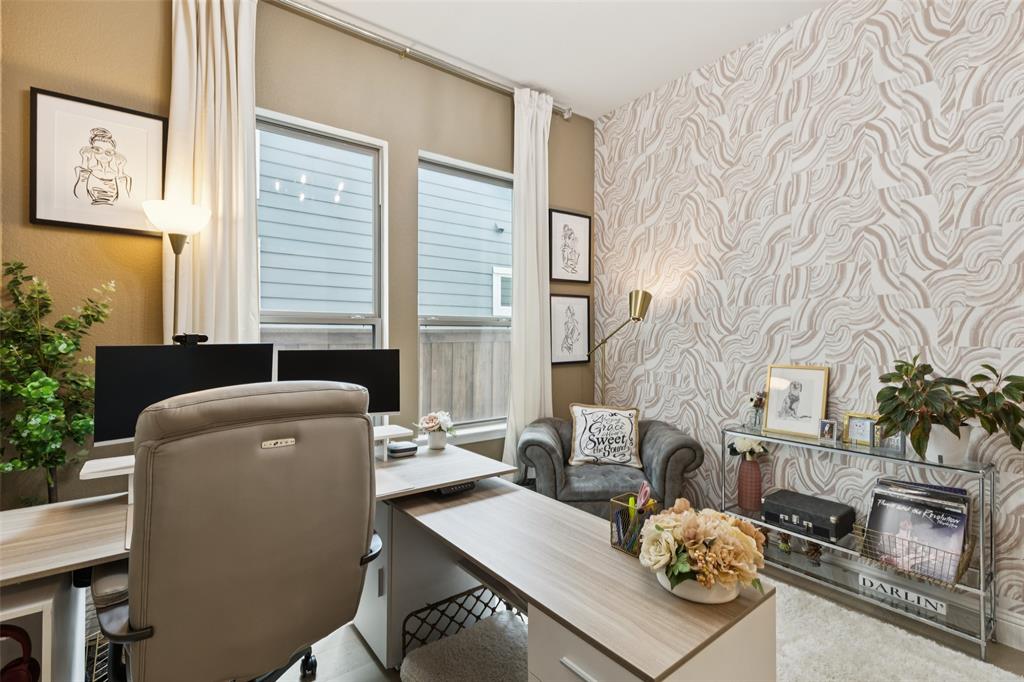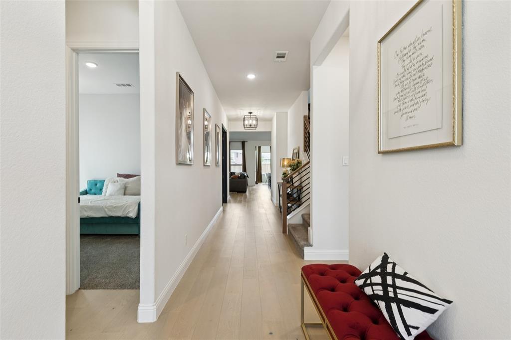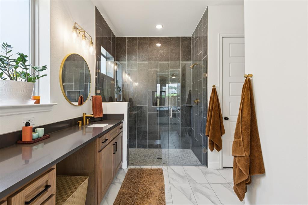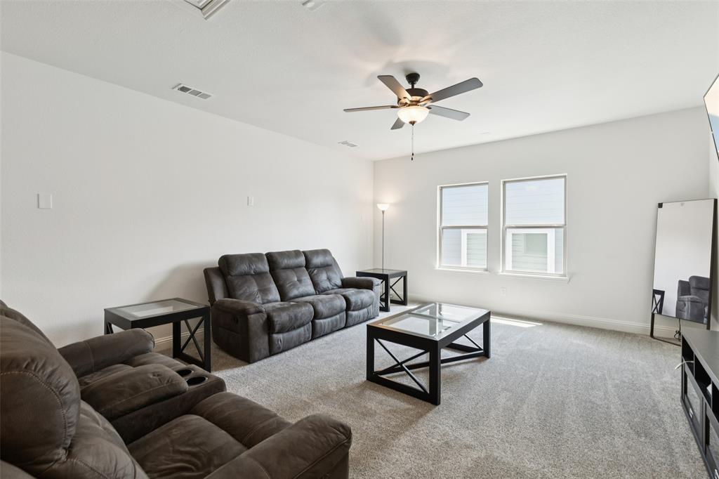 Welcome to this beautifully designed 4-bedroom, 2-bath home offering the perfect blend of style and function. A dedicated office provides the ideal space for work or study, while the open floor plan and large windows fill the home with abundant natural light. The custom fireplace serves as a focal point in the spacious living room, enhanced by soaring 33-foot vaulted ceilings with a striking custom beam. The kitchen is well-appointed with a double oven and abundant workspace, and it opens effortlessly to the dining and living areas. The primary suite is a private retreat featuring a custom shower, dual sinks, and a large walk-in closet. Upstairs, a versatile game room adds additional living space. This home is also prewired for built-in speakers in the primary bath, game room, and backyard patio, making it perfect for both relaxation and entertaining. Additional highlights include engineered wood flooring, covered patios in both front and back, a gas line on the back patio, and a tandem garage offering added flexibility. The oversized backyard provides direct access to the neighborhood playground, while the landscaped grounds enhance the curb appeal. Conveniently located near George Bush Turnpike for commuters, with ample shopping, dining, and Lake Ray Hubbard just minutes away. Schedule your home tour today!