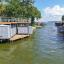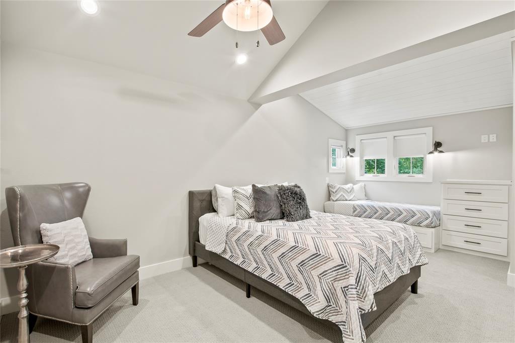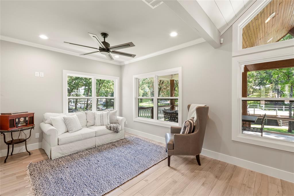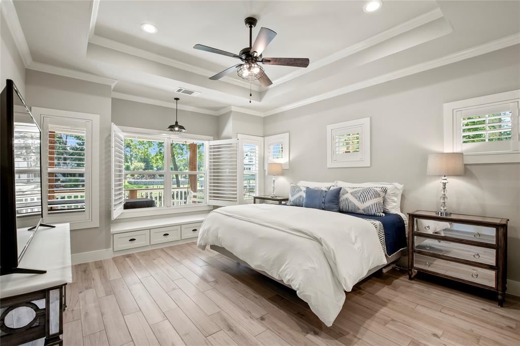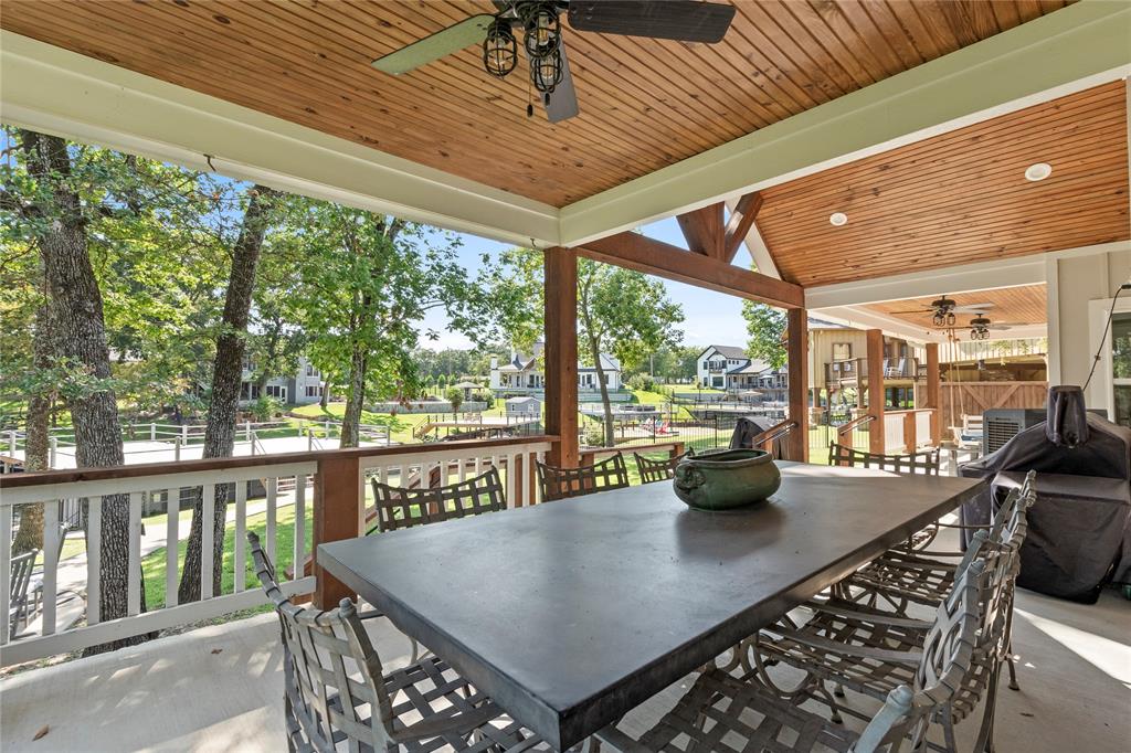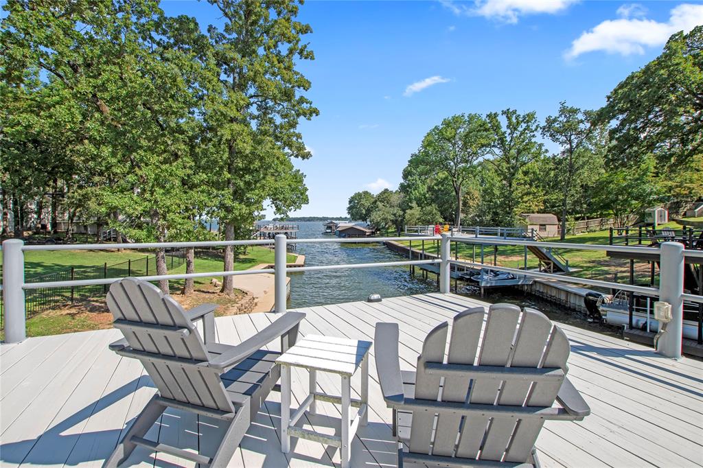 Experience lakeside luxury in this private gated estate, perfectly situated on two fenced lots totaling over three-quarters of an acre with approximately 200 feet of serene shoreline. This 5-bedroom, 3 full bath, 2 half bath Contemporary Craftsman-style home offers 3,063 square feet of refined living space, showcasing a Hardiboard exterior with cedar accents and standout curb appeal. Inside, the main level features three bedrooms—one currently serving as an office with a closet and half bath—alongside two full baths. The spacious living area boasts vaulted shiplap ceilings, crown molding, and a striking stone fireplace, complemented by a cozy reading nook and a charming built-in dining hutch. The chef’s kitchen is a dream, complete with a large island with seating, quartz countertops, farmhouse sink, stainless steel appliances, and abundant cabinetry. The waterside primary suite features plantation shutters, a walk-in tile shower, soaking tub, dual vanities, and an oversized walk-in closet. Throughout the main floor, wood-look tile flooring adds warmth and durability. Upstairs, the versatile “family bunkhouse” includes a large bonus room with three built-in twin beds, an additional bedroom with a built-in bed, and ample space for more guests, supported by a full and half bath. Outdoor living is exceptional, with a covered patio featuring a wood ceiling, a composite deck, multiple patios for dining and relaxation—including one with a firepit—and a boathouse on a protected cove with automatic lifts, covers, and a party deck offering views down the cove to open water., Wrought iron fencing with an electric gate, an oversized 2-car garage, extended driveway, and a lake pump-fed sprinkler system complete the property. The second lot provides ample space for a future garage, pool, or pickleball court, or simply more room to enjoy the tranquil lakeside setting. Furnishings and watercraft are available separately.