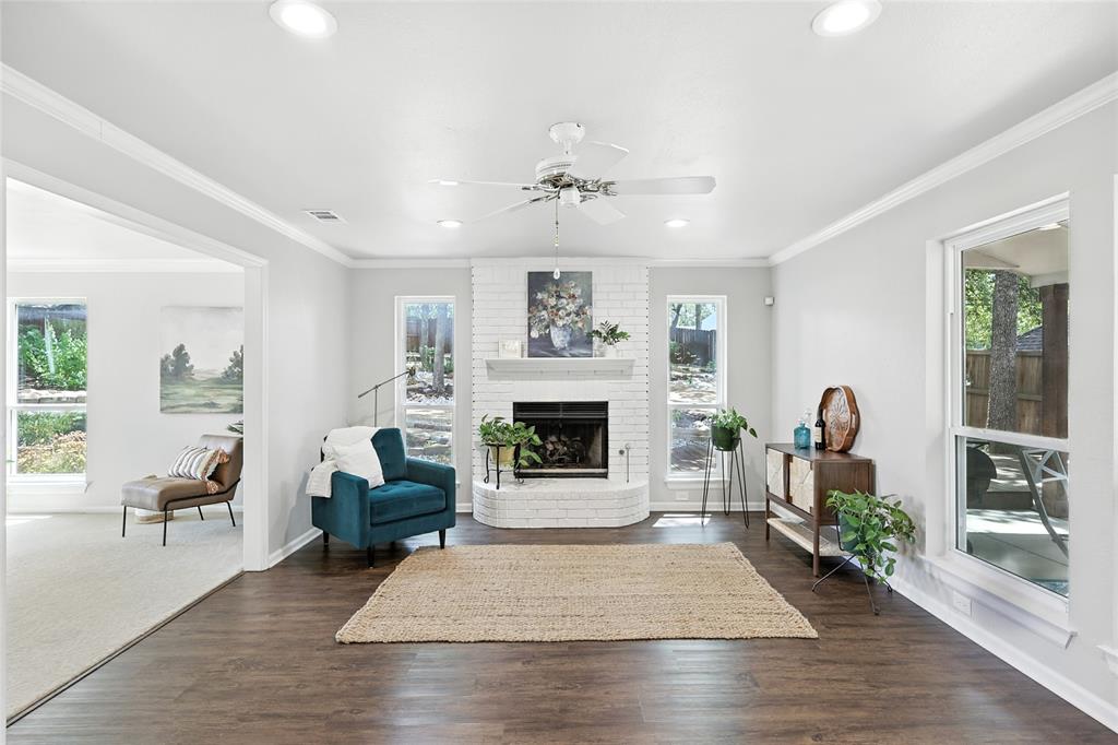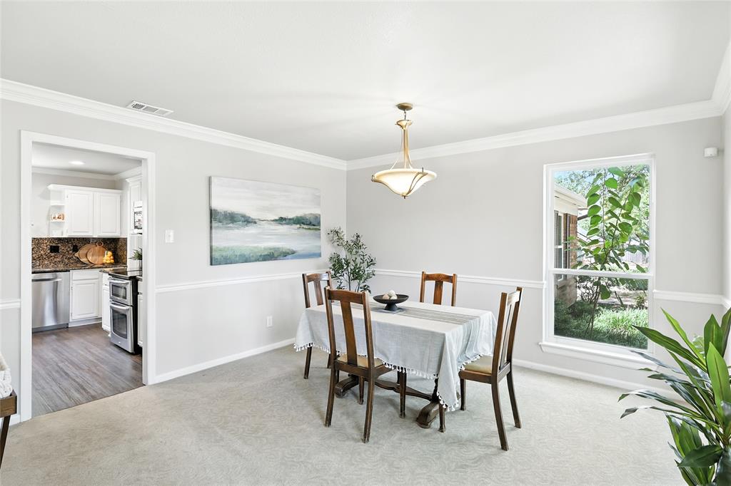 Inside, the flexible floor plan features two living areas and two dining spaces, ideal for both everyday living and entertaining. The inviting family room centers around a cozy fireplace, with abundant natural light streaming in through updated windows. The kitchen boasts plenty of counter space, white cabinetry, granite counters, and an open view into the backyard. Freshly painted with just cleaned floors throughout! Upstairs, the spacious primary suite is a true retreat with an en suite bath, complemented by four additional bedrooms, providing room for everyone. Recent updates include garage door and opener, exterior paint, privacy fence and deck, and fountain and landscaping in front and backyard! Outdoor living shines here—enjoy a covered patio with extended decking, shaded by mature oaks, plus an extended driveway for ample parking. The backyard offers a mix of low-maintenance landscaping, garden beds, and peaceful sitting areas. All of this in a convenient location close to shopping, schools, and parks, while still tucked into a quiet, tree-lined culdesac.