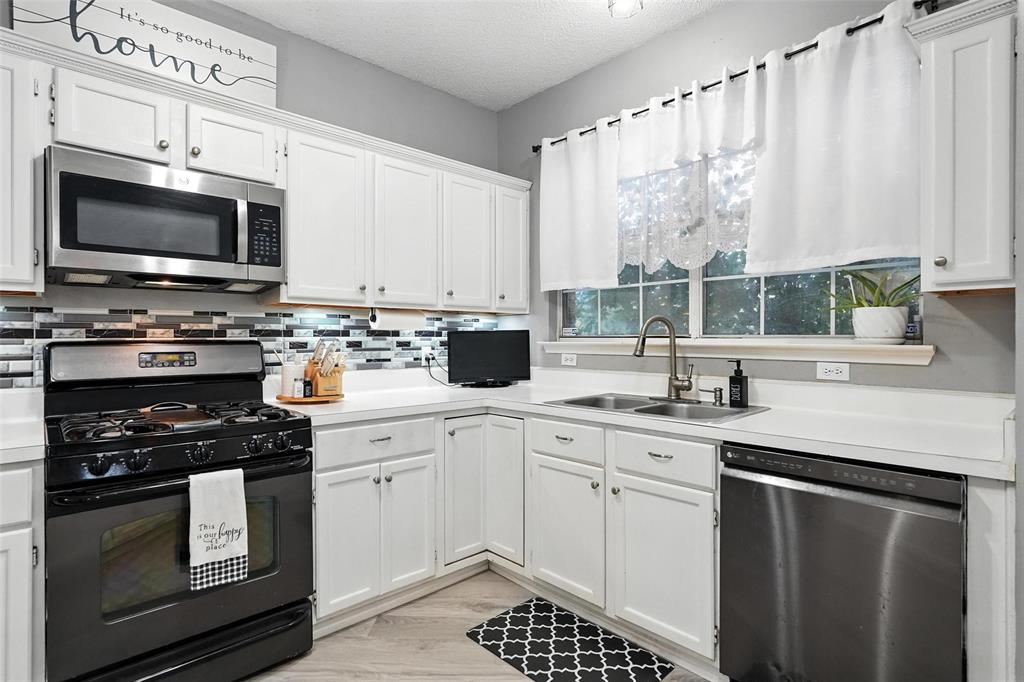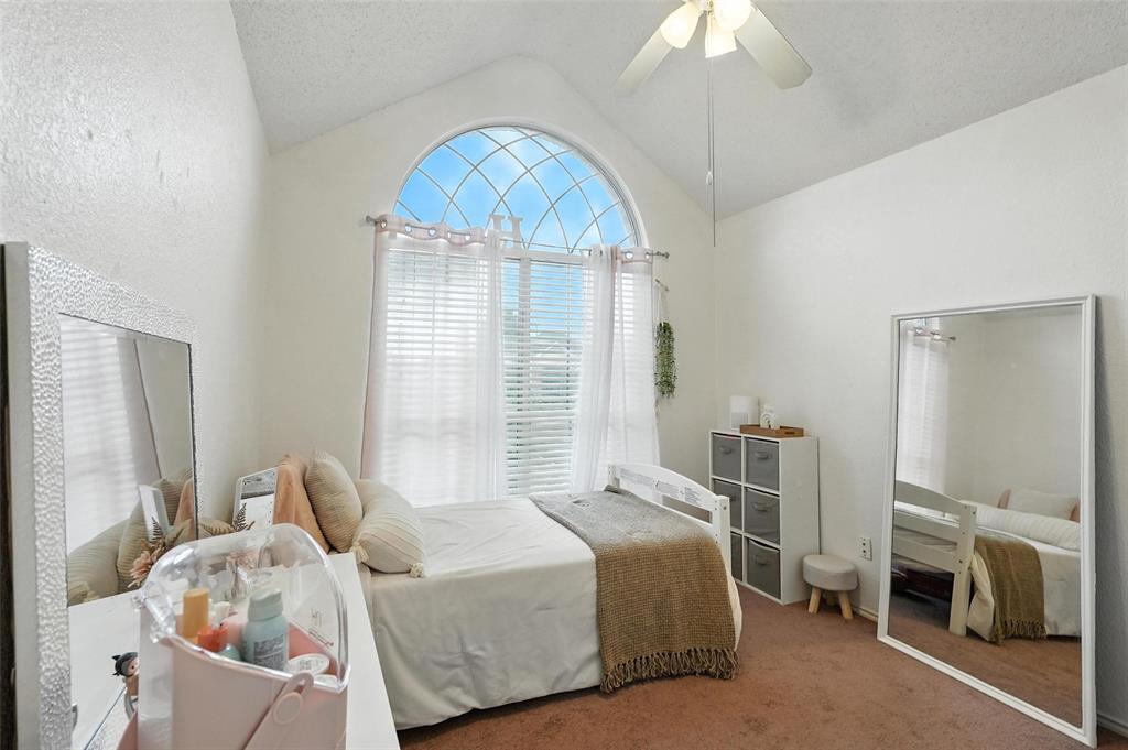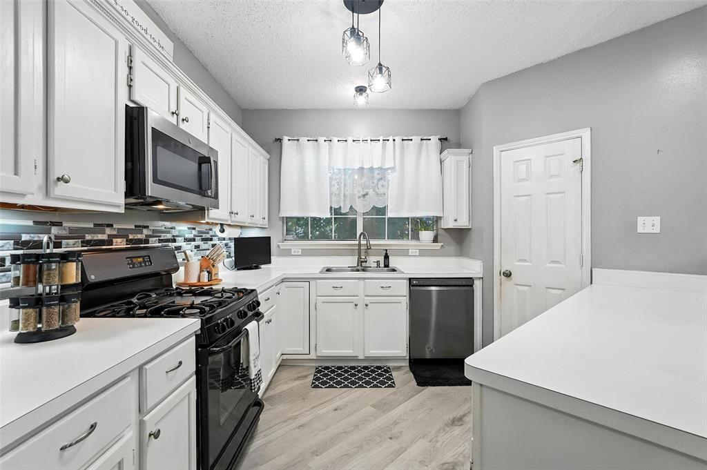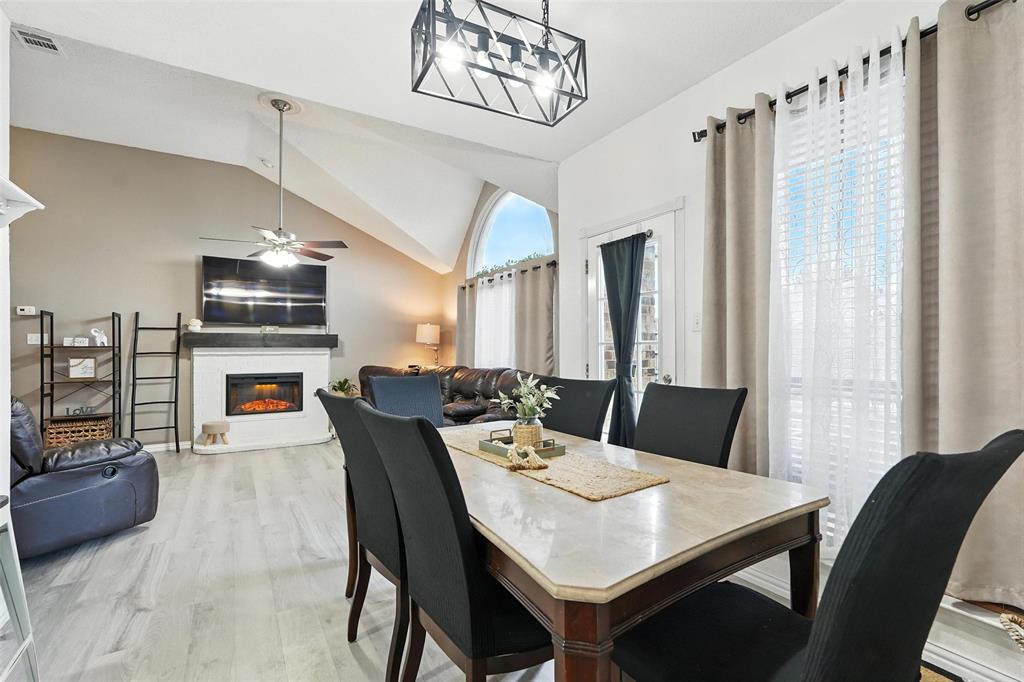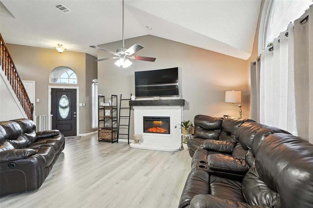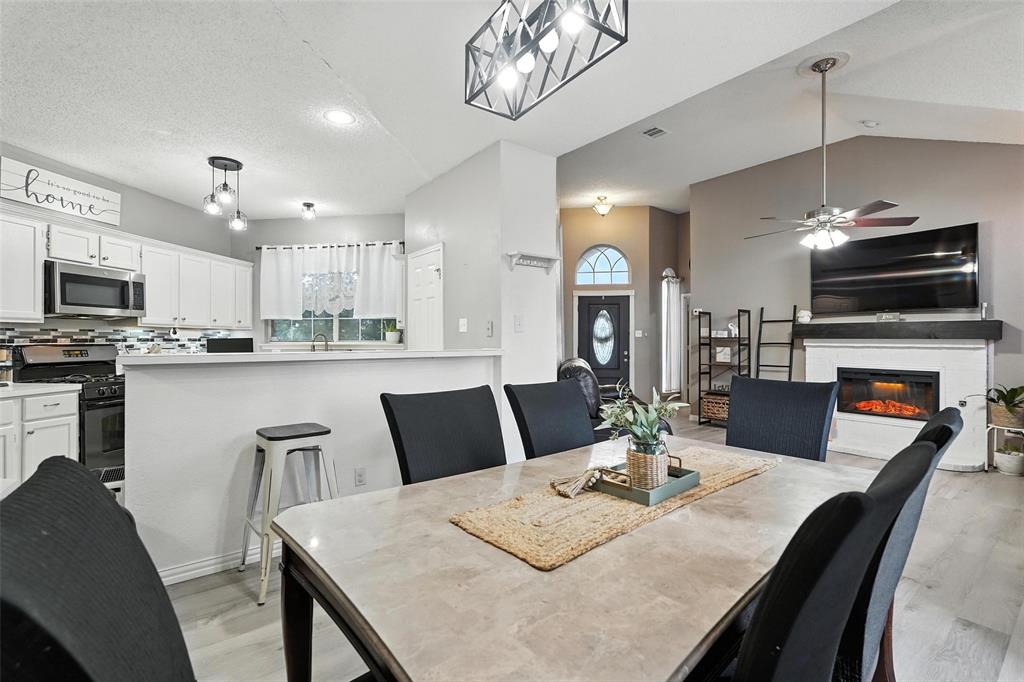 Welcome to this charming two-story home in the desirable Creek Crossing Estates community of Mesquite. Featuring 4 spacious bedrooms, 2.5 baths, and a 2-car garage, offering both comfort and functionality. The bright and open living area boasts vaulted ceilings, a cozy fireplace, and large arched windows that allow for abundant natural light. The updated kitchen includes white cabinetry, a tile backsplash, stainless-steel appliances, and a breakfast bar that opens to the dining area. The private primary suite offers soaring ceilings, a beautifully remodeled bath with dual vanities, and a walk-in shower. Additional bedrooms provide plenty of space for family, guests, or a home office. Enjoy outdoor living in the fenced backyard with a patio, perfect for entertaining, relaxing, or weekend gatherings. Conveniently located near local parks, schools, shopping, and dining. Come take a look today!