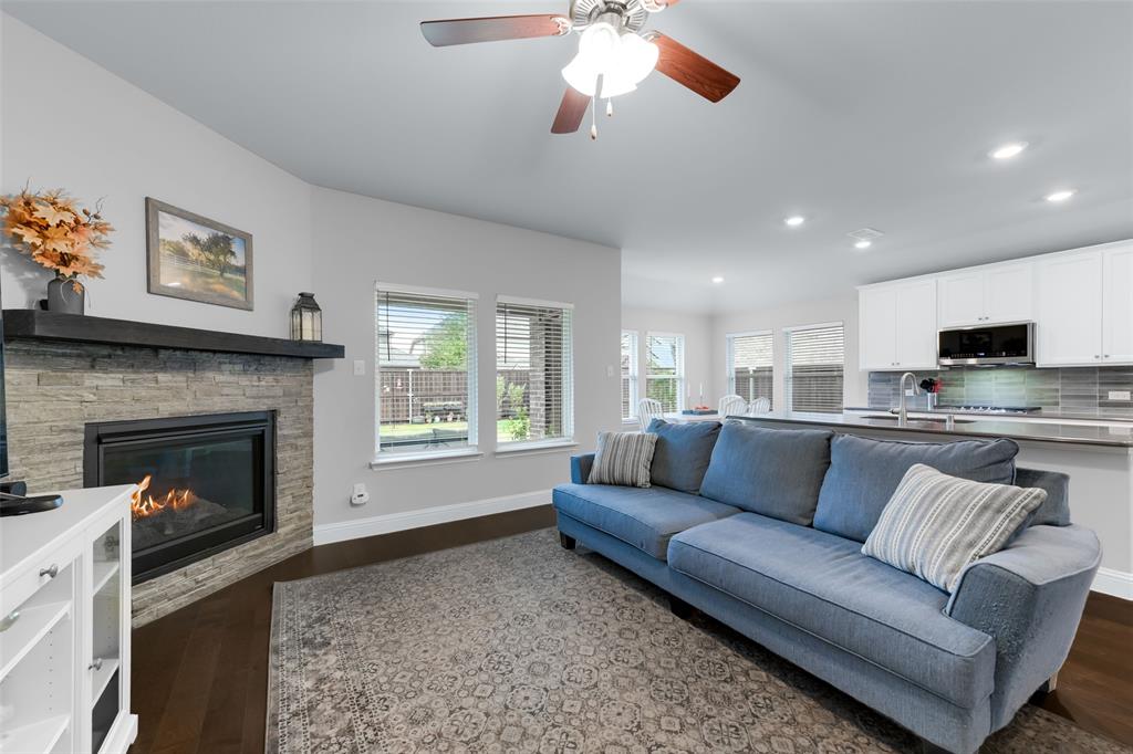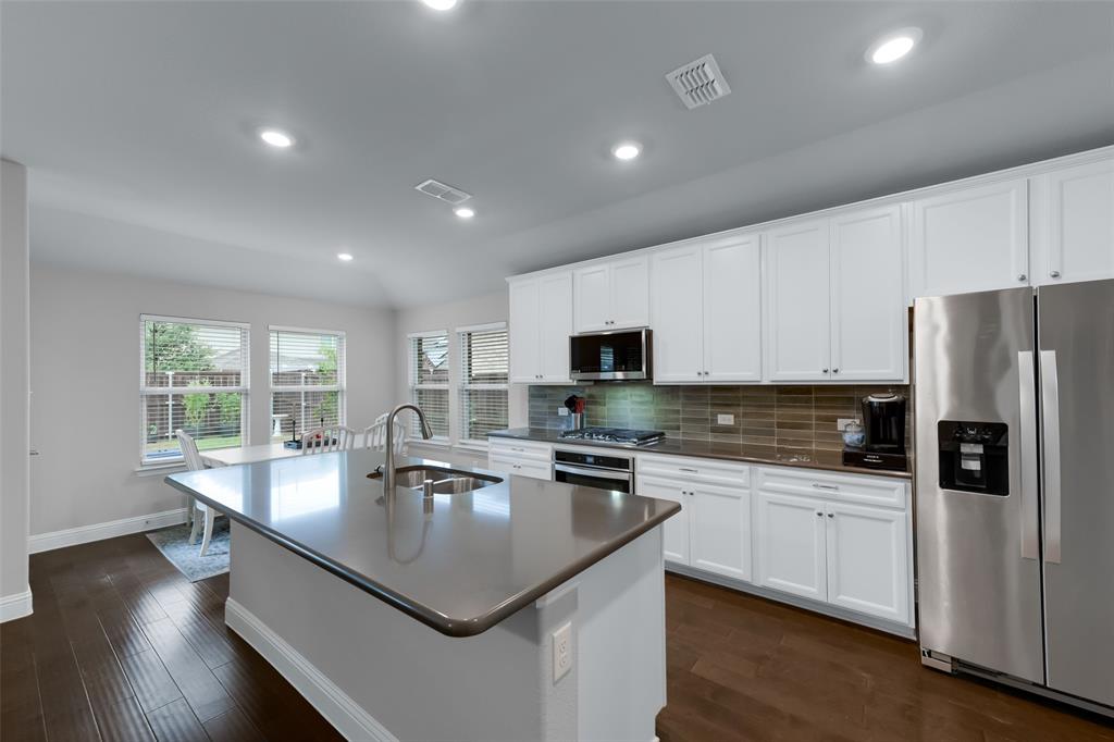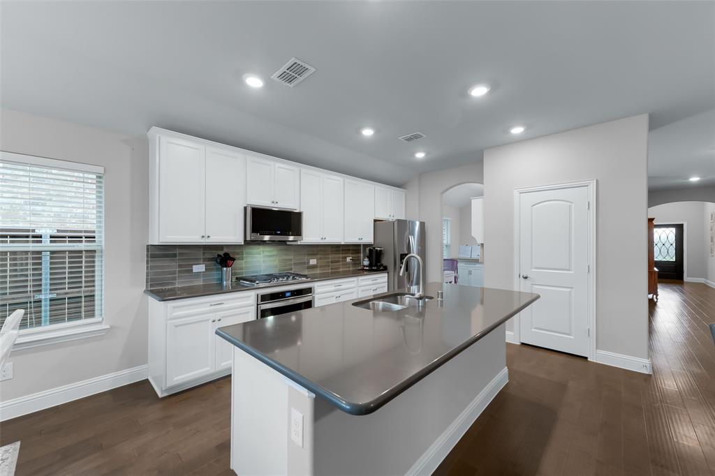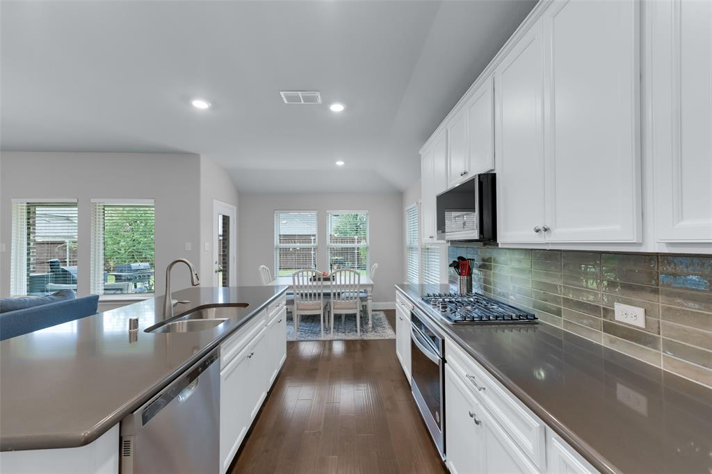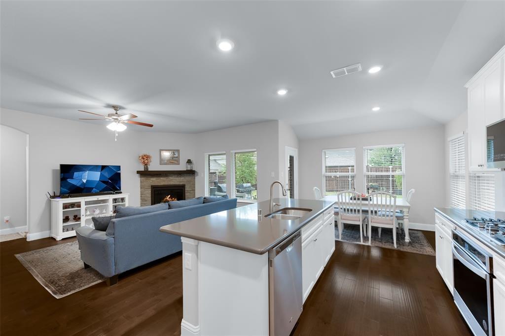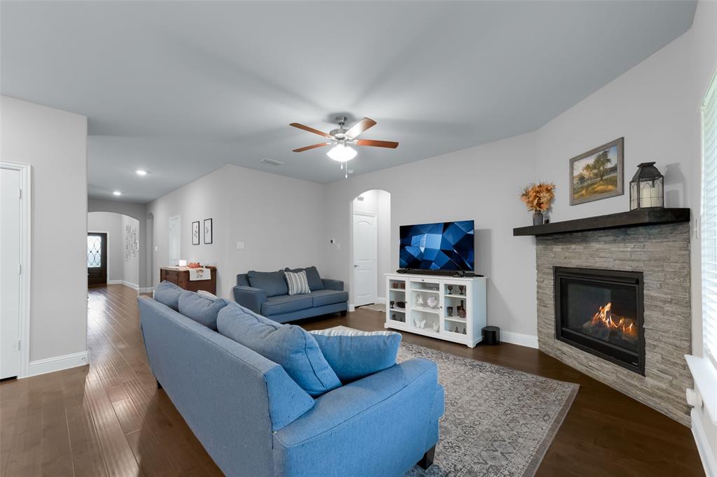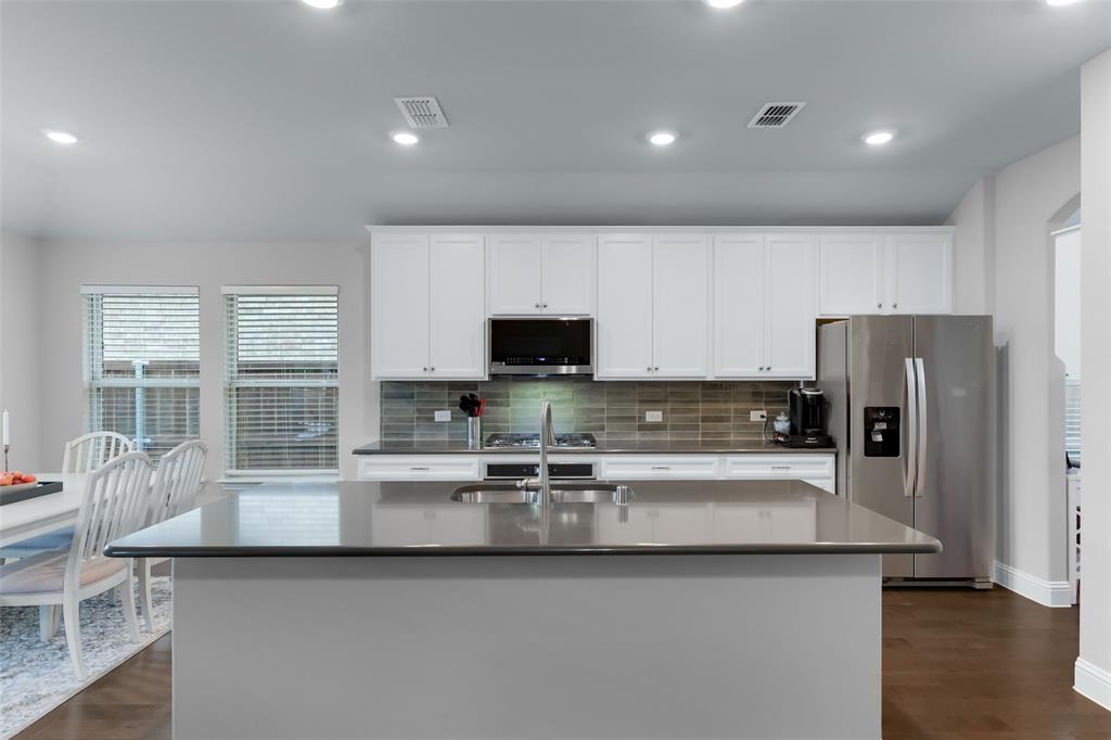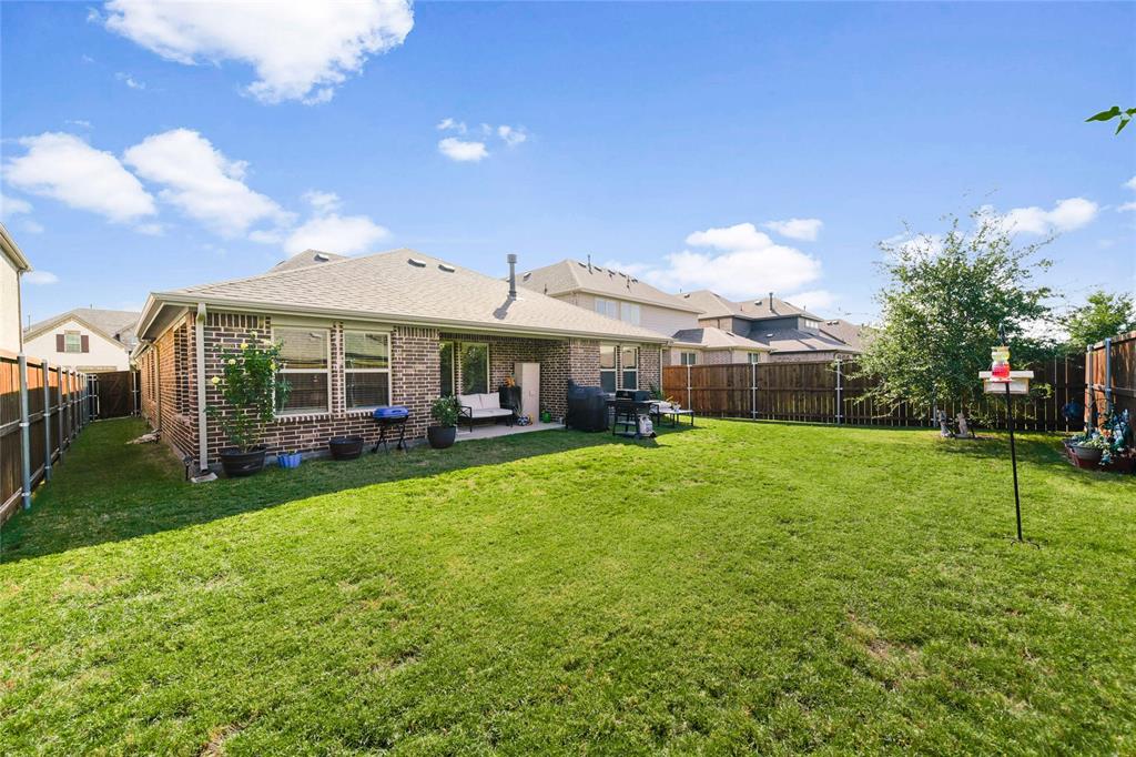 SELLER OFFERING $5,000 IN CONCESSIONS, WHICH IS A GREAT DEAL ON THE LOWEST PRICED HOME IN THE NEIGHBORHOOD! Welcome to this beautiful single story home featuring 4 bedrooms, 2.5 baths, plus a versatile flex space perfect for a dining room, playroom, or second living area. The exterior showcases charming brick and stone accents with a landscaped flower bed for great curb appeal. From the moment you enter, you’ll be greeted by tall ceilings and an open entry hallway that flows into a light filled layout with abundant windows and natural light. The chef’s kitchen is designed to impress with crisp white cabinets, a large island, quartz countertops, and a gas cooktop. The spacious primary suite offers a true retreat with a luxurious bathroom complete with double sinks, a garden tub, a separate shower, and large walk in closet. The split bedroom design includes generous sized bedrooms, ample storage space, a spa like secondary bathroom, plus a powder bath for guests. The spacious backyard provides plenty of room to play or garden. Located in the desirable Wellington community that features a resort style pool, parks, a playground, and miles of scenic walking trails. Within walking distance to highly rated Northwest ISD schools! This location is perfect for commuting, close to Hwy 287 and 35W. A short drive from Presidio Towne Crossing and Alliance Town Center which offer a plethora of restaurants, shopping, entertainment, and nightlife! Don't miss out an opportunity for a great home in a wonderful community at an unbeatable price!