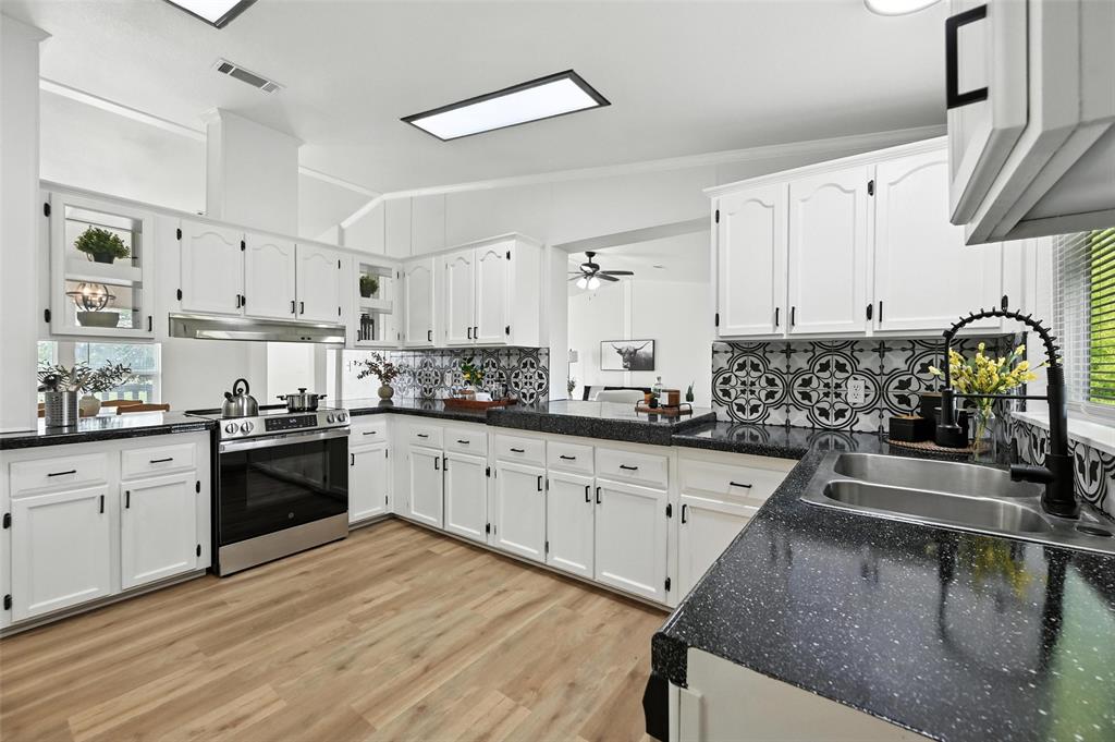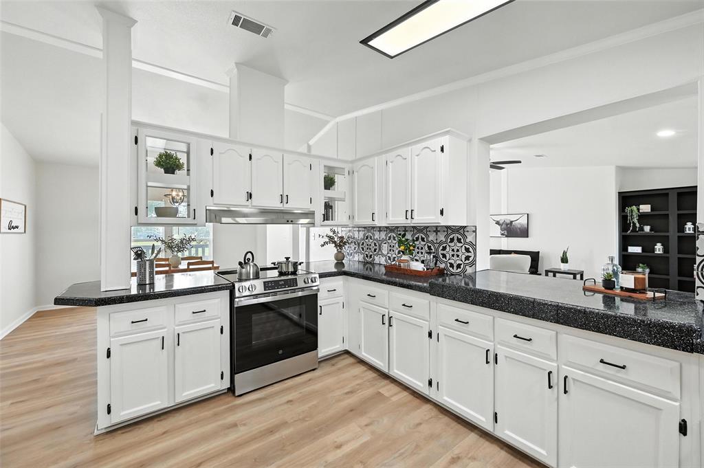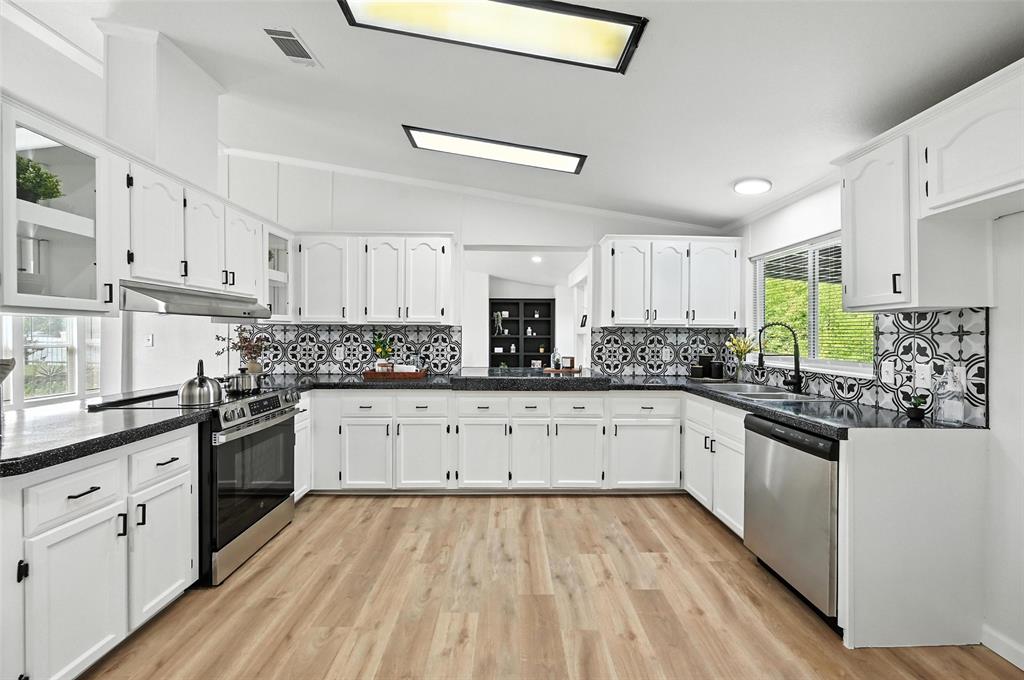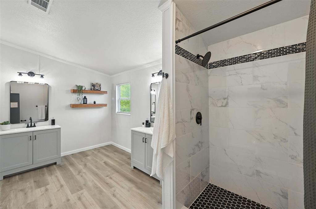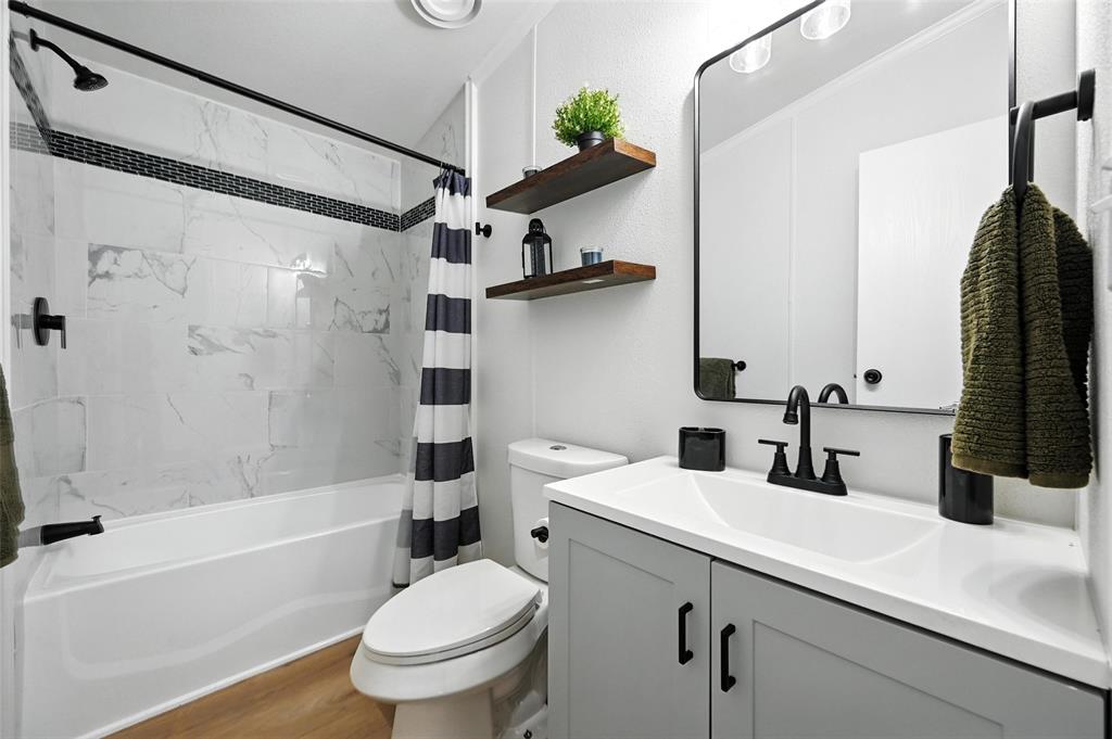 The kitchen showcases resurfaced countertops, a stylish new backsplash, and upgraded cabinet hardware, making it as functional as it is beautiful. The bathrooms are equally impressive, with the master bath featuring a brand-new tile shower, two new vanities, floating shelves, mirrors, and new toilets. The hall bath includes a resurfaced tub, new tile surround, updated vanity, and modern hardware.
