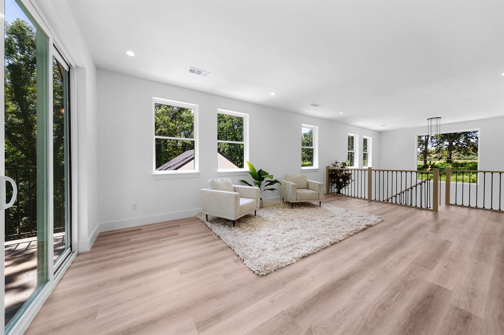 The open-concept floor plan is filled with natural light from large windows and features high ceilings, hardwood floors, and elegant finishes throughout. The main level includes a spacious primary suite with a spa-like ensuite bathroom, along with a second bedroom with its own private bath. Upstairs, you’ll find two additional bedrooms, a full bath, and a versatile loft-style living area that opens to a balcony overlooking the scenic outdoors ideal for a game room, family room, or home office.