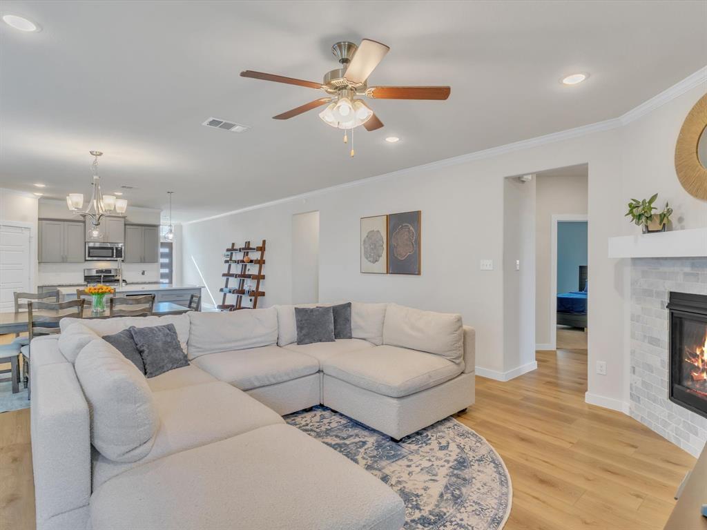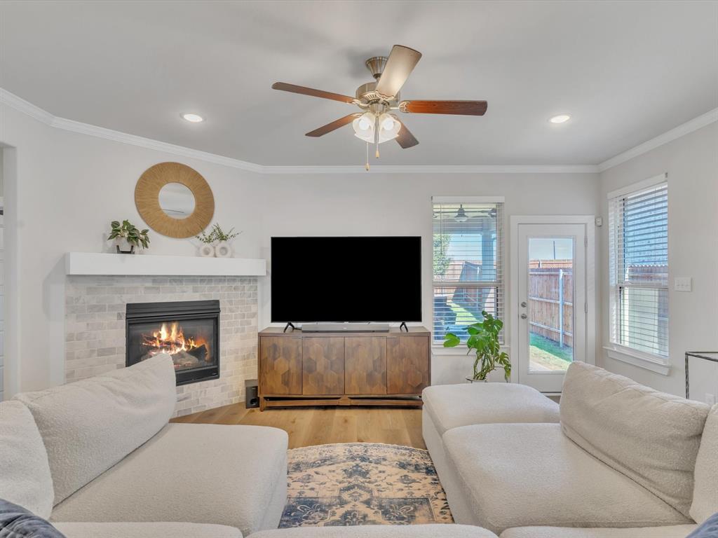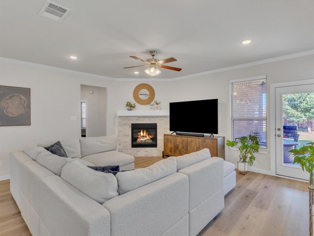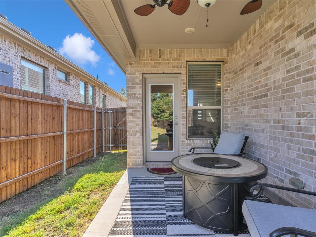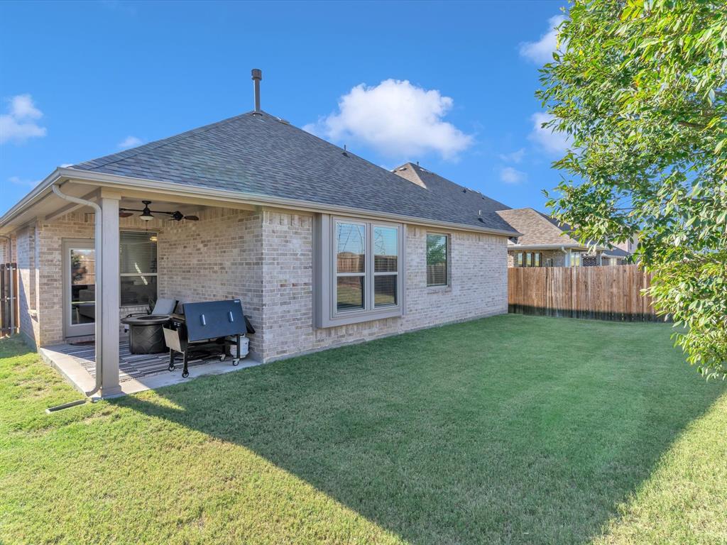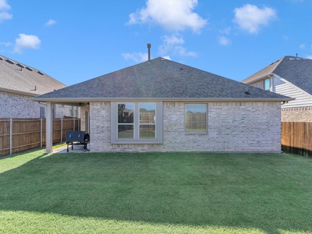 Welcome to this beautifully maintained SINGLE LEVEL 4-bedroom, 2-bathroom home in the highly desirable Seventeen Lakes community, zoned for Northwest ISD. With light, neutral colors and wide-plank flooring in the main living areas, this home is designed to feel bright and inviting from the moment you walk in. A private front office with custom built-ins offers the perfect space to work from home. The open-concept layout allows families to stay connected, with the kitchen, dining, and living areas flowing together seamlessly. The kitchen is equipped with painted cabinets, granite perimeter counters, stainless steel appliances, a gas range w-double oven, and an oversized quartz-topped island with a built-in wine fridge—ideal for casual meals, hosting, or after-school snacks. The living room features a decorative gas log fireplace, creating a cozy gathering spot. The split bedroom design gives everyone their own space, while the spacious primary suite offers dual sinks, a garden tub, separate shower, and walk-in closet. Step outside to the covered patio and low-maintenance backyard, perfect for playtime or relaxing weekends at home with no neighbors behind you. Seventeen Lakes offers an abundance of amenities designed for families to enjoy. Residents can take advantage of multiple community pools, playgrounds, fishing lakes, and scenic walking trails. With neighborhood events and plenty of outdoor spaces, this community fosters a true sense of connection and fun. Conveniently located just minutes from schools, parks, and the dining and entertainment options in Downtown Roanoke, this home combines comfort, convenience, and community living.