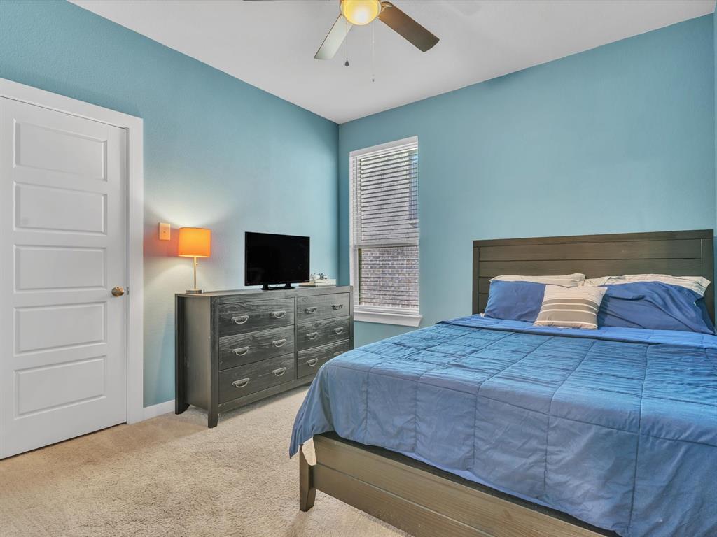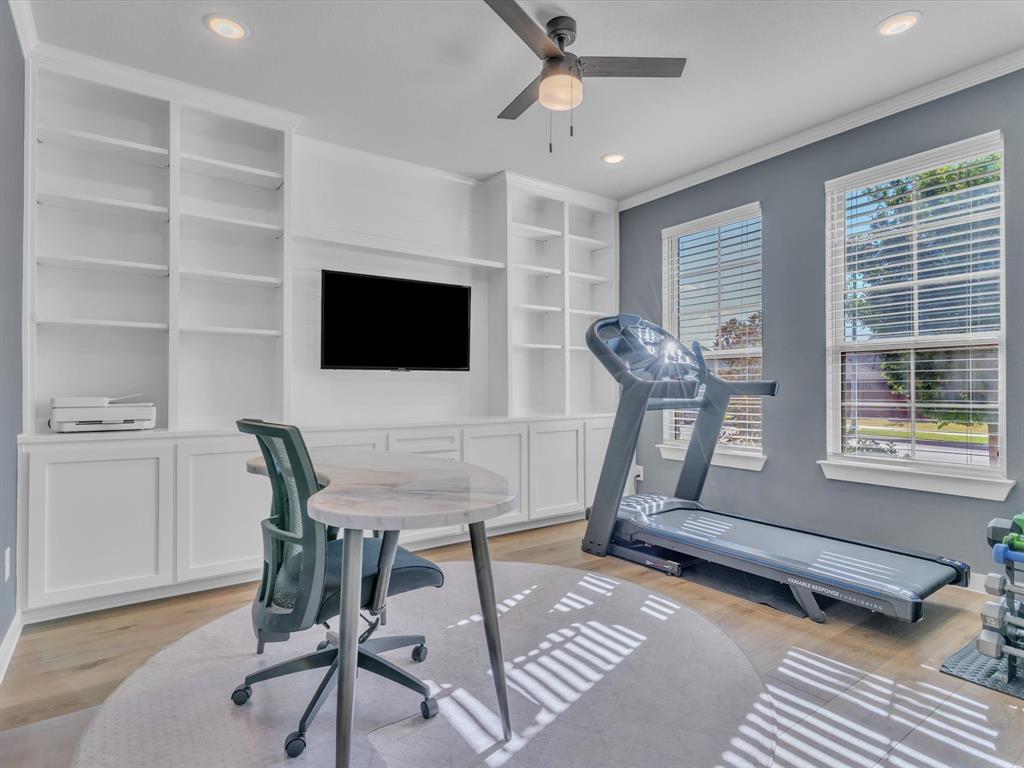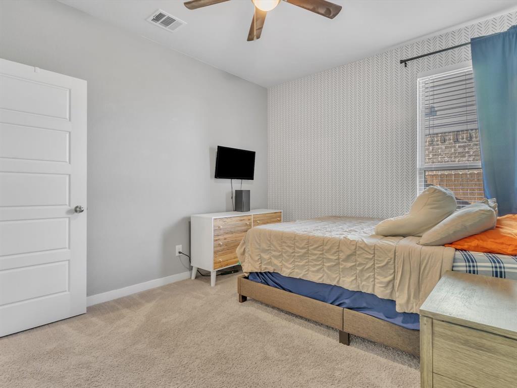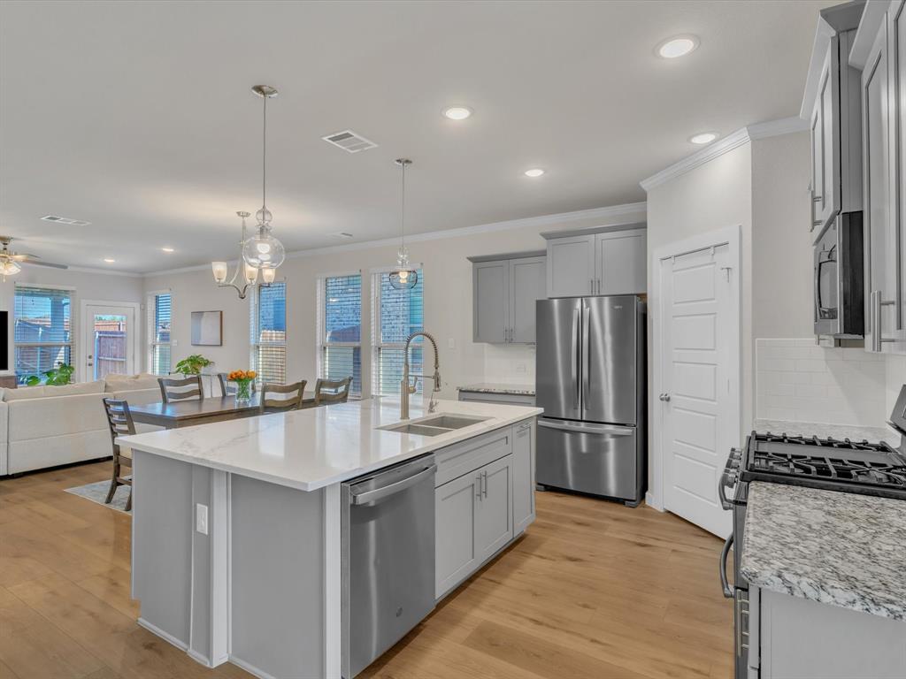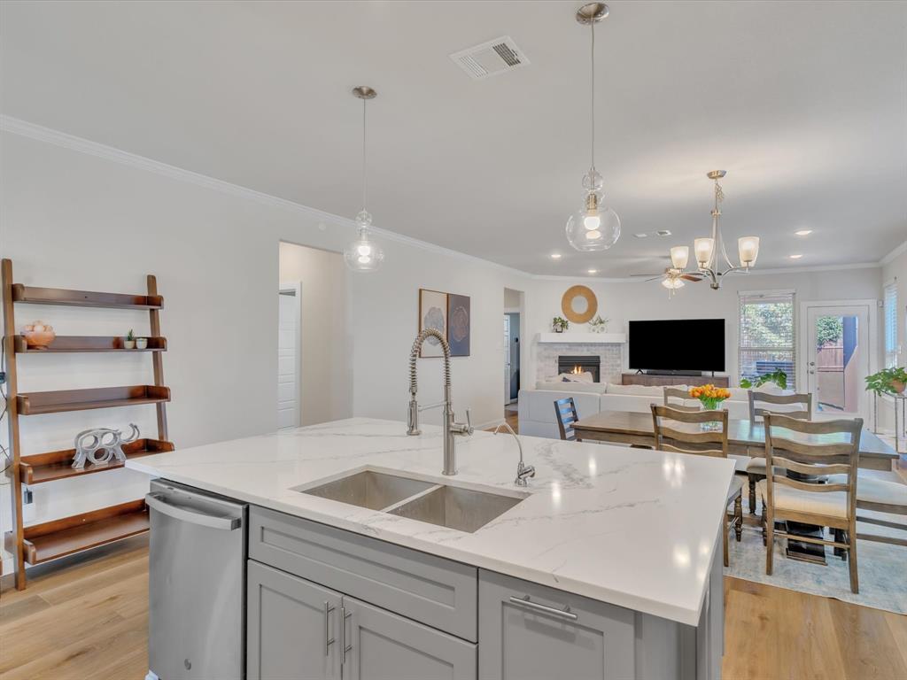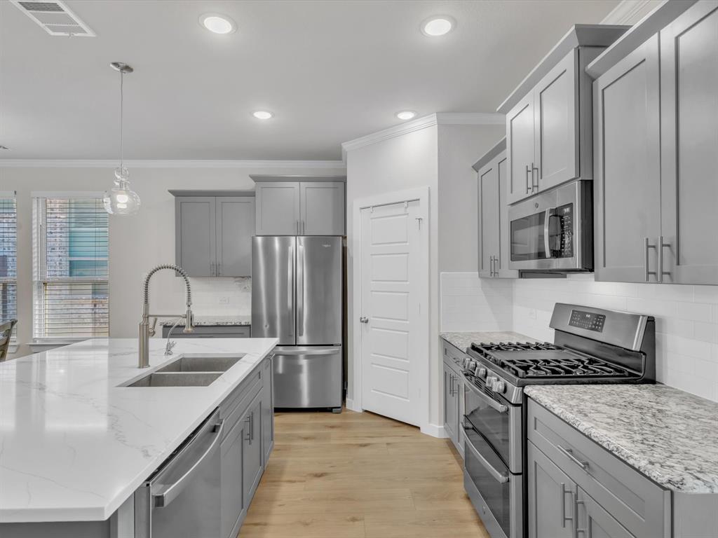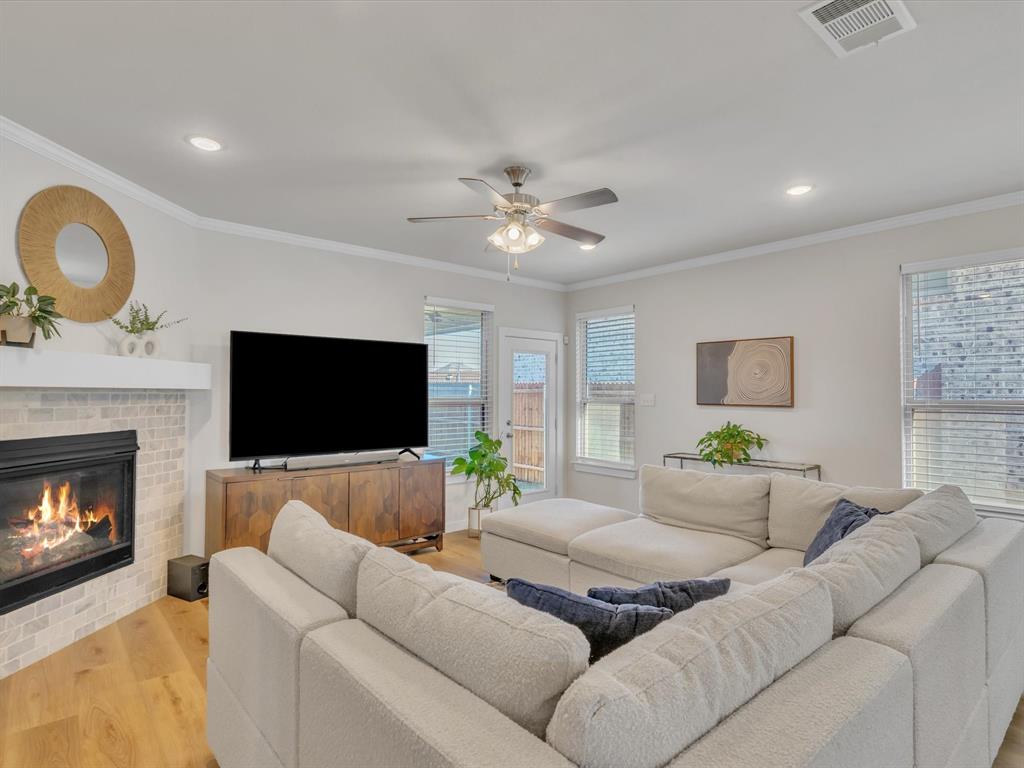 Welcome to this beautifully maintained SINGLE LEVEL 4-bedroom, 2-bathroom home in the highly desirable Seventeen Lakes community, zoned for Northwest ISD. With light, neutral colors and wide-plank flooring in the main living areas, this home is designed to feel bright and inviting from the moment you walk in. A private front office with custom built-ins offers the perfect space to work from home. The open-concept layout allows families to stay connected, with the kitchen, dining, and living areas flowing together seamlessly. The kitchen is equipped with painted cabinets, granite perimeter counters, stainless steel appliances, a gas range w-double oven, and an oversized quartz-topped island with a built-in wine fridge—ideal for casual meals, hosting, or after-school snacks. The living room features a decorative gas log fireplace, creating a cozy gathering spot. The split bedroom design gives everyone their own space, while the spacious primary suite offers dual sinks, a garden tub, separate shower, and walk-in closet. Step outside to the covered patio and low-maintenance backyard, perfect for playtime or relaxing weekends at home with no neighbors behind you. Seventeen Lakes offers an abundance of amenities designed for families to enjoy. Residents can take advantage of multiple community pools, playgrounds, fishing lakes, and scenic walking trails. With neighborhood events and plenty of outdoor spaces, this community fosters a true sense of connection and fun. Conveniently located just minutes from schools, parks, and the dining and entertainment options in Downtown Roanoke, this home combines comfort, convenience, and community living.