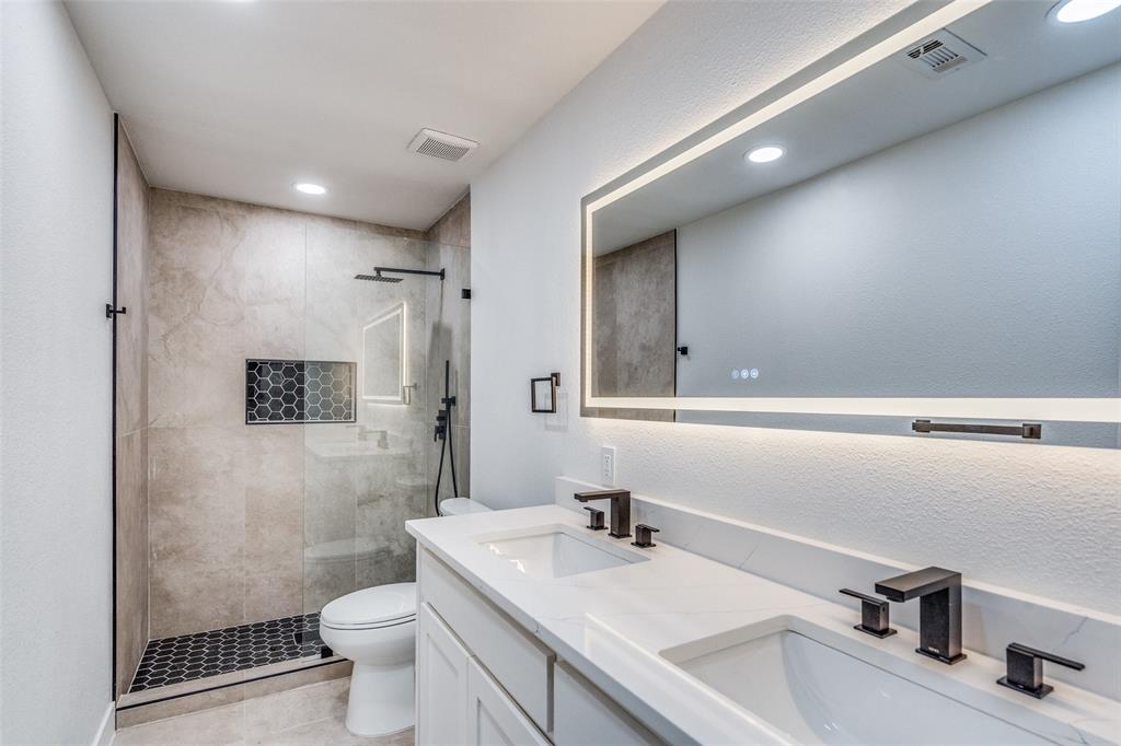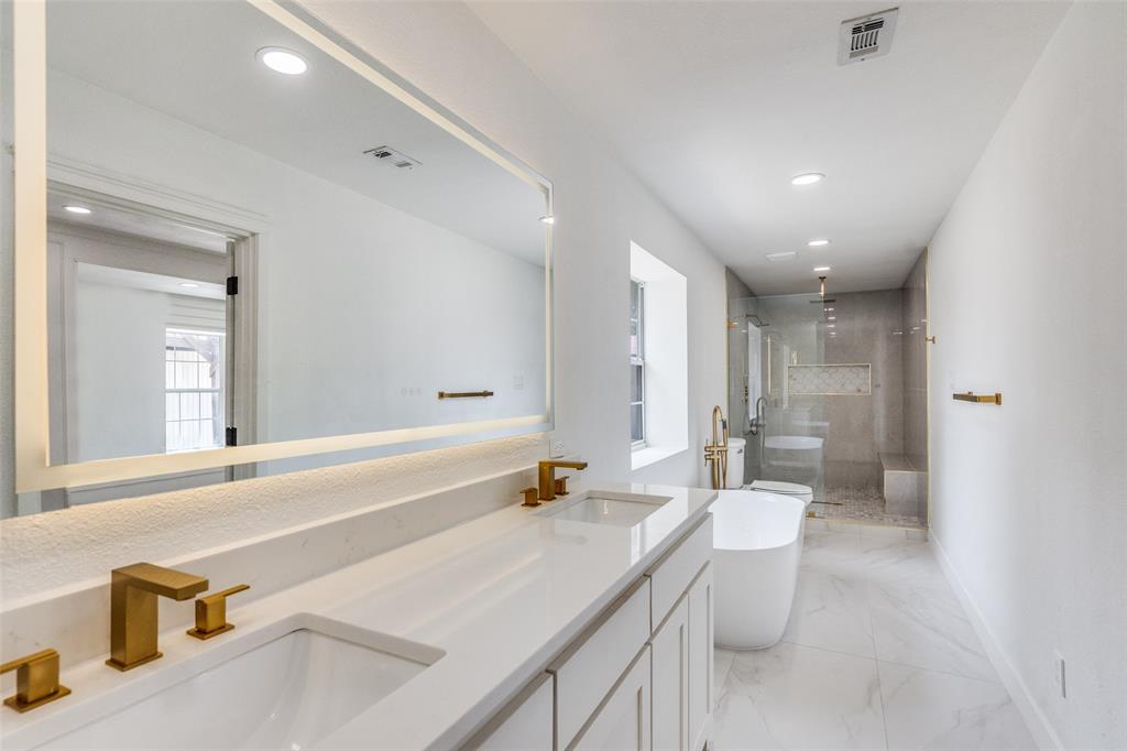 The luxurious master suite has been transformed into a private retreat, complete with up-to-date flooring, spa-inspired bathroom with elegant tiles, an upgraded bathtub, and gold-accented fixtures that create a touch of glamour. The shared bathroom is equally impressive with up-to-date tilework, smart mirrors, and modern finishes.