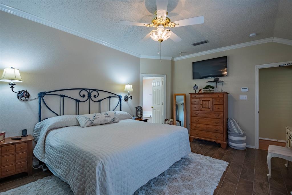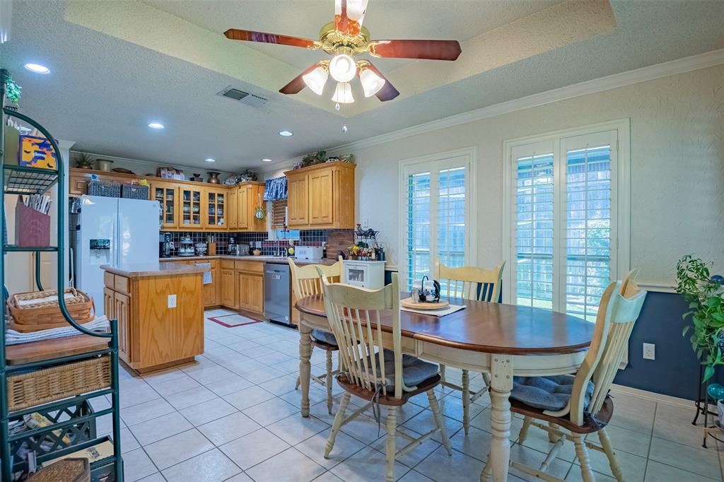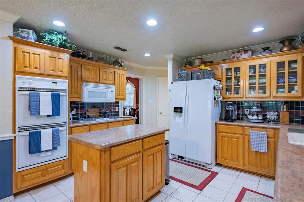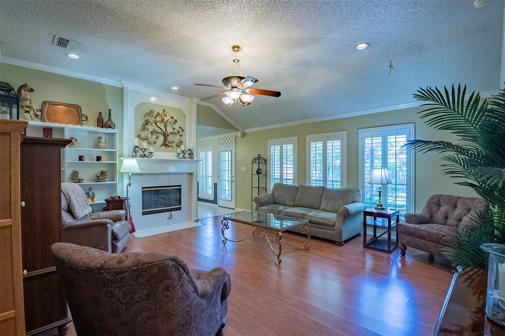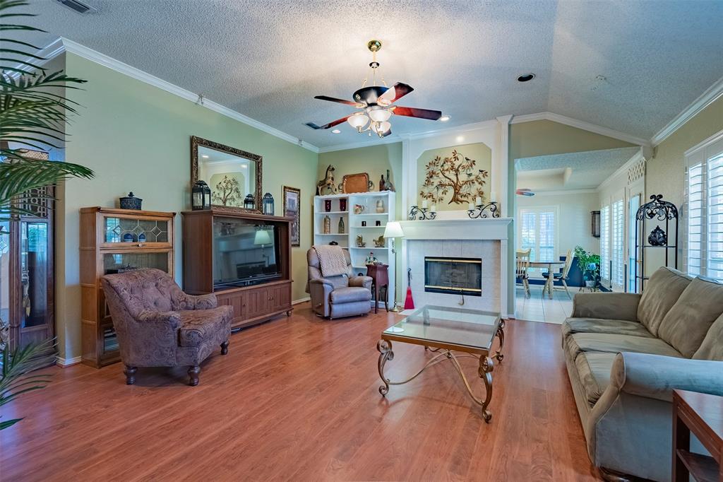The spacious kitchen features a 5-burner gas cooktop, double ovens, and a sunny breakfast area. The large living room is perfect for gathering, complete with recessed lighting, a gas fireplace, surround sound wiring, and elegant crown molding. The split-bedroom floor plan offers privacy and space, with a generously sized primary suite and comfortable secondary bedrooms.