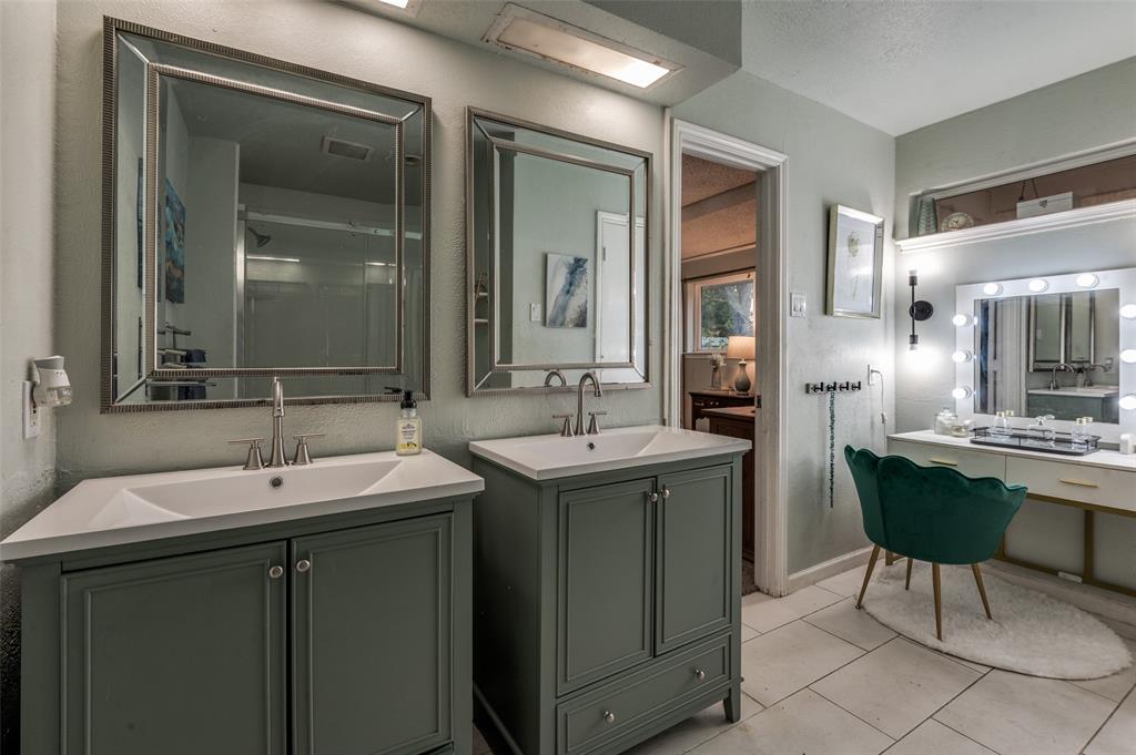 Luxury vinyl plank flooring flows through the main living spaces, leading to three generously sized bedrooms. The primary suite is a peaceful retreat with private backyard access, dual closets, and a remodeled ensuite bathroom featuring a walk-in shower and double vanities.