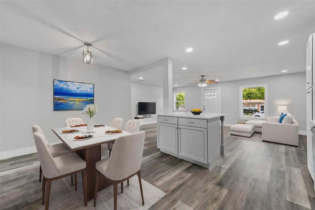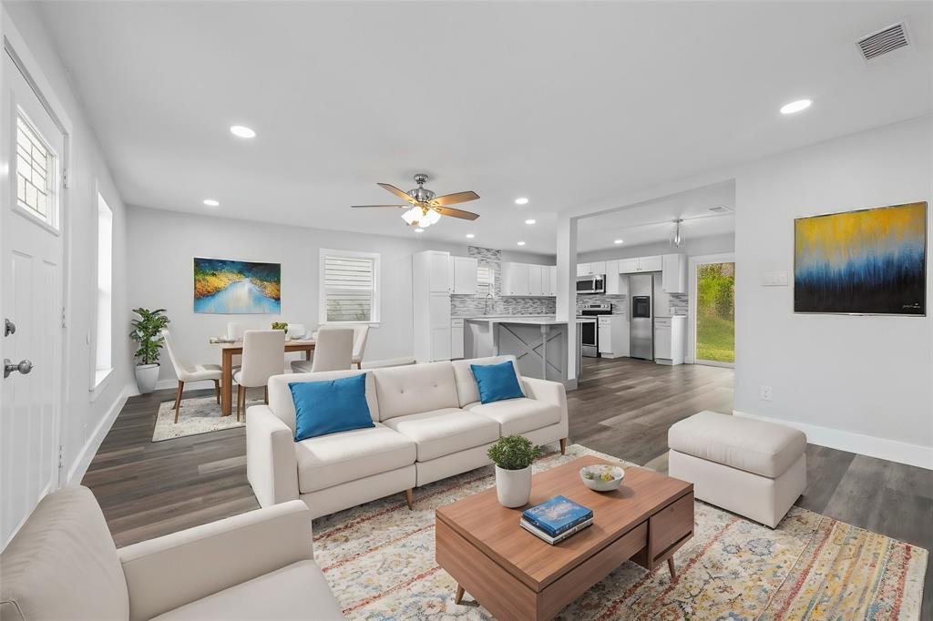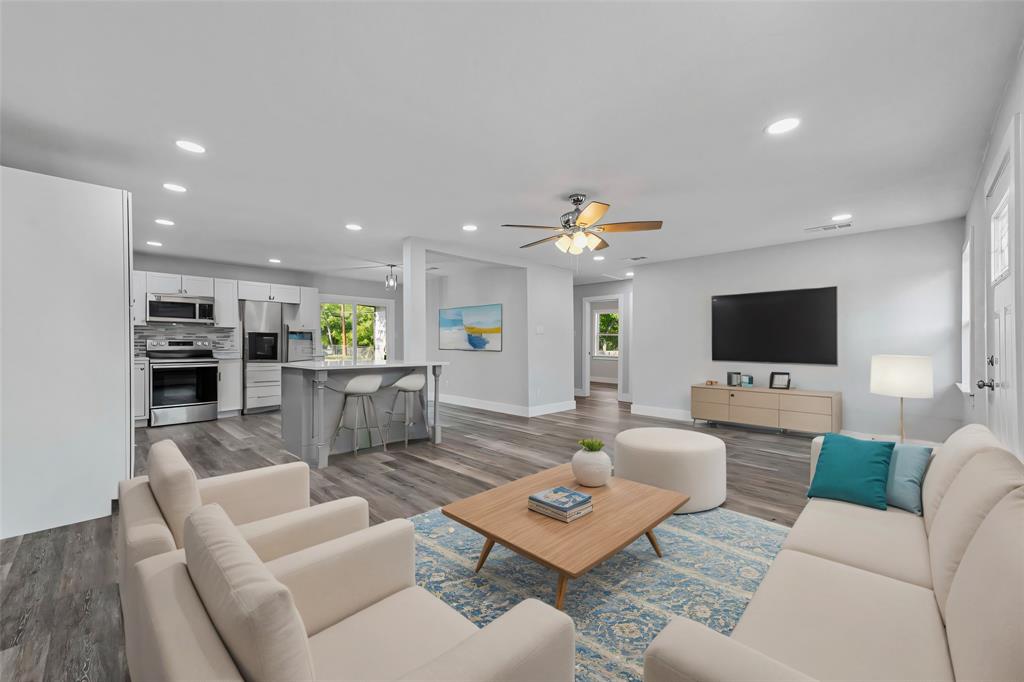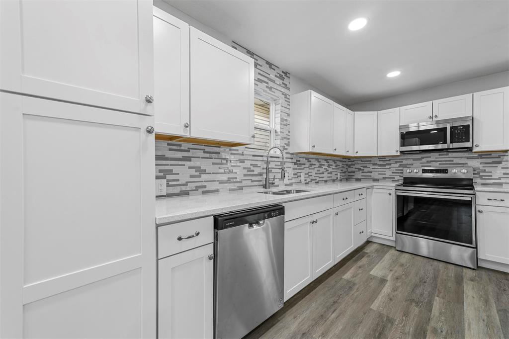 This beautifully remodeled 2024 home exudes elegance with its soft grey walls, accented by white ceilings and trim. Luxury vinyl plank flooring runs throughout, offering a warm, cohesive feel. The kitchen stands out, featuring new shaker cabinets, pristine white quartz countertops, a stylish designer backsplash, and all-new stainless steel appliances.