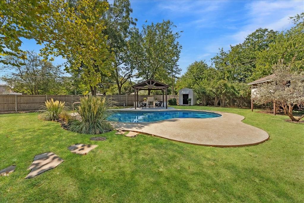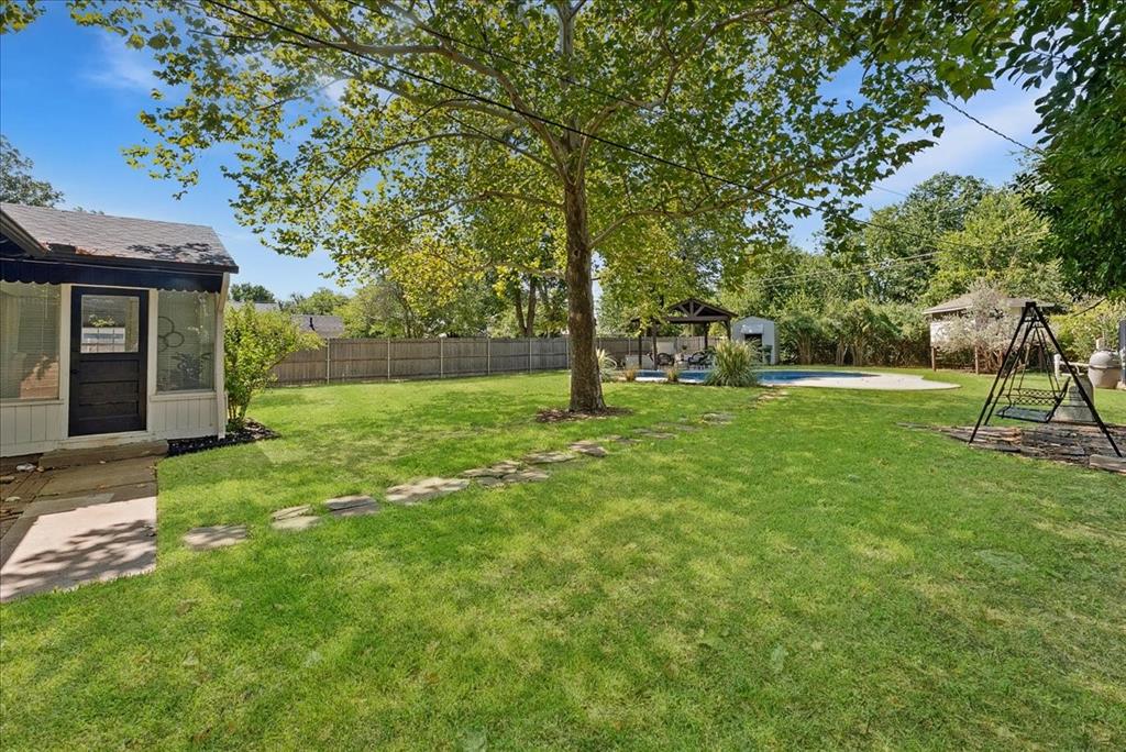 The backyard is where lifestyle truly takes center stage—dive into your sparkling pool, host gatherings under the covered patio, or enjoy the playhouse and storage space, all shaded by mature trees creating a private oasis.