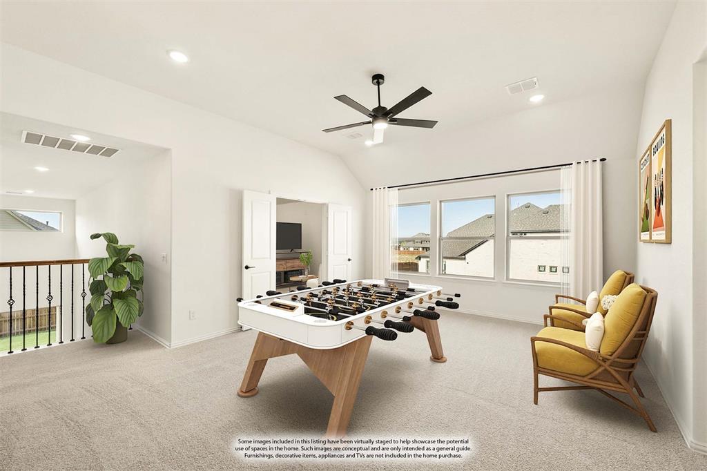 NEW! NEVER LIVED IN! Available NOW. The Rose II by Bloomfield Homes is a showcase of thoughtful design, refined finishes, and family-friendly functionality, offering 5 bedrooms, 4 baths, and a 3-car garage all wrapped in a timeless stone-and-brick exterior with buff mortar for added character. Step inside through the 8’ glass front door and be welcomed by a dramatic two-story foyer that flows into a soaring Family Room filled with natural light from oversized windows. Anchoring the space is a stone-to-ceiling fireplace with a cedar mantel, creating a warm yet striking centerpiece. The Deluxe Kitchen elevates everyday living with pure white cabinets, quartz countertops, upgraded backsplash, 5-burner gas cooktop, built-in stainless steel appliances, and under-mount lighting, all tied together by a spacious island with trash pullout storage. A drop-in deck mount tub in the Primary Suite offers spa-like relaxation, paired with a glass-enclosed shower, dual vanities, and a walk-in closet that seamlessly connects to the laundry room. Smart upgrades like laminate wood flooring across main traffic areas, glass French doors at the Study, added electrical outlets, 12 LED disk lights, Smurf tubing for future tech upgrades, and 2 prewired Media speakers make this home as functional as it is stylish. Upstairs, the open Game Room overlooks the Family Room below with rod iron railing detail, while the enclosed Media Room sets the stage for movie nights. Secondary bedrooms include thoughtful touches like a Jack-and-Jill bath, upgraded shower tile, and spacious walk-in closets. Outdoor living shines with an extended back patio featuring additional concrete, a ceiling fan, and a gas stub for grilling, plus a fully landscaped yard with a sprinkler system. Finished with cedar garage doors, gutters, and upgraded brickwork, this Rose II blends elegance, practicality, and curb appeal seamlessly—ready to welcome you home at Wildflower Ranch.