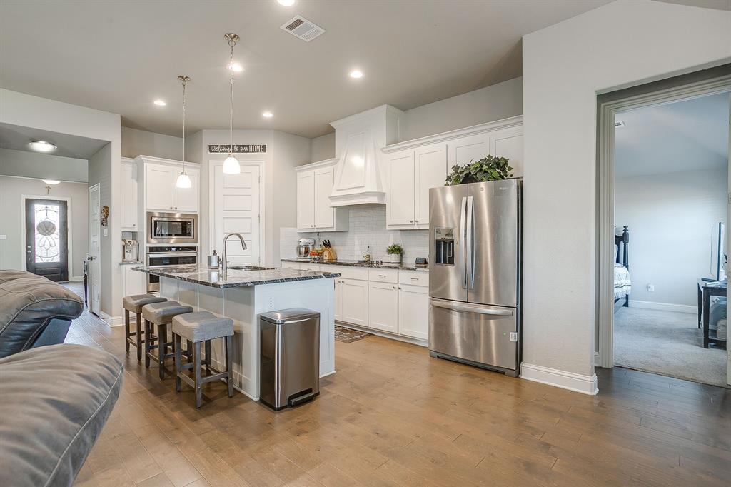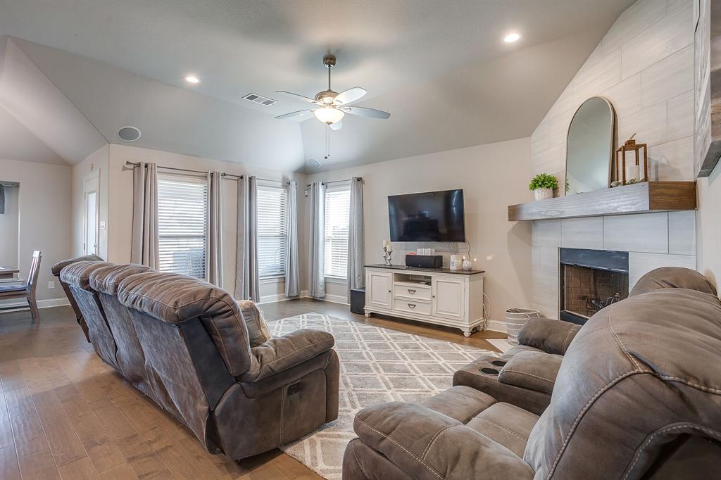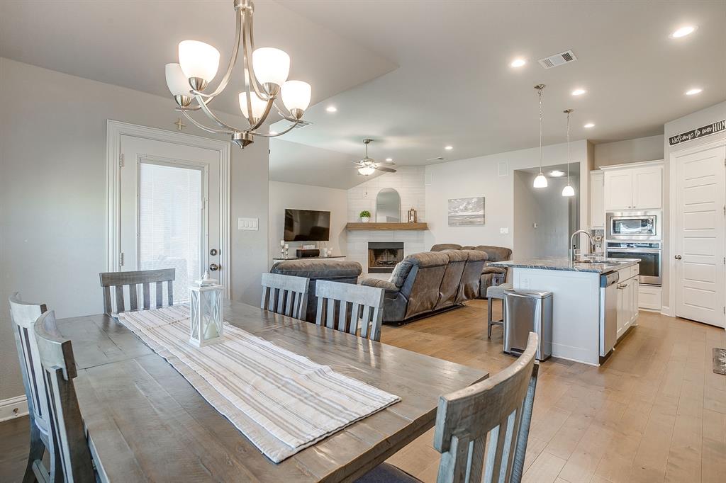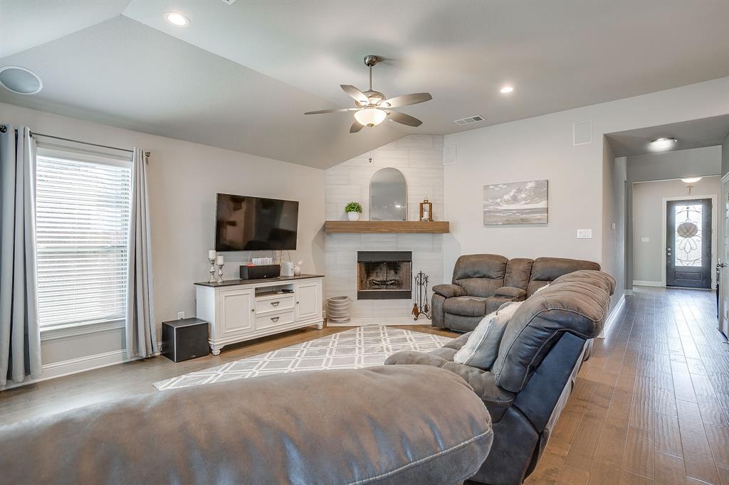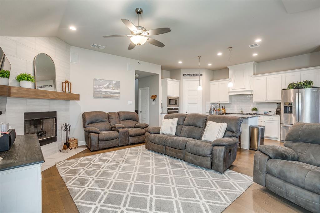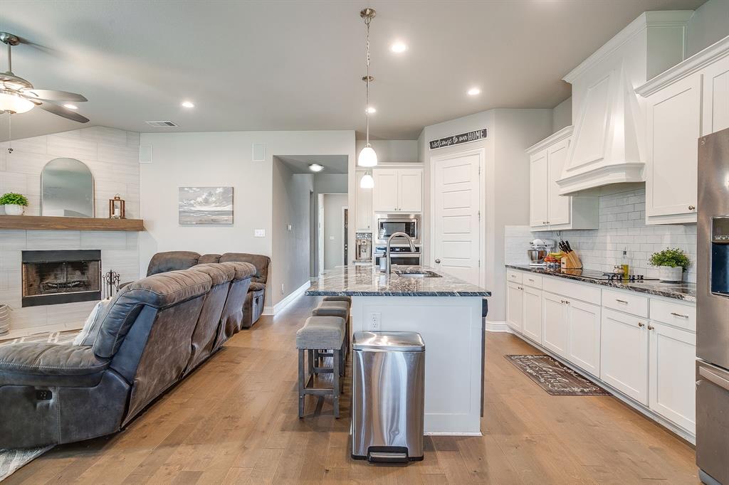 STUNNING KITCHEN ALERT! This beautifully designed 5-bedroom, 3-bathroom two-story home offers a truly thoughtful open-concept layout ideal for modern living and multi-generational households. The expansive living area flows seamlessly into a chef-inspired kitchen, complete with a large center island, walk-in pantry, and sleek stainless steel appliances, ideal for everyday living and effortless entertaining. A cozy fireplace anchors the family room, while oversized windows flood the space with natural light, highlighting the soaring vaulted ceilings and creating a bright, airy ambiance.